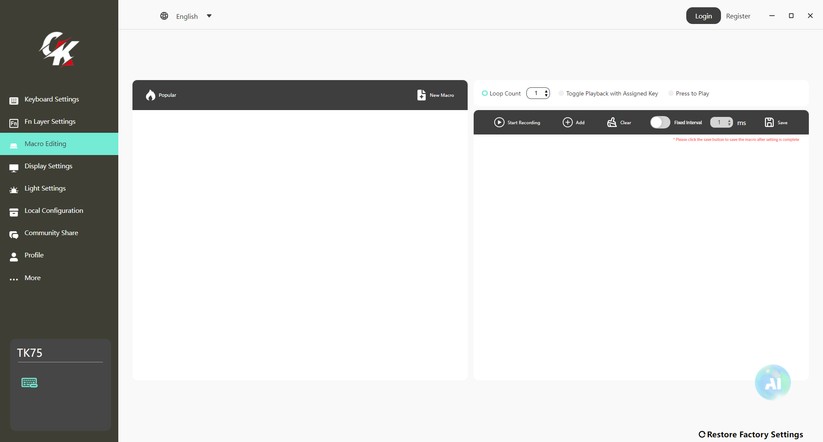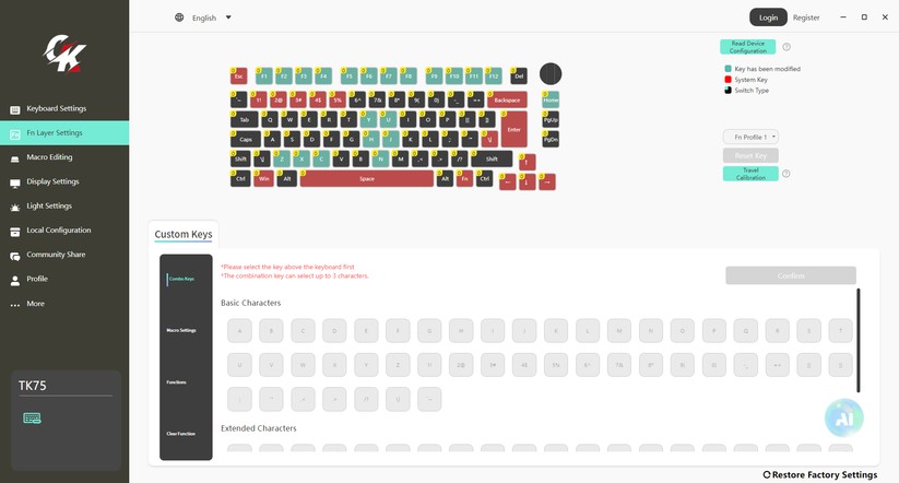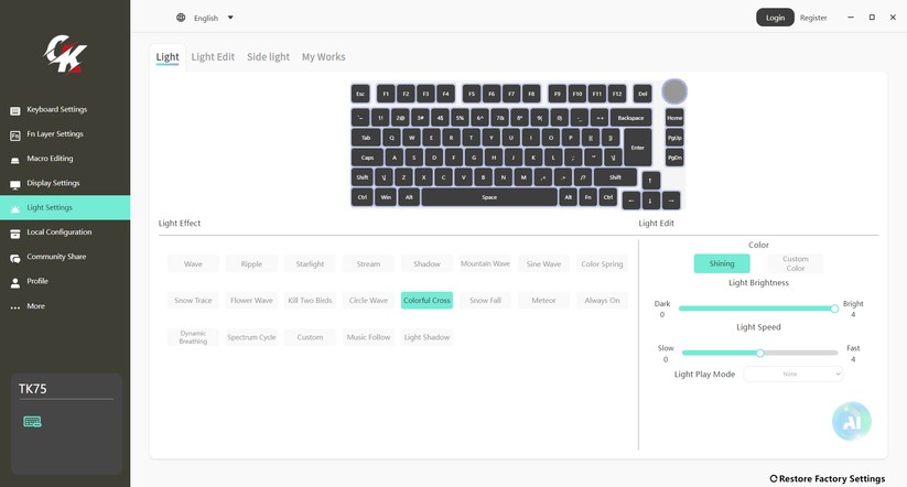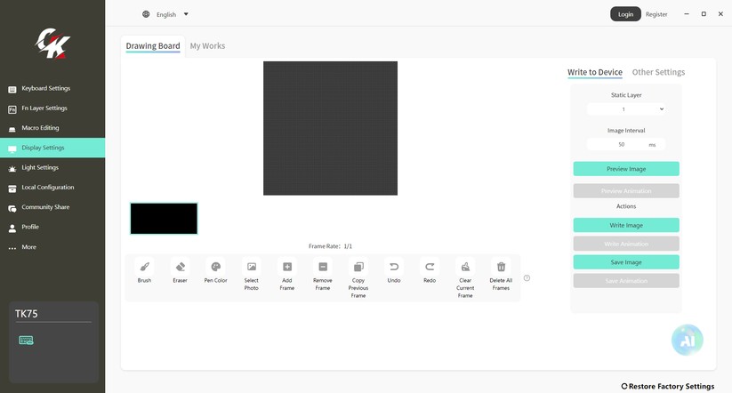 Die Software der Gamakay TK75HE V2 basiert auf der Open-Source-Firmware Quantum Mechanical Keyboard (QMK) und nennt sich Gamakay Driver V4. Über das Programm stellt man gewohnt alles rund um die Tastenbelegung, die Betätigungspunkte, die Beleuchtung und im Falle der TK75HE V2 auch den Bildschirm ein. Die Sprachauswahl der Software beschränkt sich auf Englisch und Chinesisch.