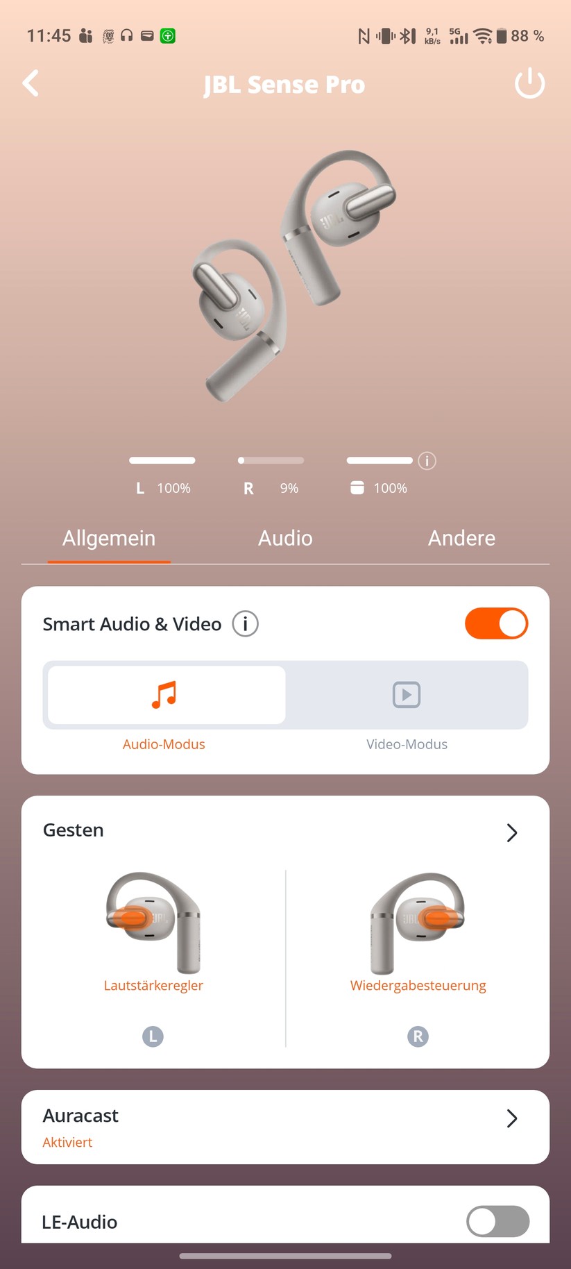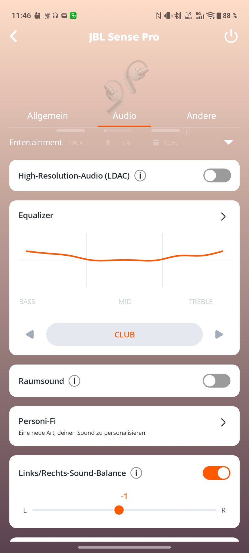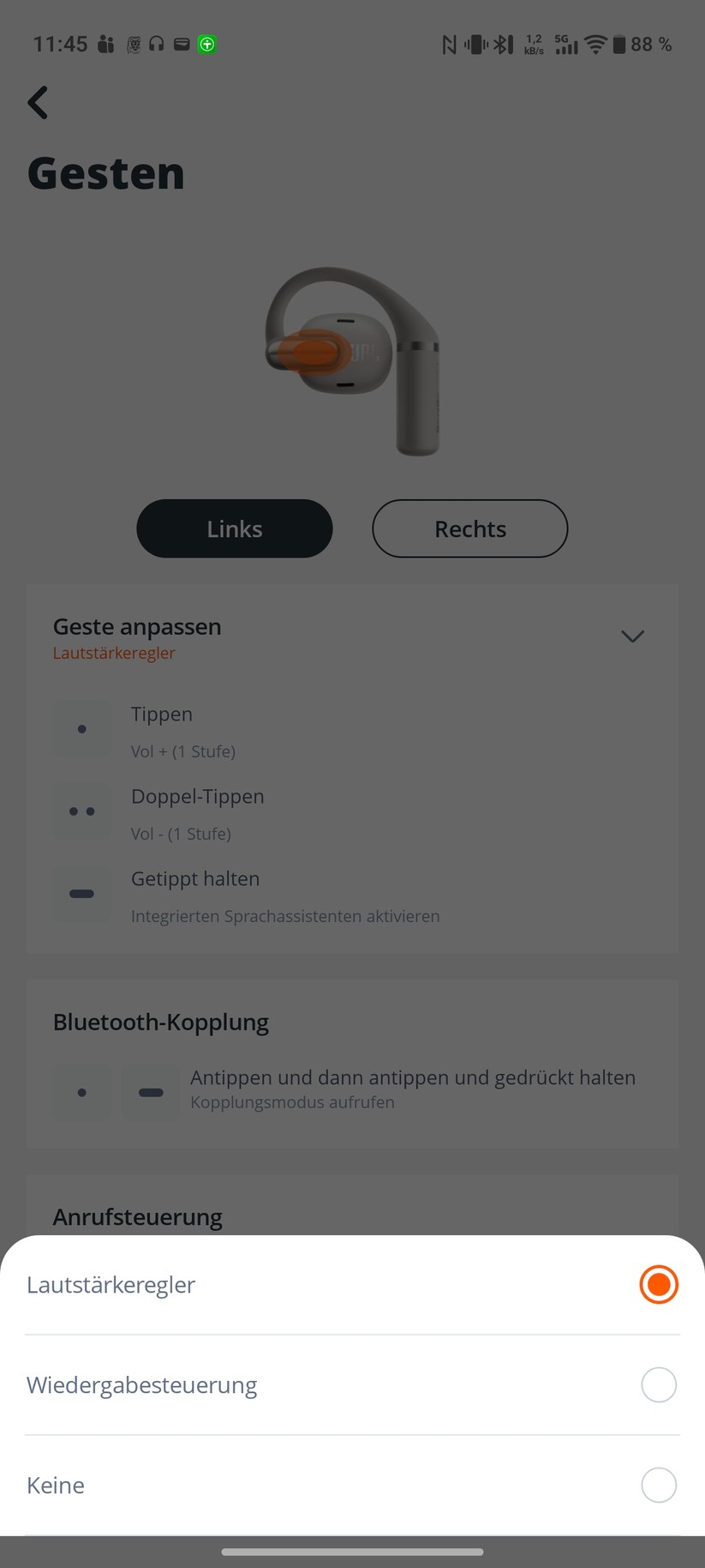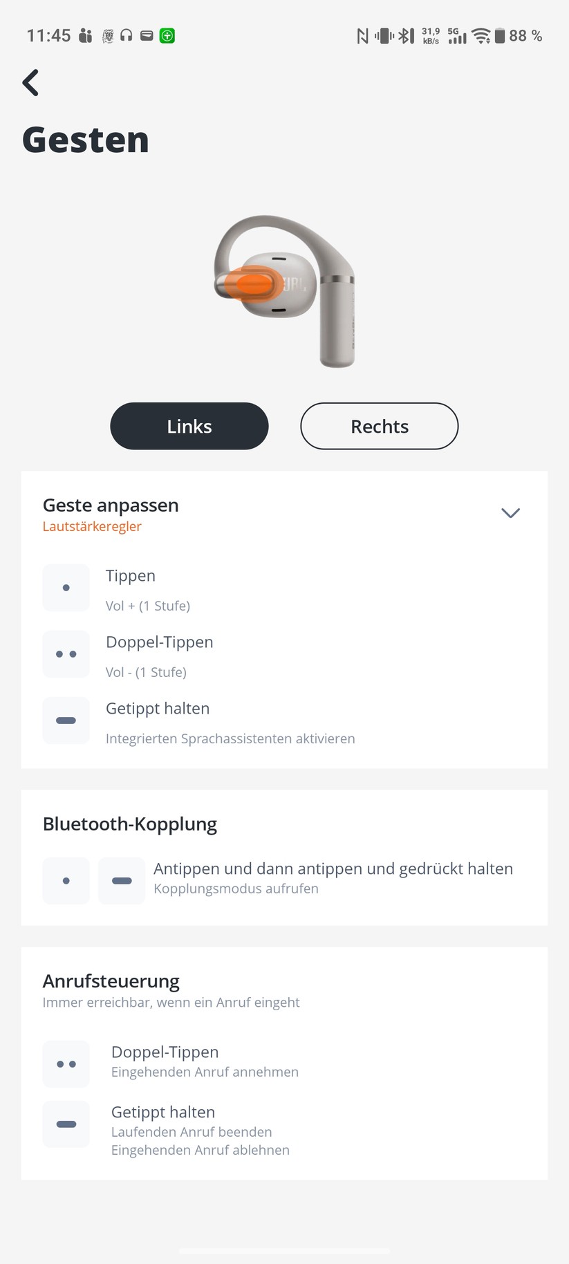 Ärgerlich: Die Touch-Steuerung lässt sich in der App kaum anpassen. Nutzer können lediglich die Funktionsblöcke zwischen links und rechts tauschen oder die Touch-Steuerung komplett deaktivieren. Eine individuelle Belegung fehlt. Auch das Deaktivieren einzelner Gesten – etwa des empfindlichen Einzeltipps – ist nicht möglich.