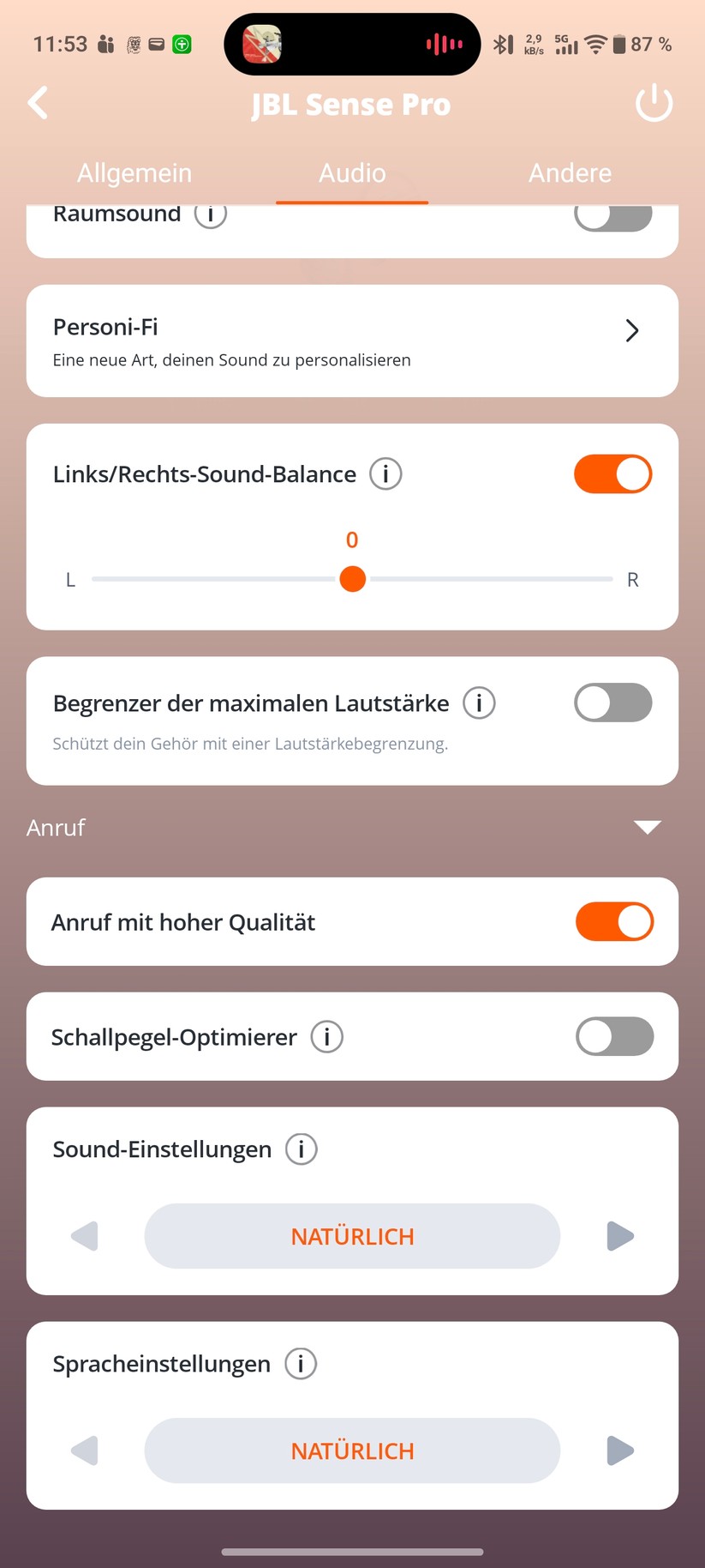 Bei der Anrufqualität überraschen die Sense Pro positiv. Vier Mikrofone und ein zusätzlicher Knochenleitungssensor sorgen für klare Sprachübertragung. Ein KI-Algorithmus filtert Umgebungsgeräusche zuverlässig heraus. Im Test verstand uns das Gegenüber klar und deutlich. Die Huawei Freearc sind zwar noch einen Tick besser zum Telefonieren, aber die JBL gehören definitiv zur Spitzengruppe.