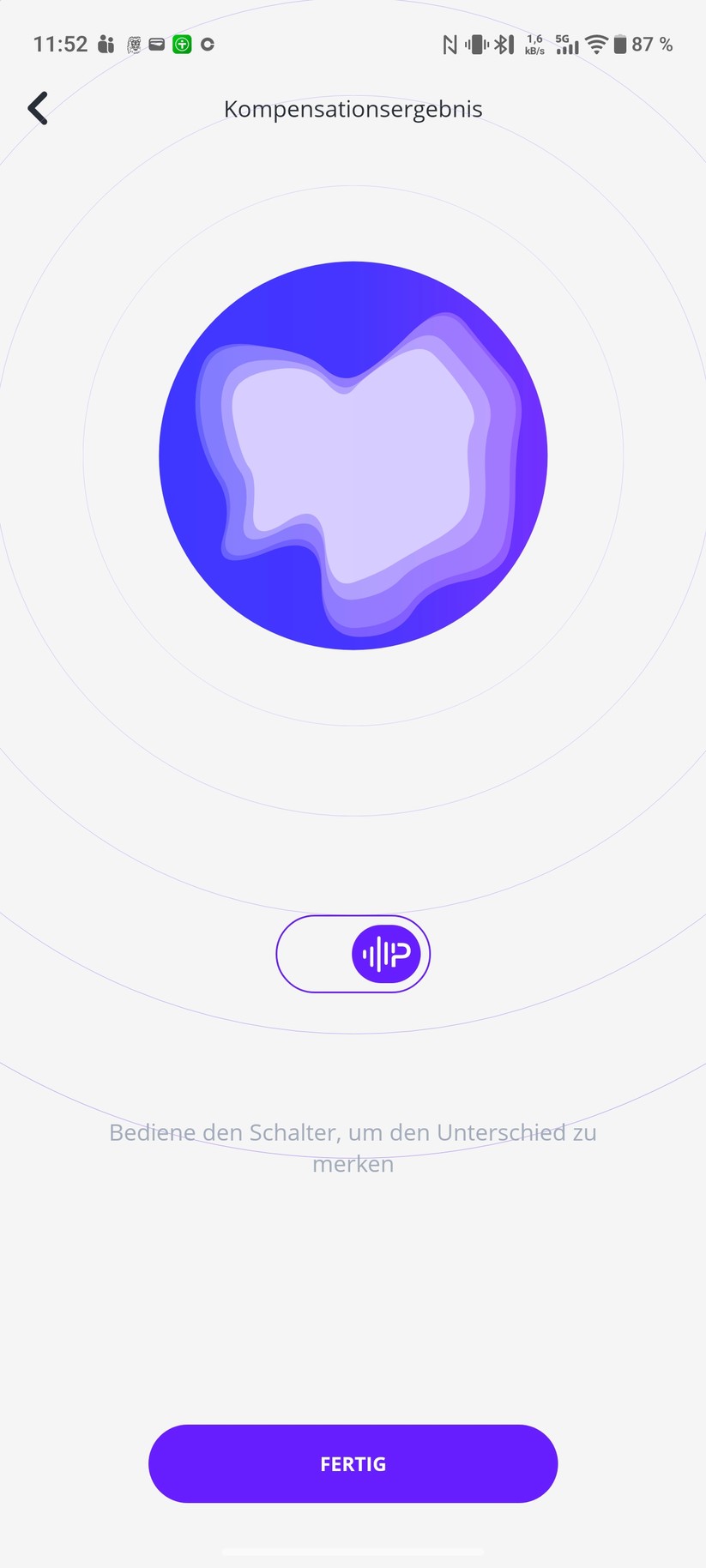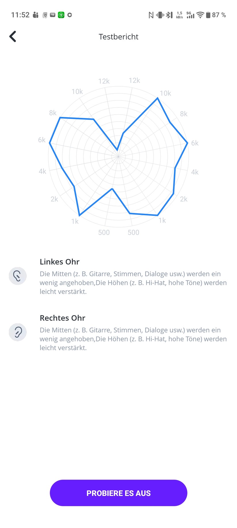 Ein zweiminütiger Hörtest erstellt auf Wunsch ein individuelles Klangprofil für beide Ohren. Die App passt den Klang dann frequenziell an die persönlichen Hörfähigkeiten an. Das funktioniert besonders gut bei asymmetrischen Hörverlusten – etwa wenn ein Ohr hohe Frequenzen schlechter wahrnimmt als das andere. Der Unterschied ist hörbar: Musik klingt nach der Kalibrierung ausgewogener und detaillierter.