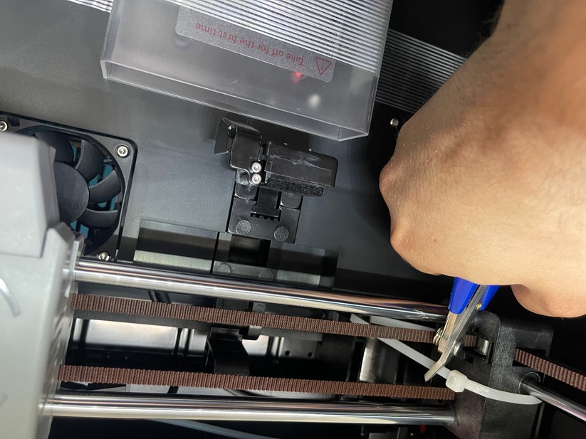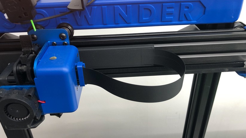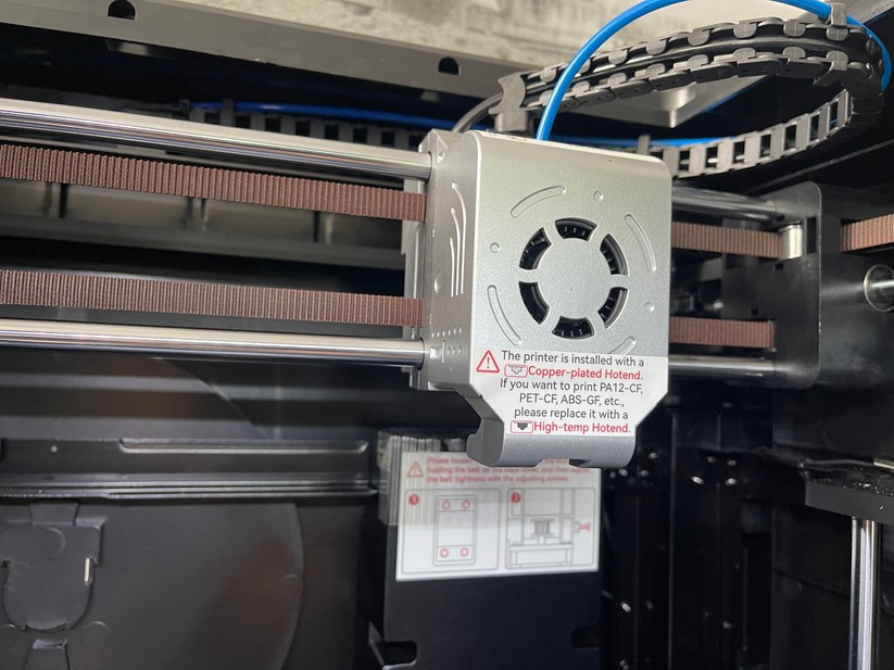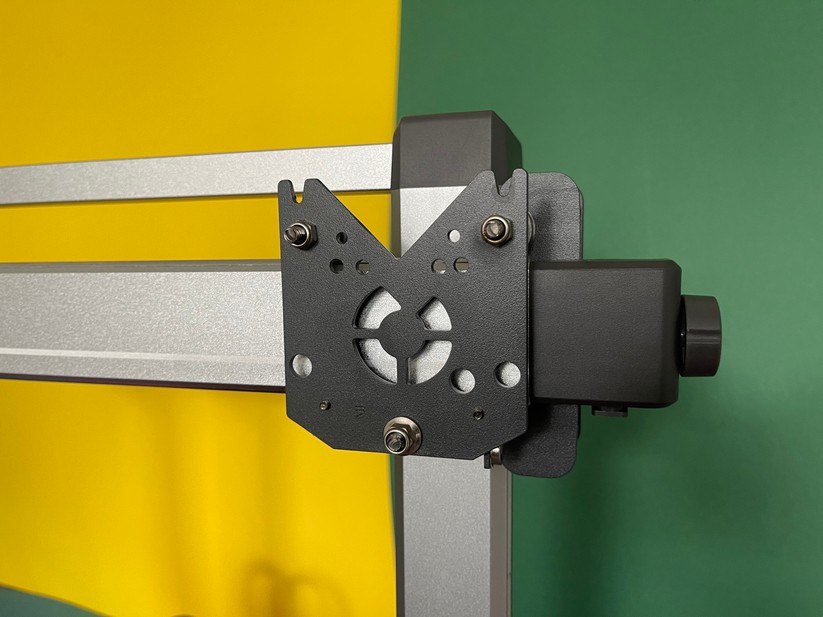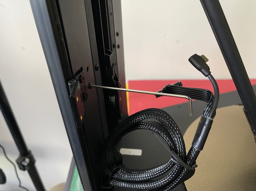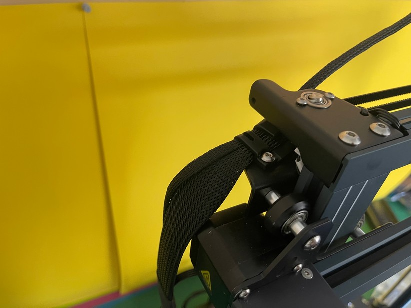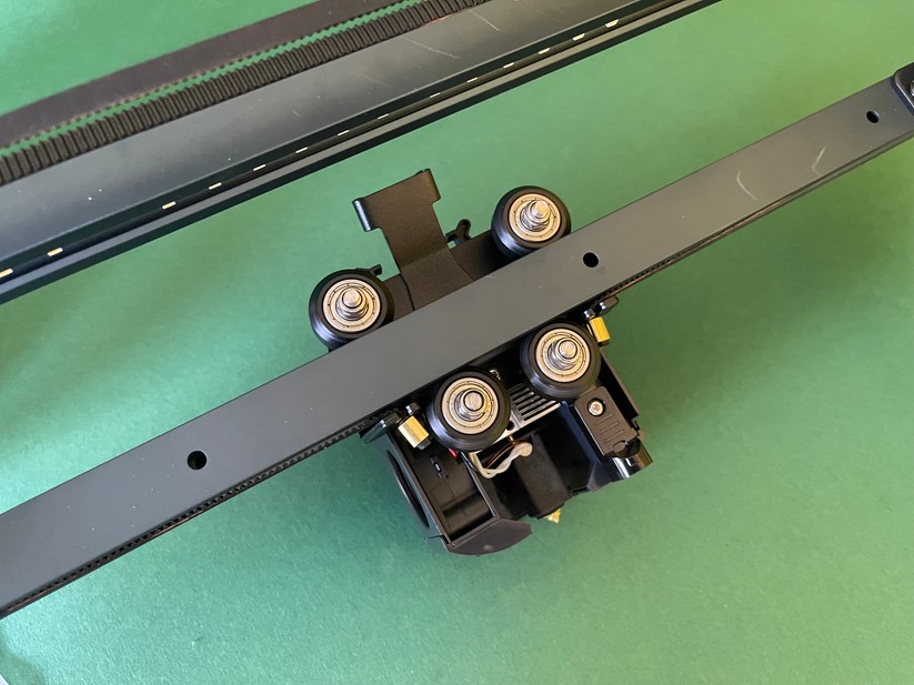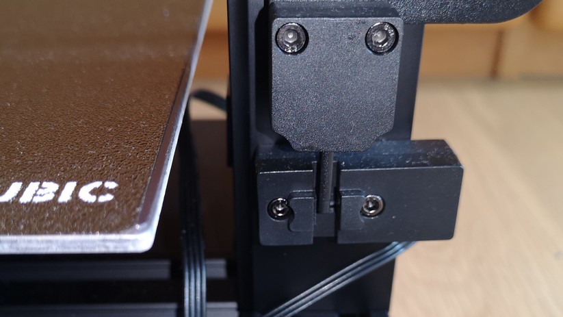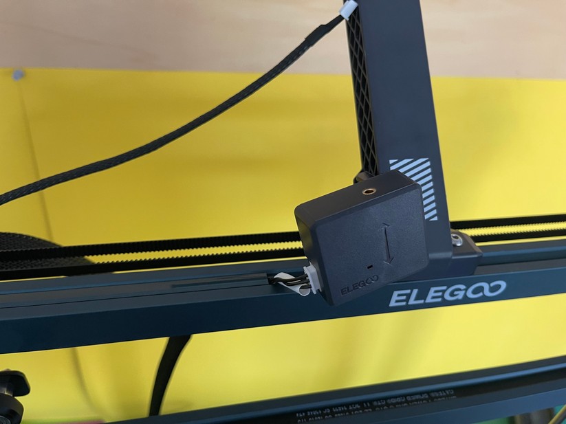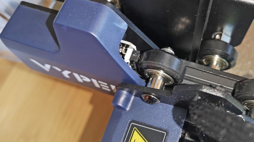 Die Antriebsriemen der X- und Y-Achse sind mit einem automatischen Spannsystem ausgestattet und sollten somit wartungsfrei sein. Die Halterungen der Spanner wirken allerdings nicht so viel stabiler als der Filamentrollenhalter. Vermutlich deswegen sind unsere Druckergebnisse auch nicht ganz so präzise wie beim Bambulab A1 Mini (Testbericht), aber dazu später mehr.