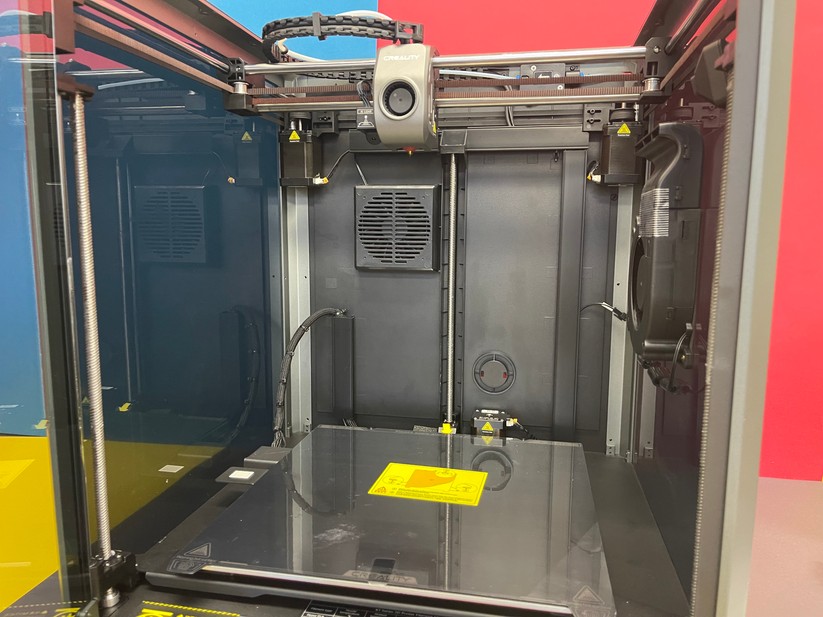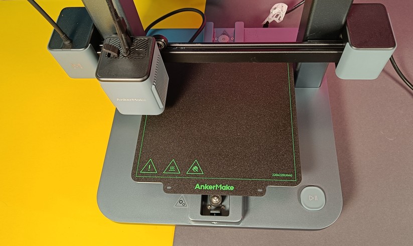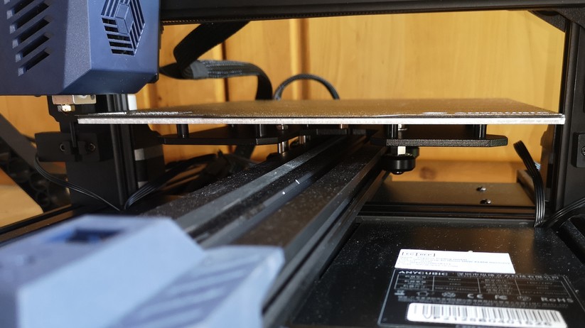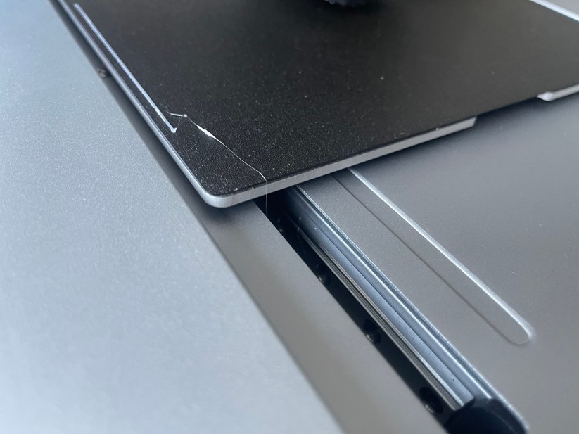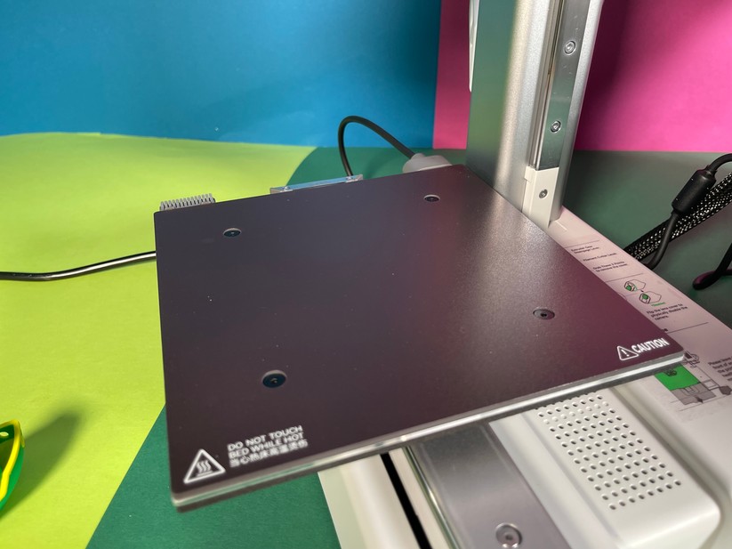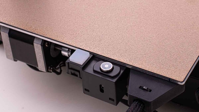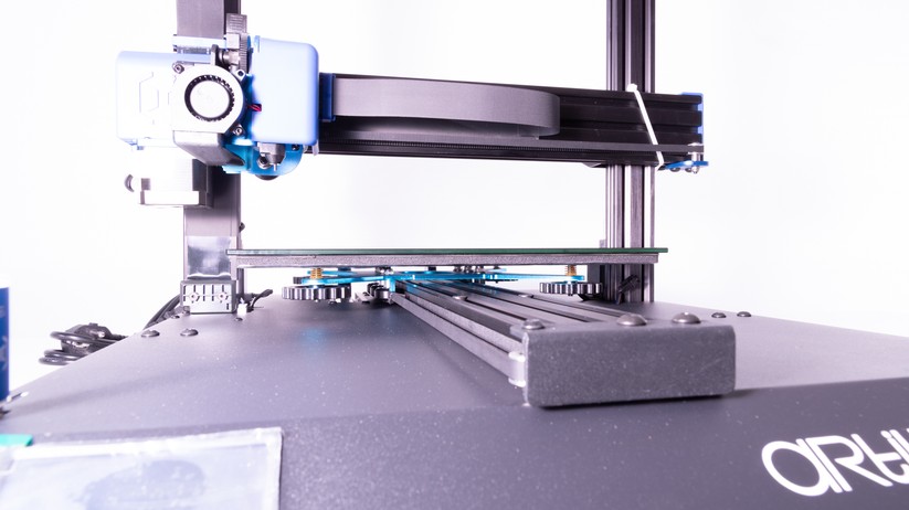 Der Drucker selbst ist nach dem XY-Core-Prinzip aufgebaut. Das Druckbett fährt also an der Z-Achse hoch und runter, der Druckkopf übernimmt die X- und Y-Achse und bewegt sich vor, zurück und seitlich. Das goldene PEI-Druckbett wird hinten so eingefasst, dass man es problemlos mittig aufsetzen kann und hält magnetisch.