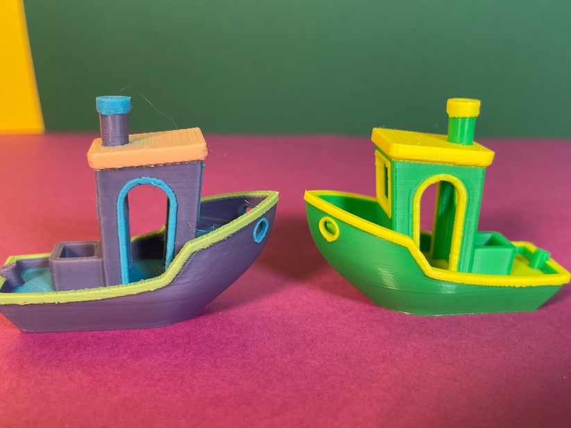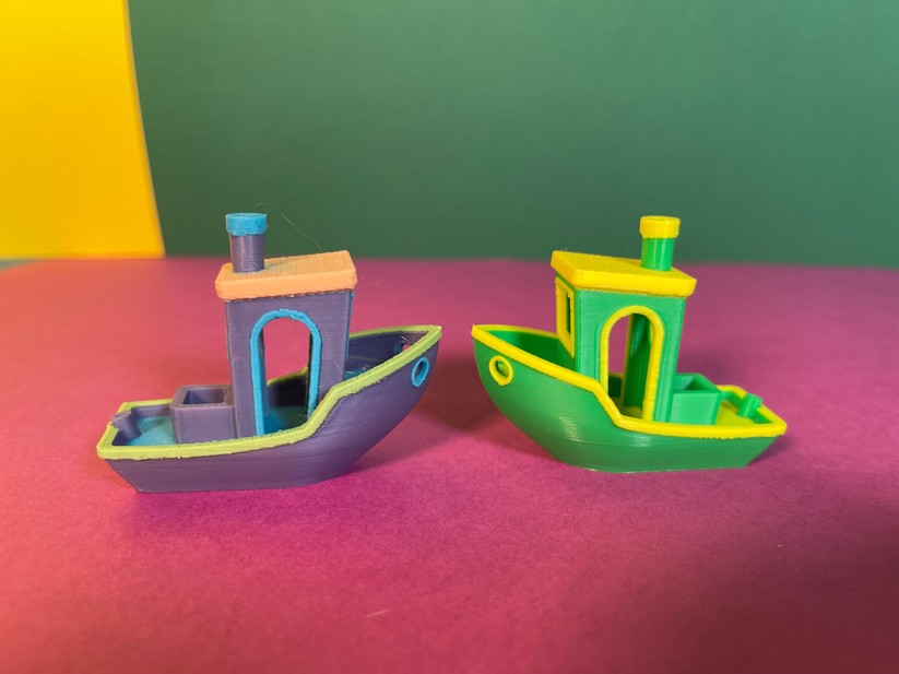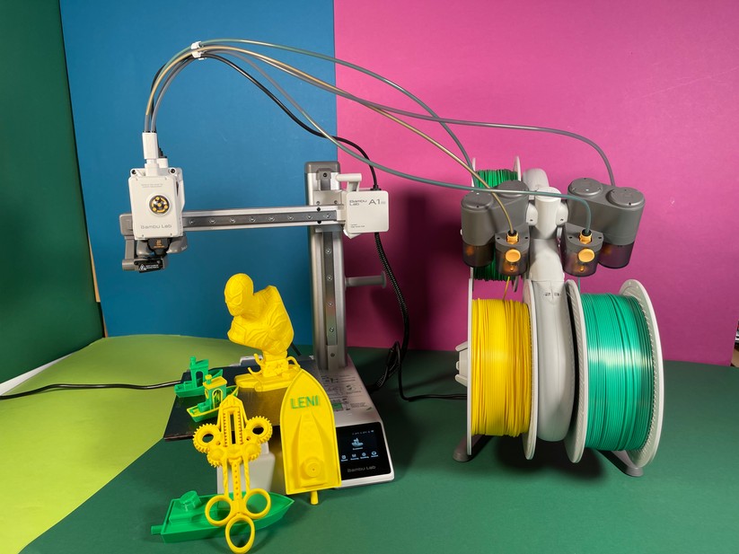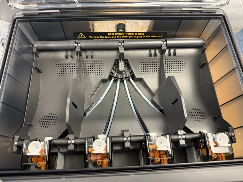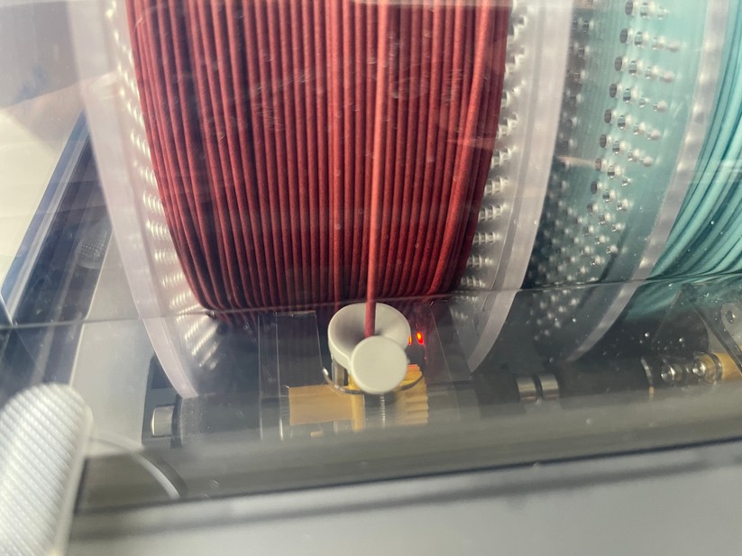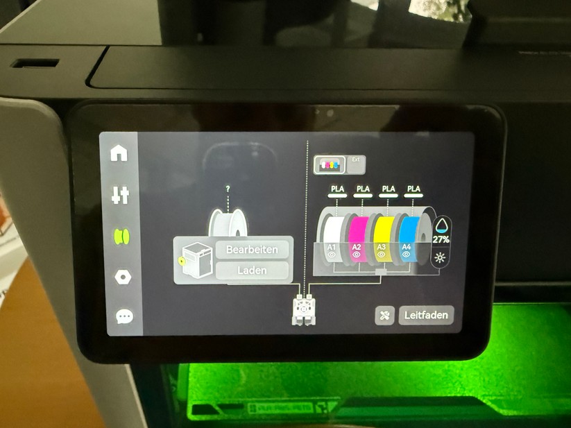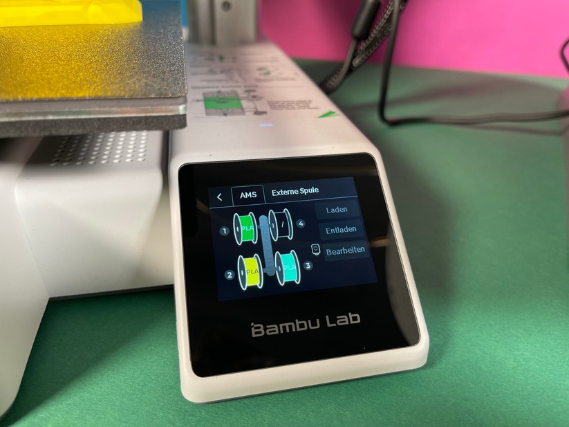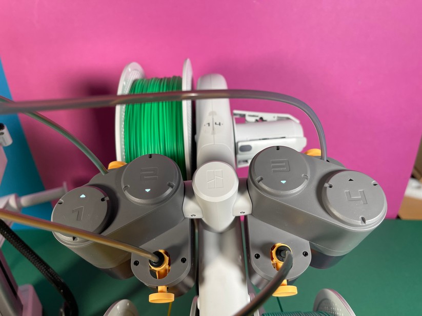 Immer mehr Drucker in dieser Bestenliste sind in der Lage, mehrfarbig zu drucken. Alle Geräte setzen dabei auf einen Materialwechsler, bei dem in der Regel vier Filamentrollen in einem Kasten auf dem Drucker vorgehalten werden. Das gerade benötigte Filament wird eingezogen, die Düse mit neuem Filament durchgespült und die Reste ausgeworfen. Das dauert und kostet, je nach druckendem Modell, teils extrem viel Filament. Der Bambu Lab H2D hat zwei Druckköpfe, die er durchwechselt, der Snapmaker U1 hat gleich vier. Das spart die Spülvorgänge.