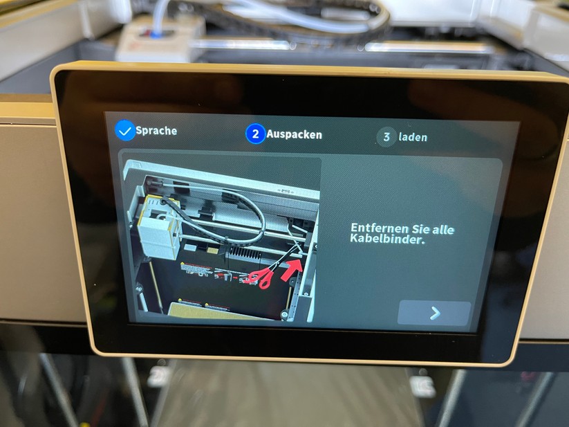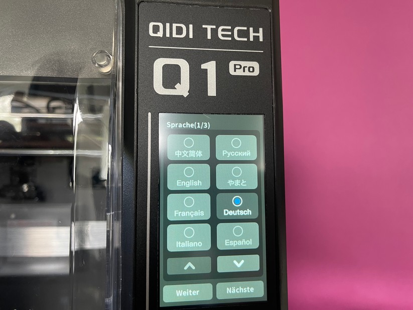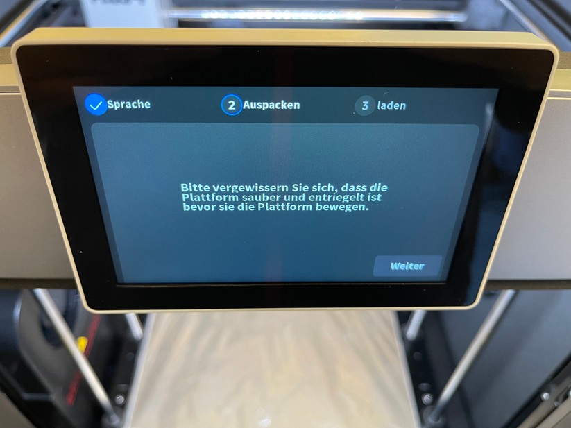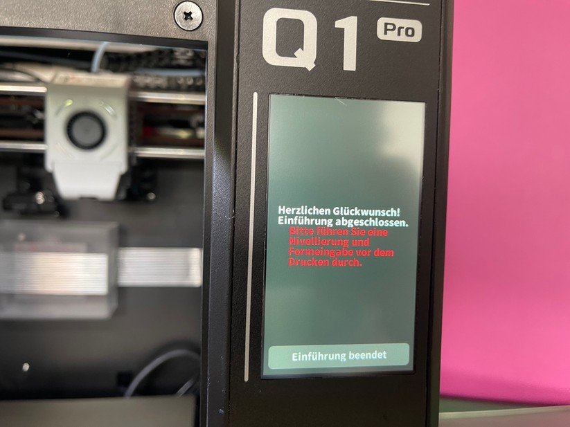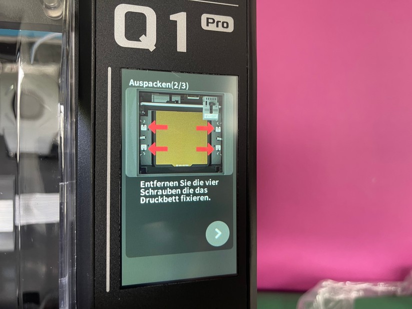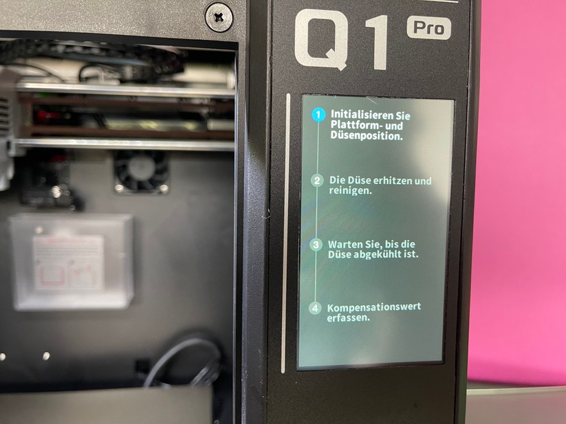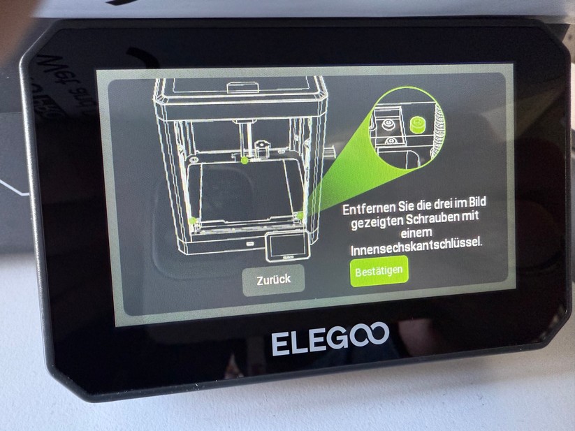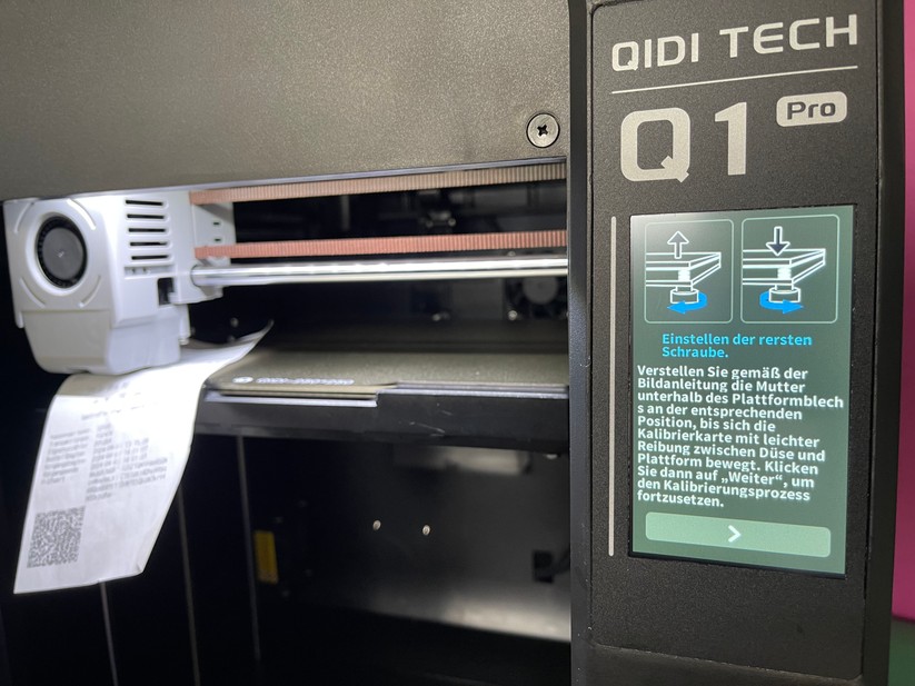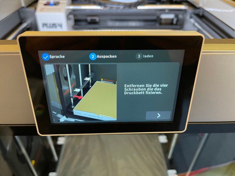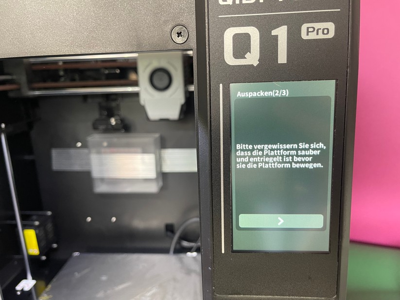 Typisch Qidi: Es gibt eine gedruckte Schnellstart-Anleitung, die den Anwender in wenigen Schritten dabei unterstützt, den Q1 Pro zum Laufen zu bekommen. Sobald er Strom hat, geht der weitere Aufbau über eine geführte Anleitung auf dem resistiven Touchscreen-Display weiter. Animationen, Bilder und Grafiken zeigen, wo man die Schrauben der Transportsicherung lösen muss und was noch zu tun ist – klasse!