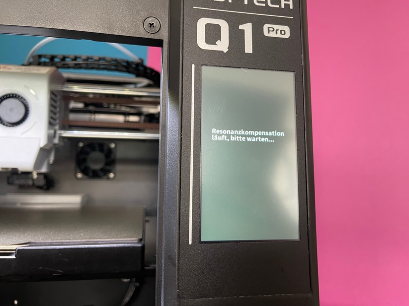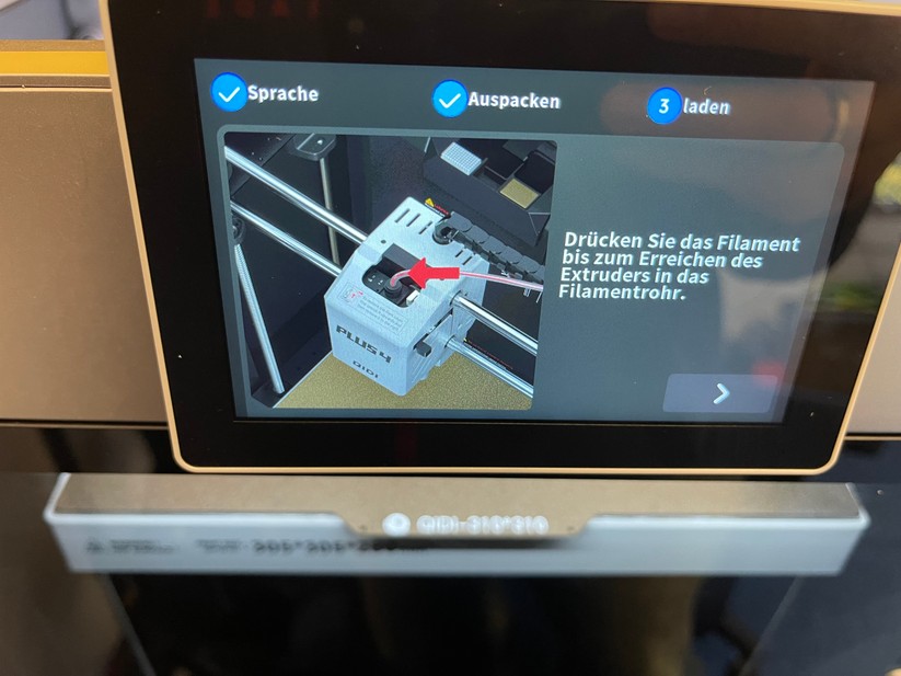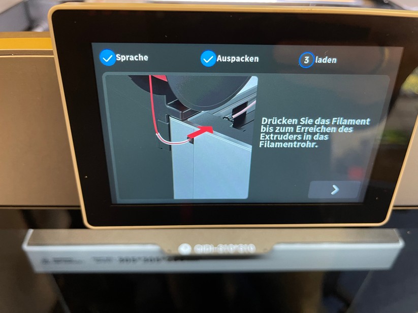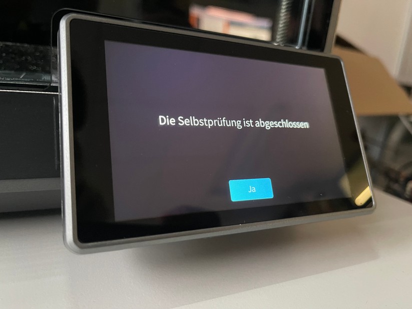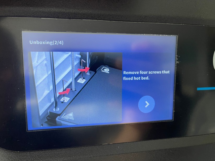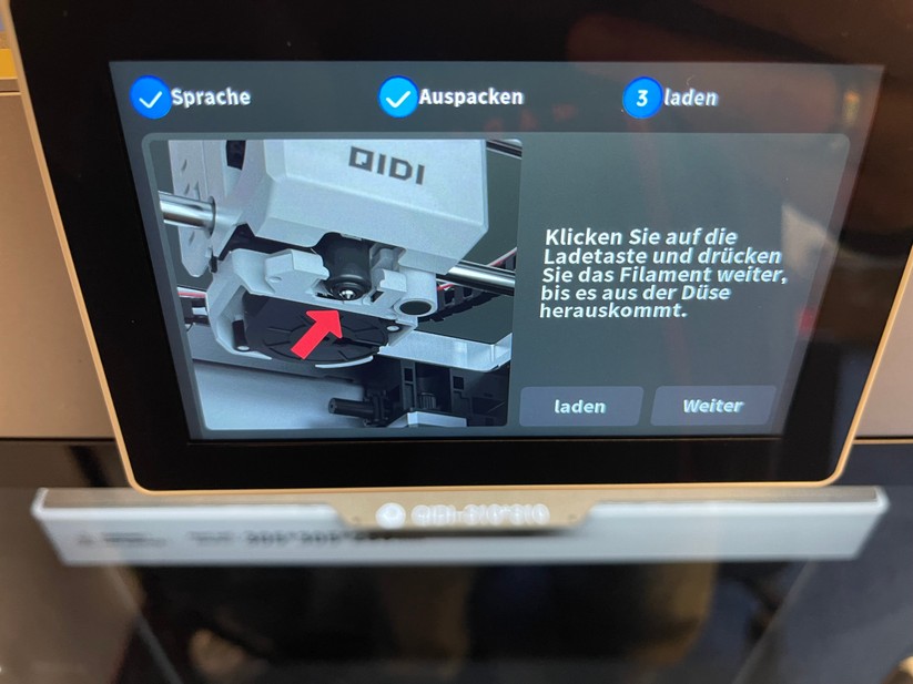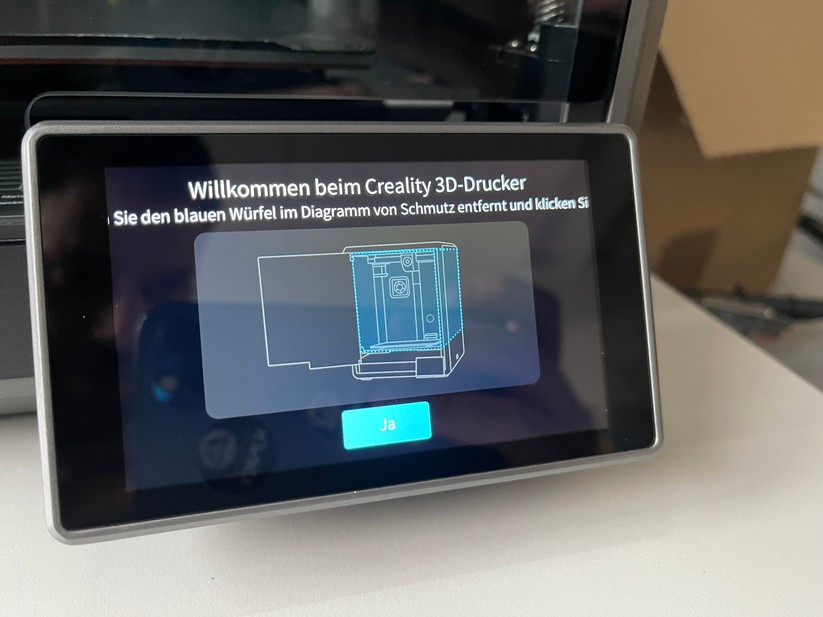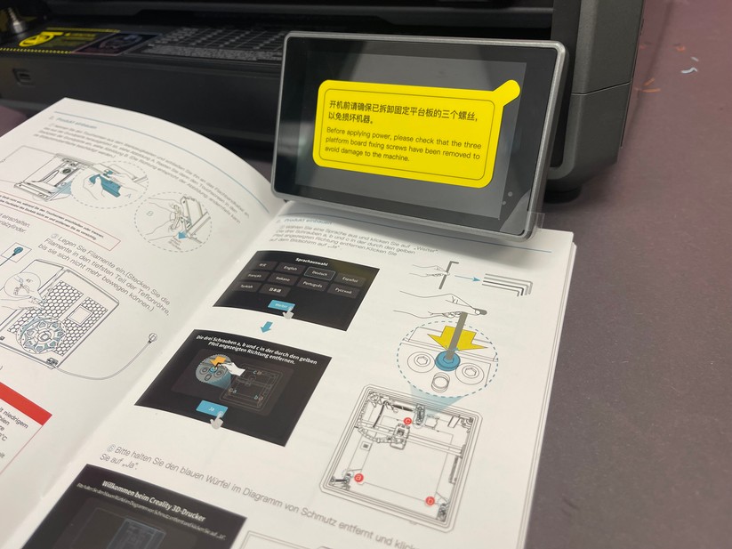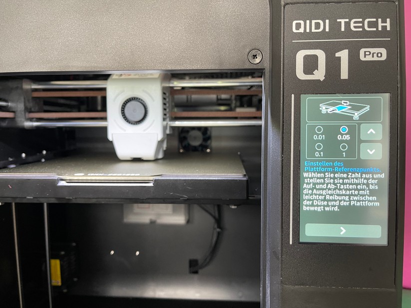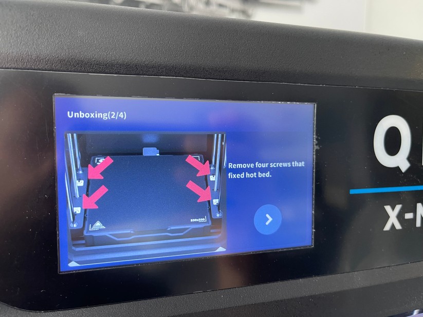 Typisch Qidi: Es gibt eine gedruckte Schnellstart-Anleitung, die den Anwender in wenigen Schritten dabei unterstützt, den Q1 Pro zum Laufen zu bekommen. Sobald er Strom hat, geht der weitere Aufbau über eine geführte Anleitung auf dem resistiven Touchscreen-Display weiter. Animationen, Bilder und Grafiken zeigen, wo man die Schrauben der Transportsicherung lösen muss und was noch zu tun ist – klasse!
