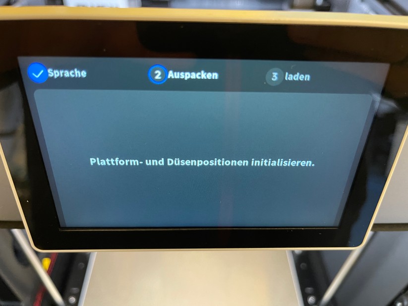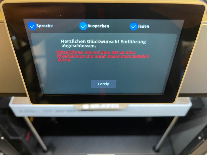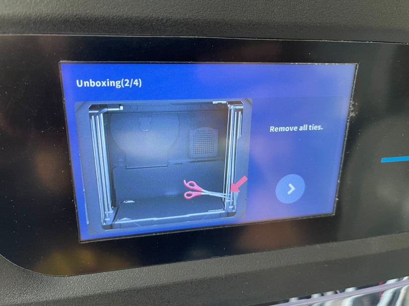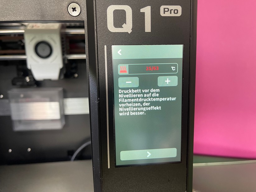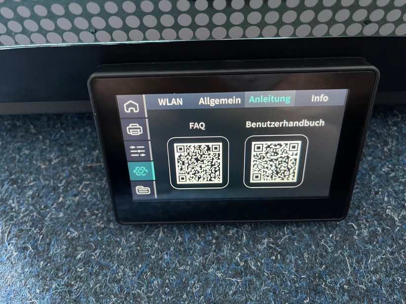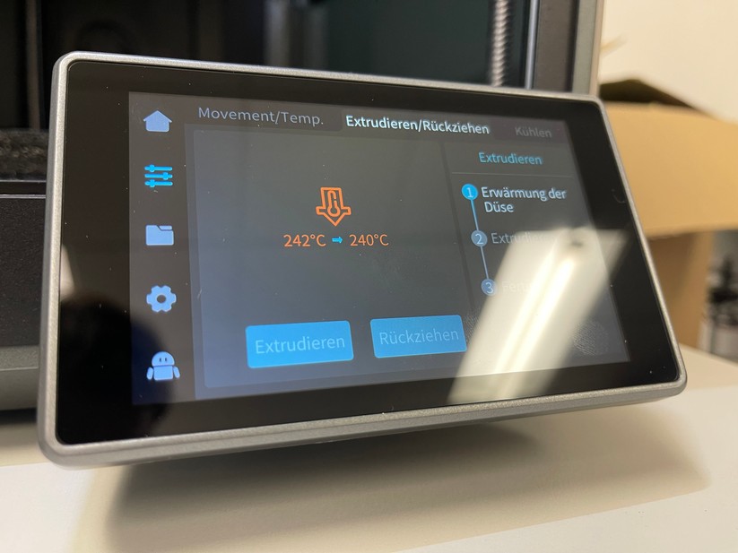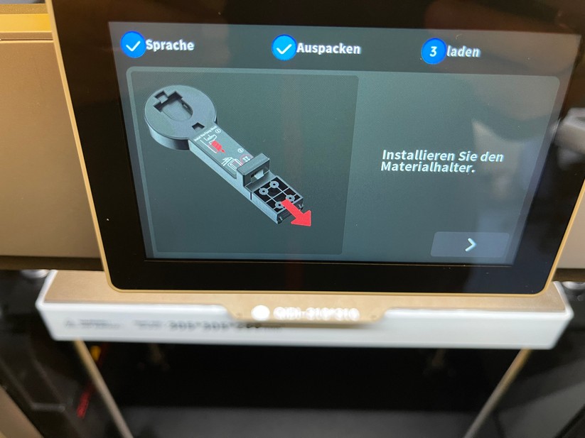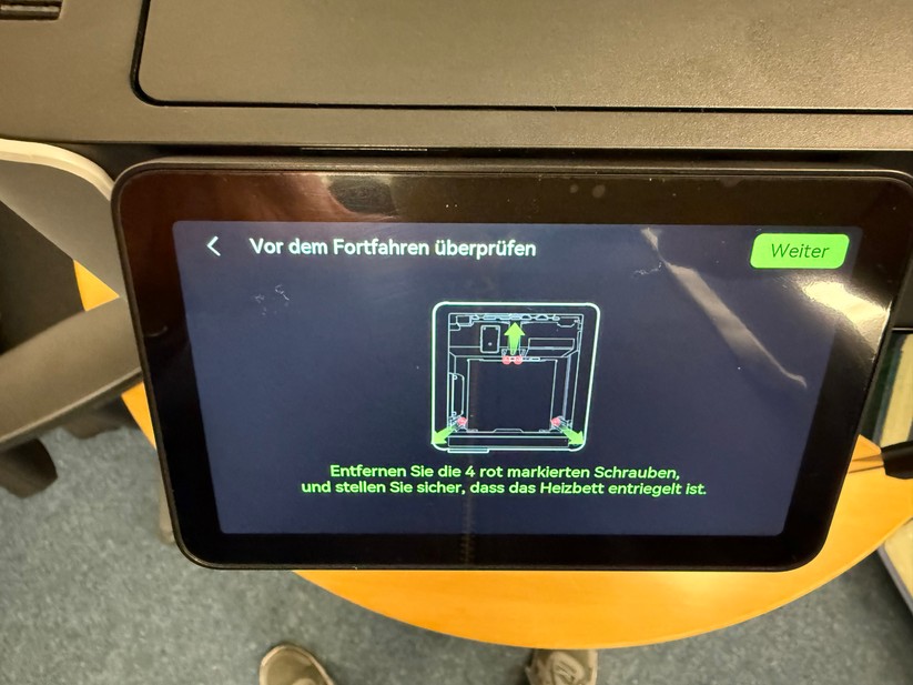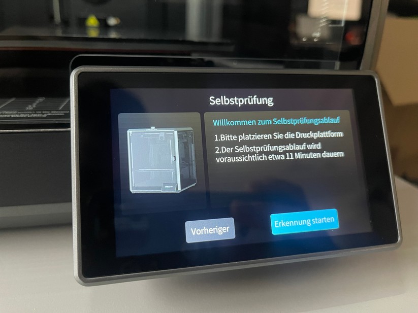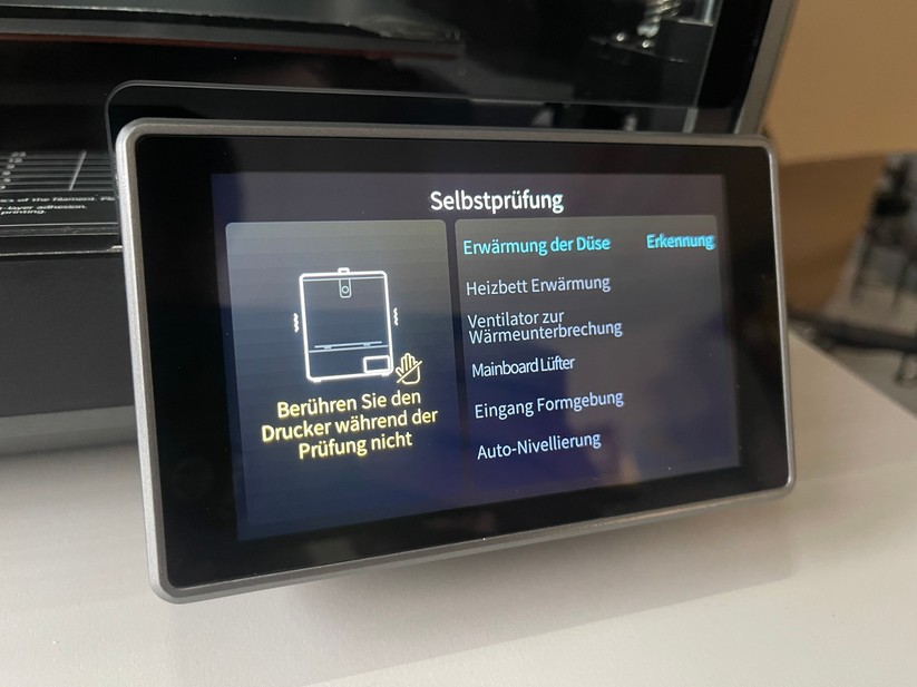 Typisch Qidi: Es gibt eine gedruckte Schnellstart-Anleitung, die den Anwender in wenigen Schritten dabei unterstützt, den Q1 Pro zum Laufen zu bekommen. Sobald er Strom hat, geht der weitere Aufbau über eine geführte Anleitung auf dem resistiven Touchscreen-Display weiter. Animationen, Bilder und Grafiken zeigen, wo man die Schrauben der Transportsicherung lösen muss und was noch zu tun ist – klasse!