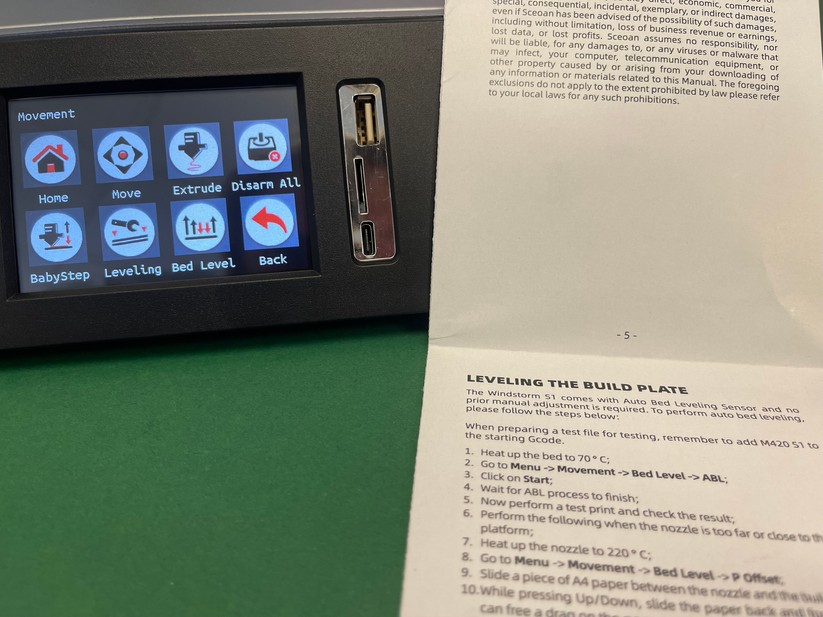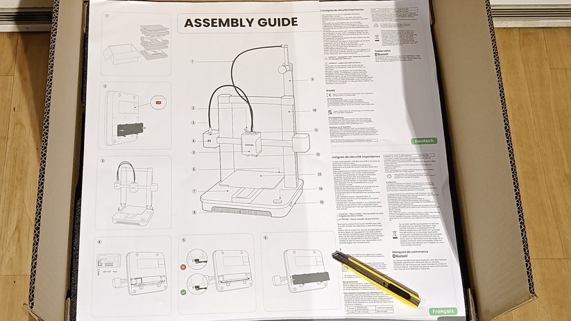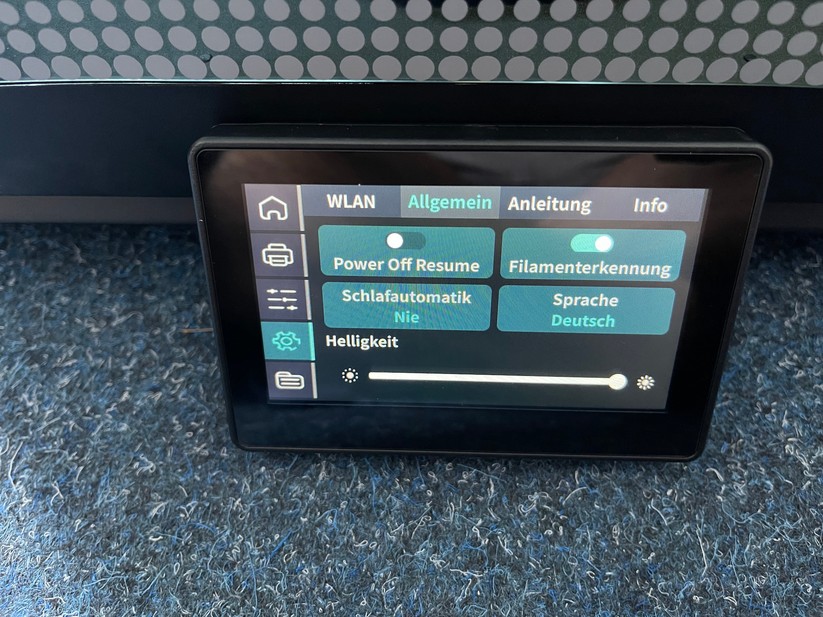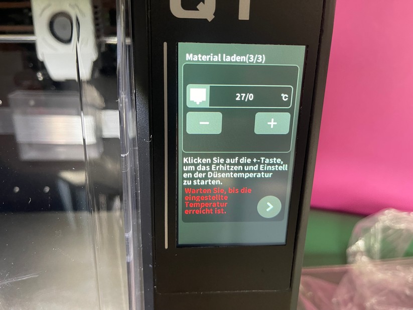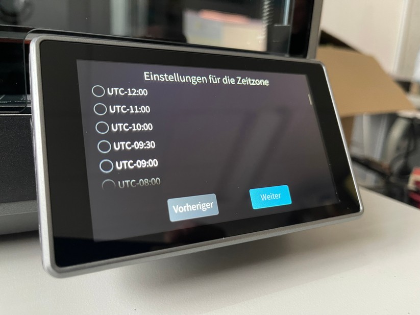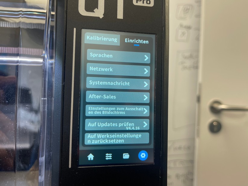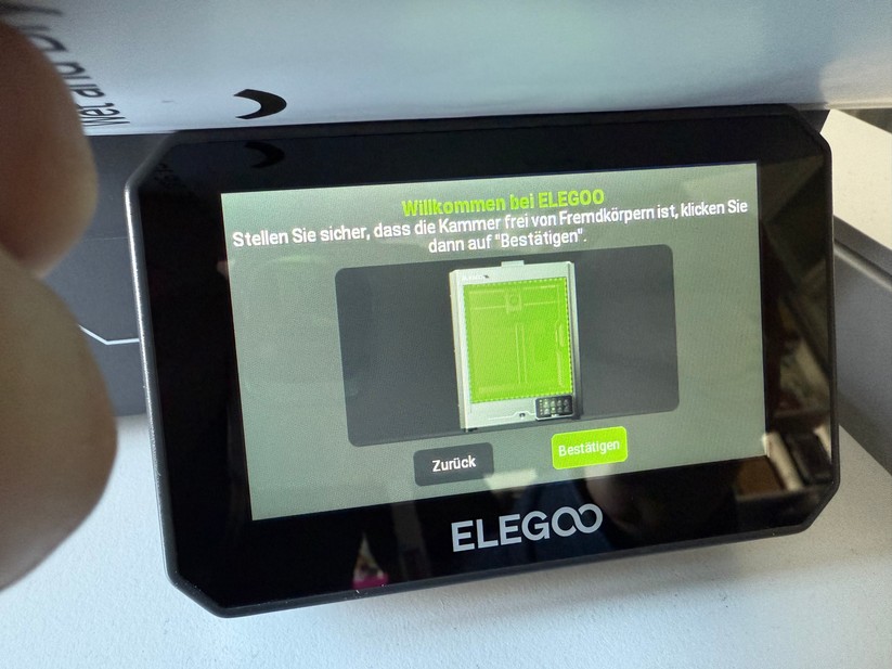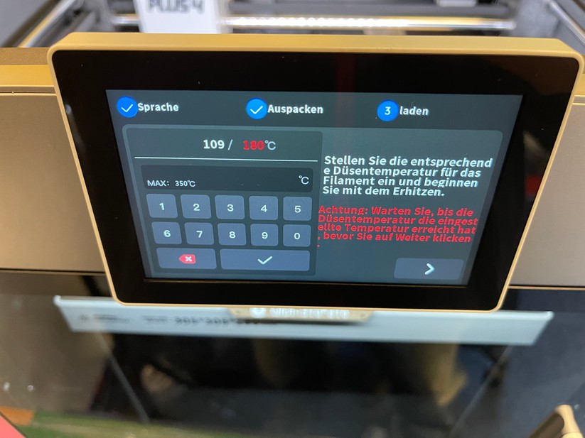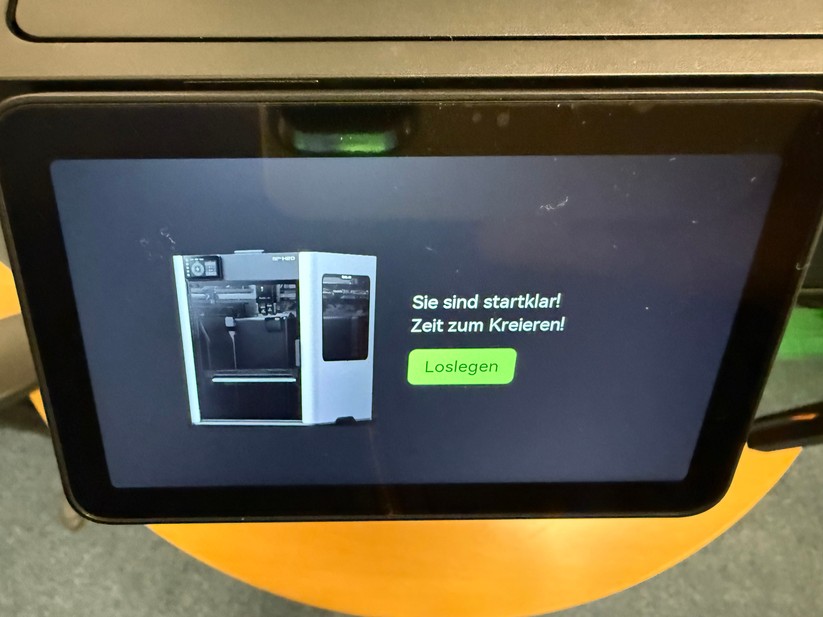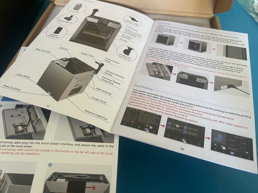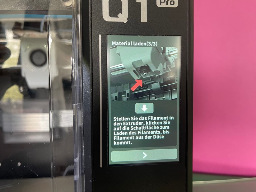 Typisch Qidi: Es gibt eine gedruckte Schnellstart-Anleitung, die den Anwender in wenigen Schritten dabei unterstützt, den Q1 Pro zum Laufen zu bekommen. Sobald er Strom hat, geht der weitere Aufbau über eine geführte Anleitung auf dem resistiven Touchscreen-Display weiter. Animationen, Bilder und Grafiken zeigen, wo man die Schrauben der Transportsicherung lösen muss und was noch zu tun ist – klasse!