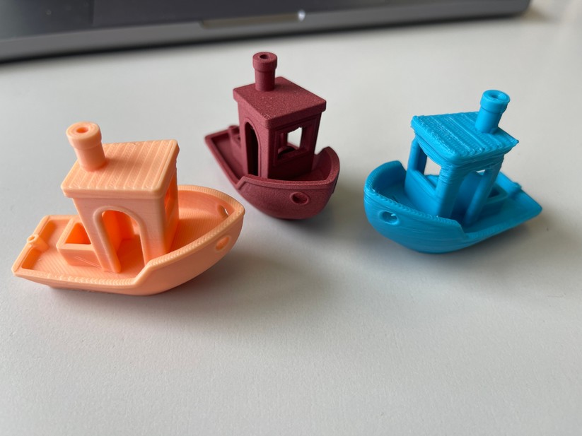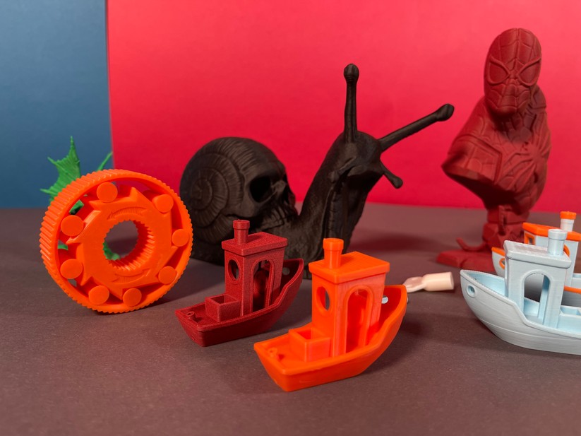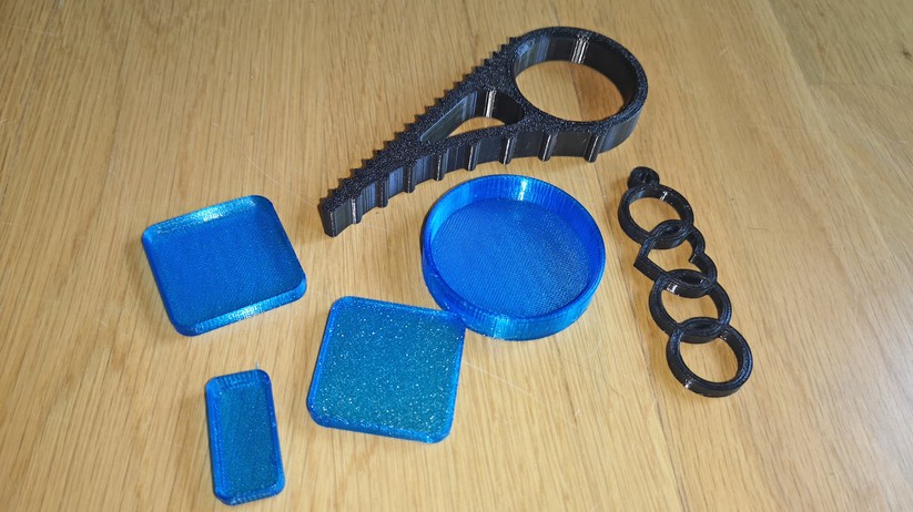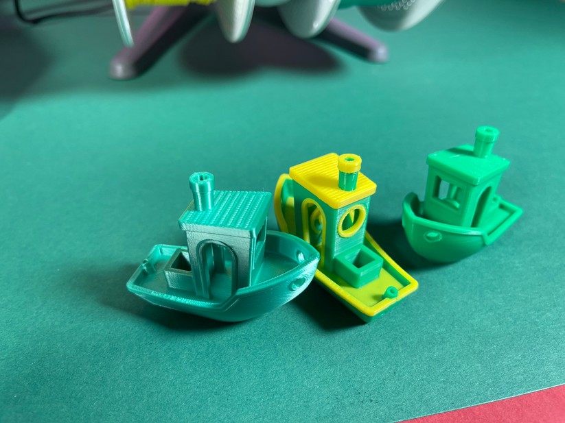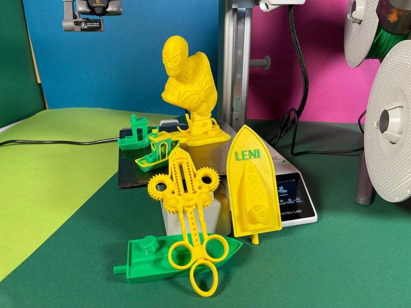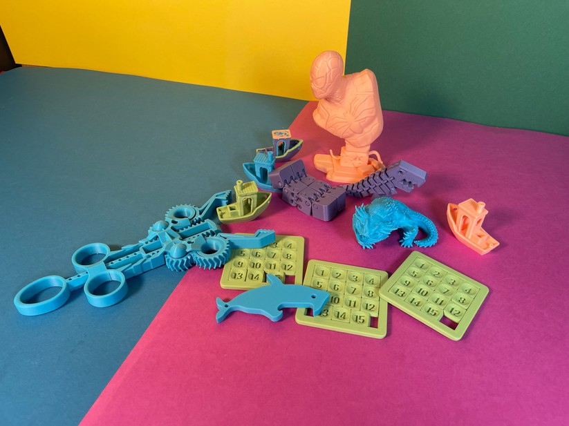 Testdrucke mit dem Mingda Magician Pro: PLA+ grün, PETG schwarz, ABS gelb, TPU orange, PCTG blau heise bestenlisten