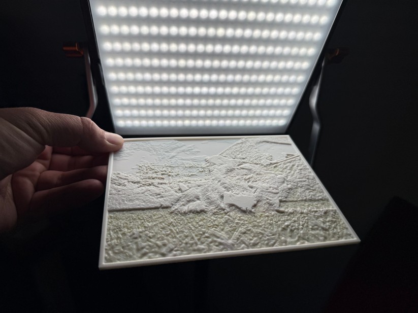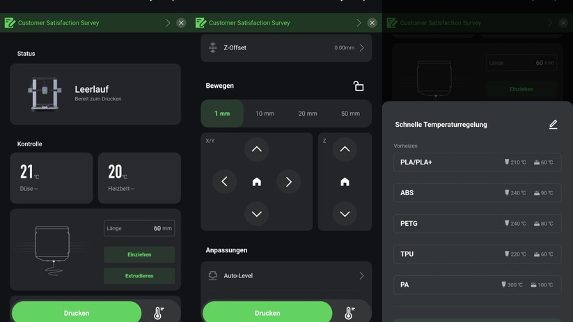 Das automatischen Leveln, also das Anpassen von Abstand zwischen Druckkopf und Druckbett, nennt der Hersteller hier Leviq 2.0. Konkret tastet dabei ein Näherungssensor an 25 Stellen das Druckbett ab. Daraus erstellt die Software ein Höhenprofil. Beim Drucken gleicht die Software dann automatisch die Höhe des Druckkopfs an die Unebenheiten des Druckbetts an.