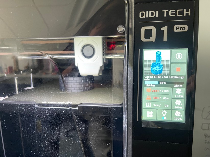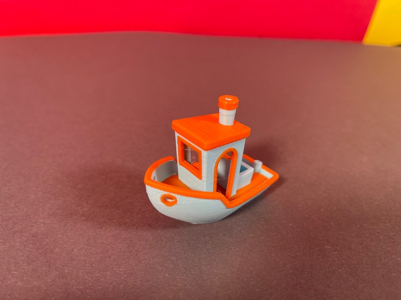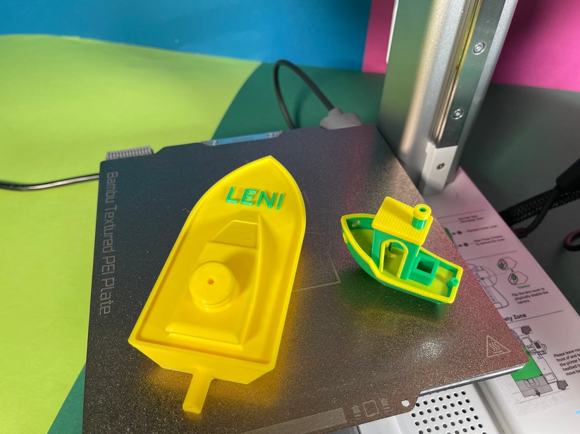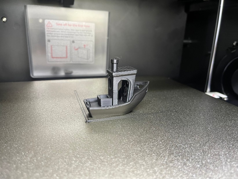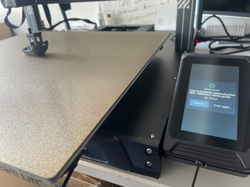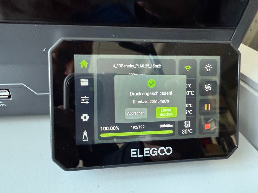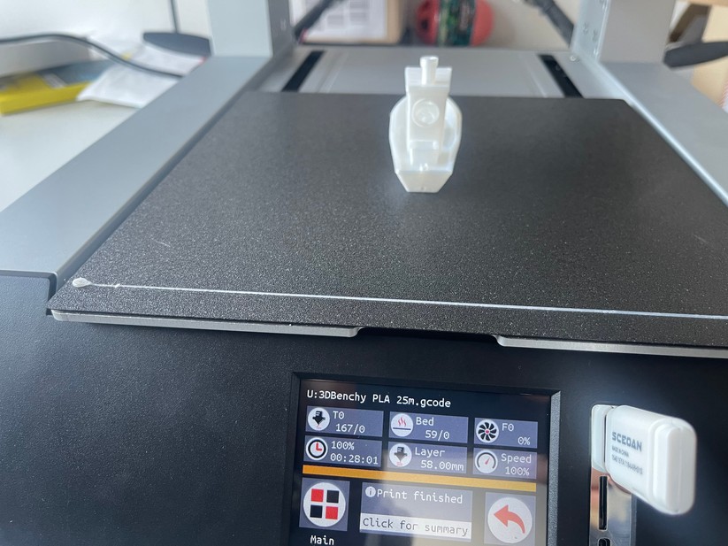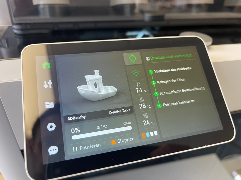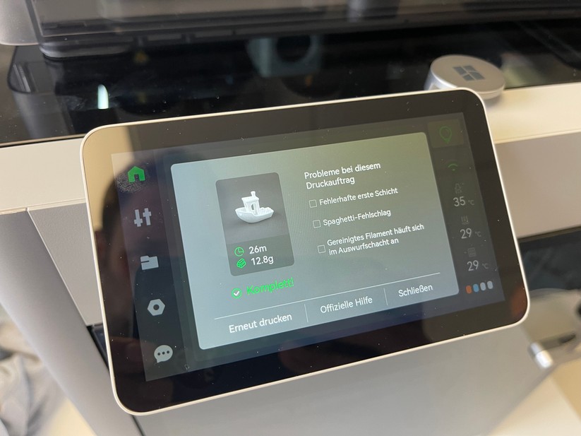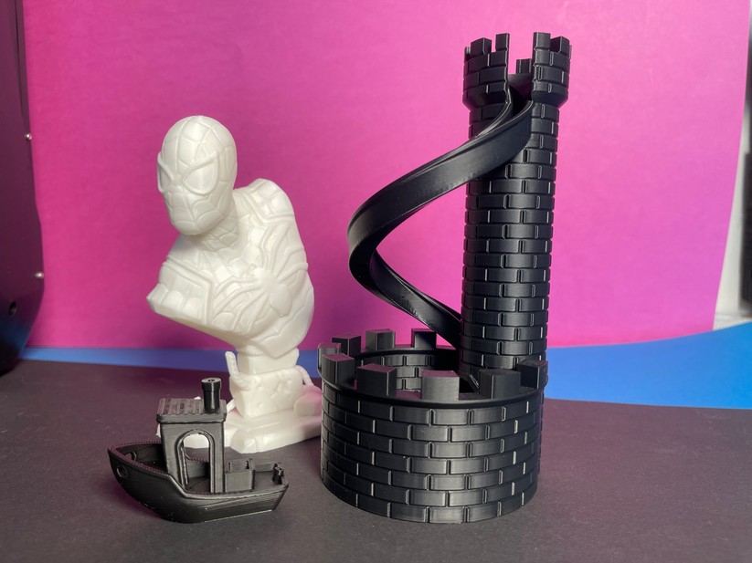 Nach etwa 30 Minuten der Einrichtung kann der erste Druck starten. Lächerlich wenig Filament ist dafür im Lieferumfang enthalten, ein paar Modelle – darunter ein Benchy – sind bereits vorgeslicet auf dem internen Speicher des Druckers abgelegt. Das Benchy gelingt auf Anhieb in 17 Minuten und kann sich durchaus sehen lassen. Die Geldrutsche im Look einer mittelalterlichen Burg kann sich sogar sehr sehen lassen.