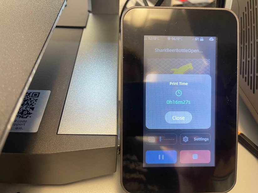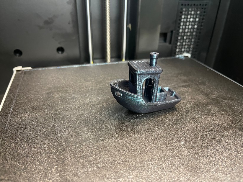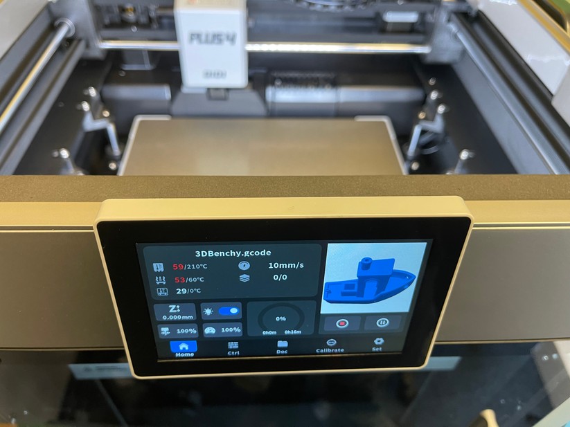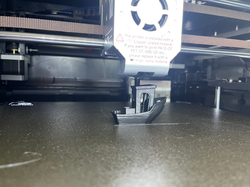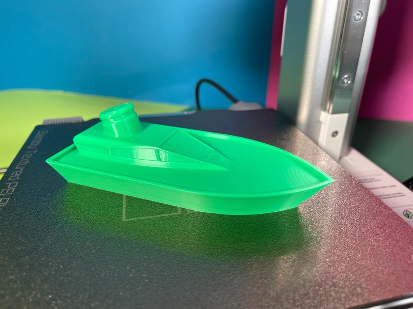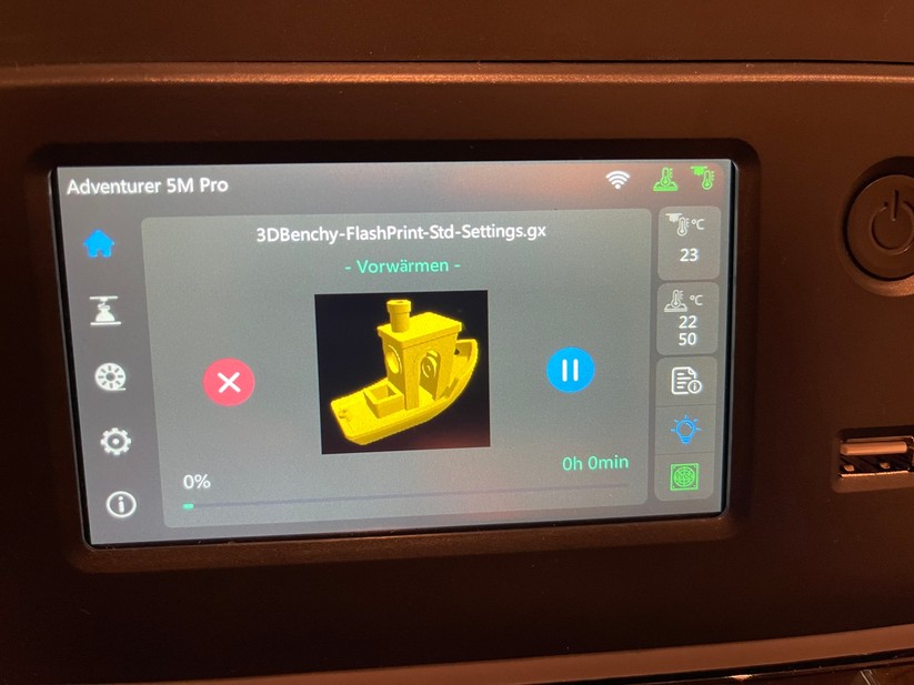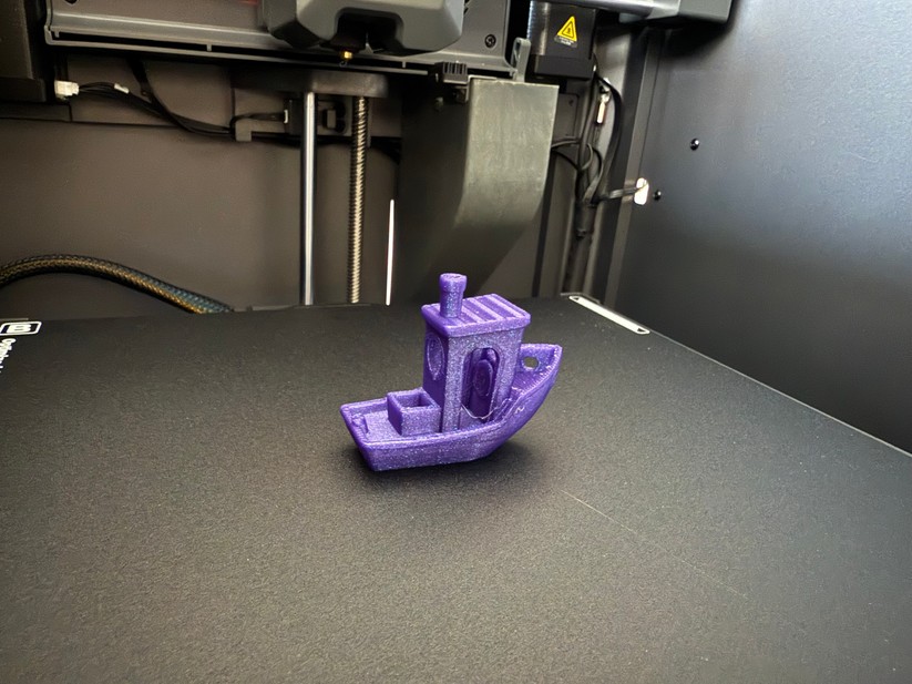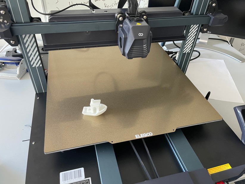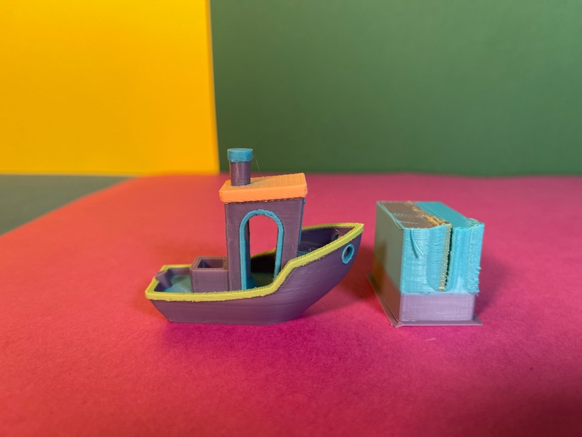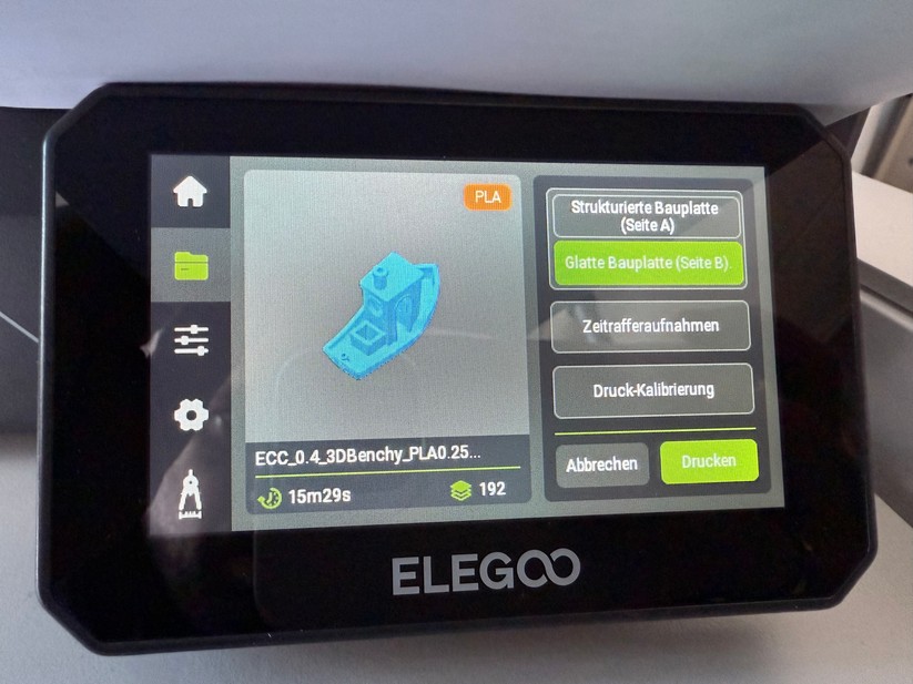 Nach etwa 30 Minuten der Einrichtung kann der erste Druck starten. Lächerlich wenig Filament ist dafür im Lieferumfang enthalten, ein paar Modelle – darunter ein Benchy – sind bereits vorgeslicet auf dem internen Speicher des Druckers abgelegt. Das Benchy gelingt auf Anhieb in 17 Minuten und kann sich durchaus sehen lassen. Die Geldrutsche im Look einer mittelalterlichen Burg kann sich sogar sehr sehen lassen.