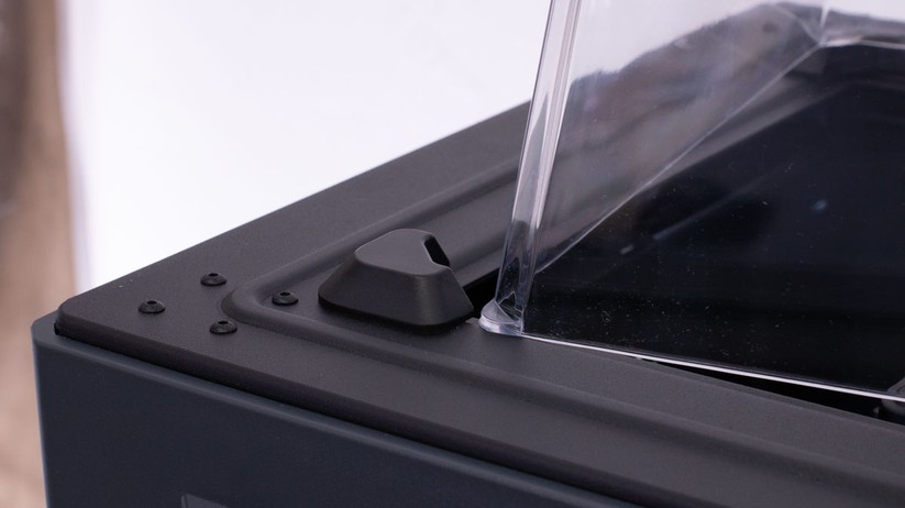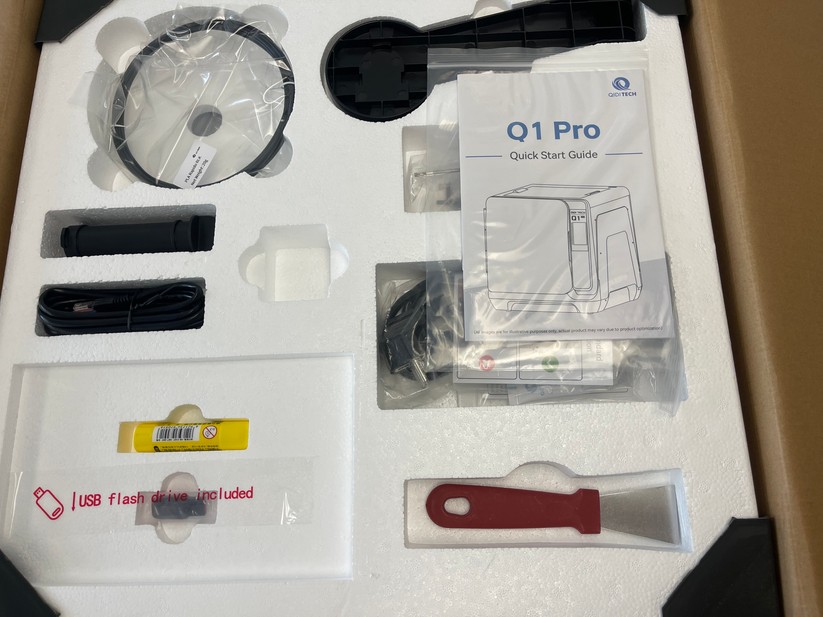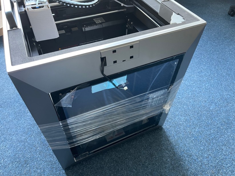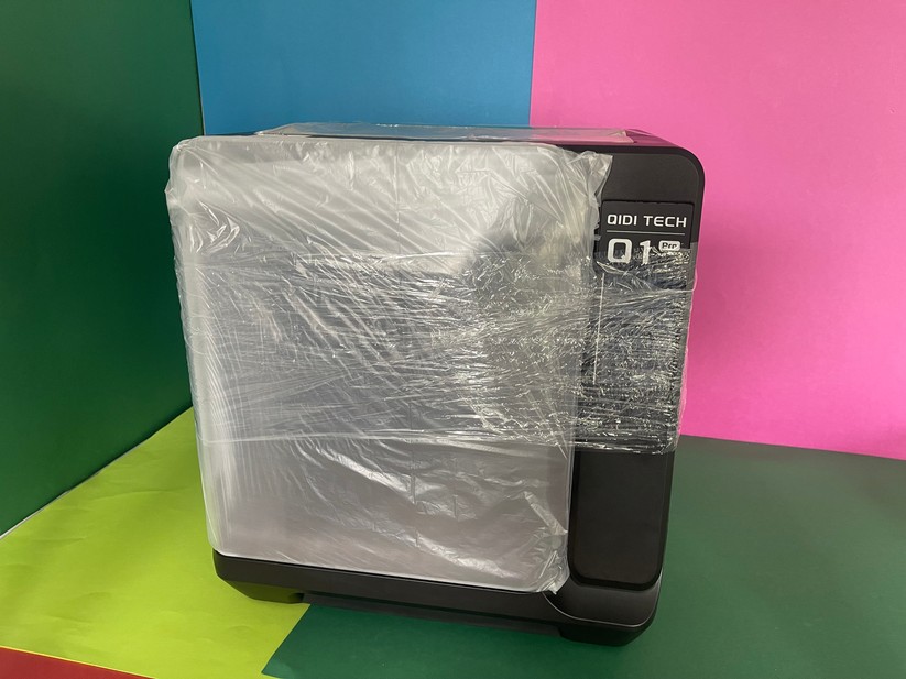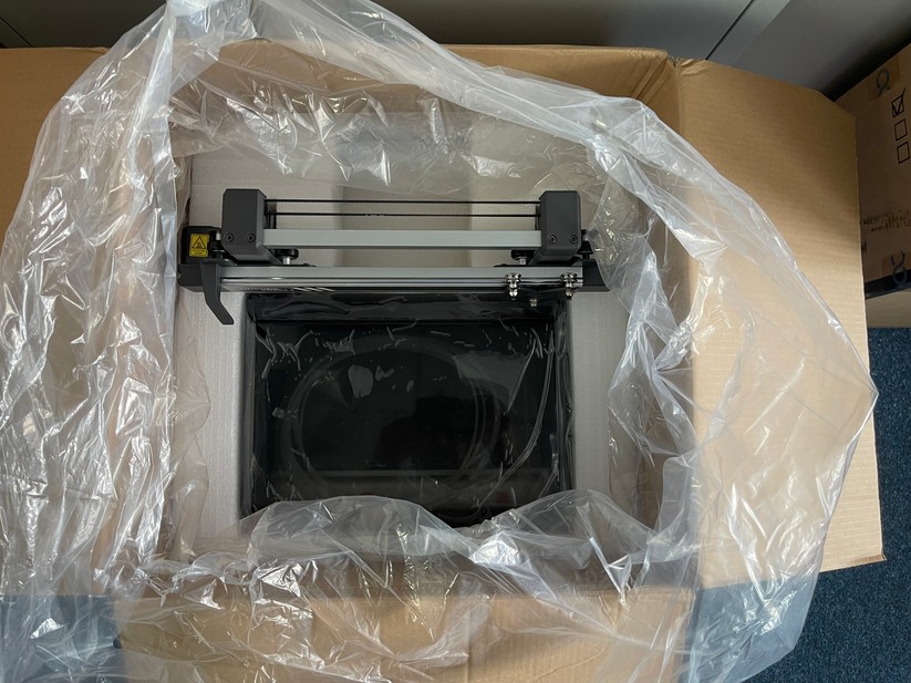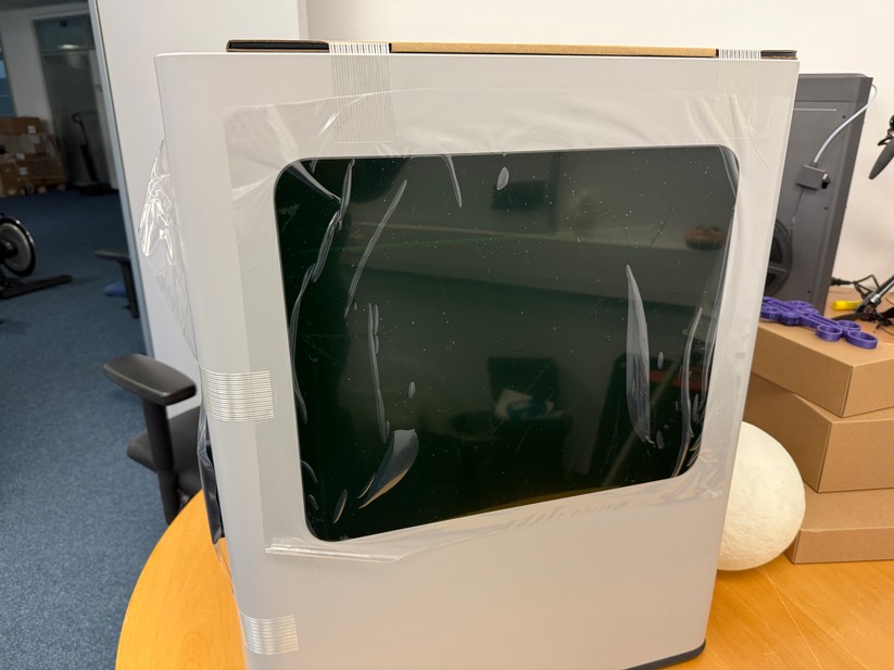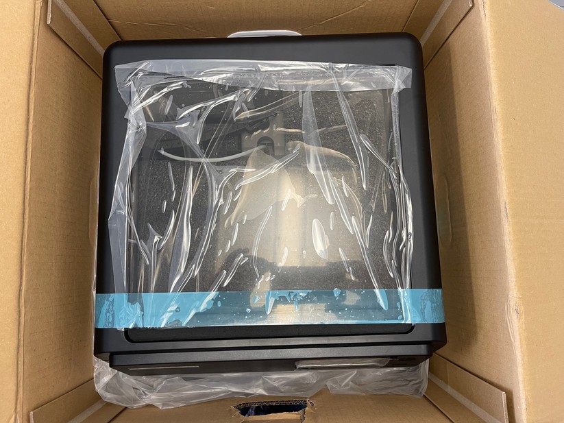 Das Gerät ist ordentlich verpackt und kommt ohne Kratzer oder Beulen bei uns an. Wir entfernen die Folie. Der Q1 Pro erinnert uns an den Flashforge Adventurer 5M Pro (Testbericht): Schwarzes Kunststoffgehäuse mit Acrylglasdeckeln oben und vorne. Die Form der Frontscheibe ist hier verspielter, runder, unpraktischer: Man kann den Deckel schlechter greifen und die funktional unnötigen Kanten stören den Blick in den Bauraum. Der obere Deckel wird nicht, wie beim Flashforge, von einem Scharnier gehalten, sondern ist zwischen Gummidichtungen eingeklemmt. Das funktioniert ganz gut, ist aber beim Einsetzen etwas fummelig – und wenn man Materialien wie PLA druckt, bei denen man den Deckel öffnen soll, damit es im Inneren des Druckers nicht zu warm wird, braucht man Platz, um die Scheibe irgendwo hinzustellen.