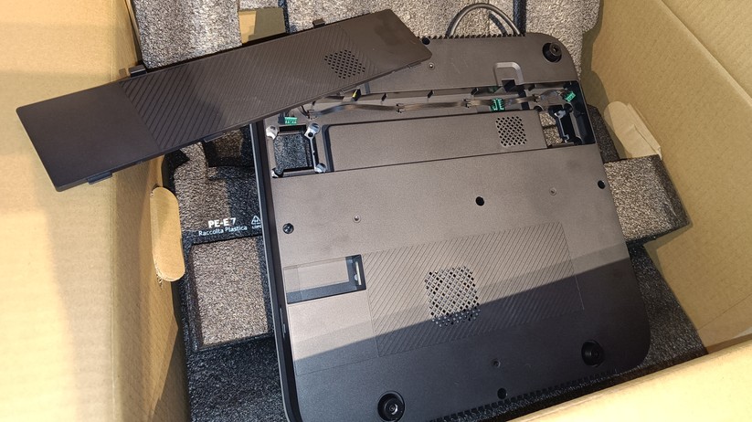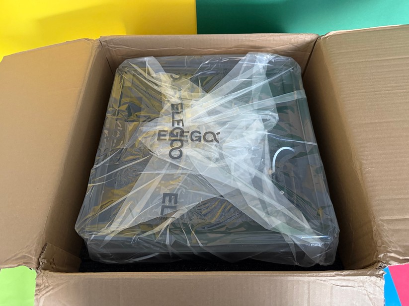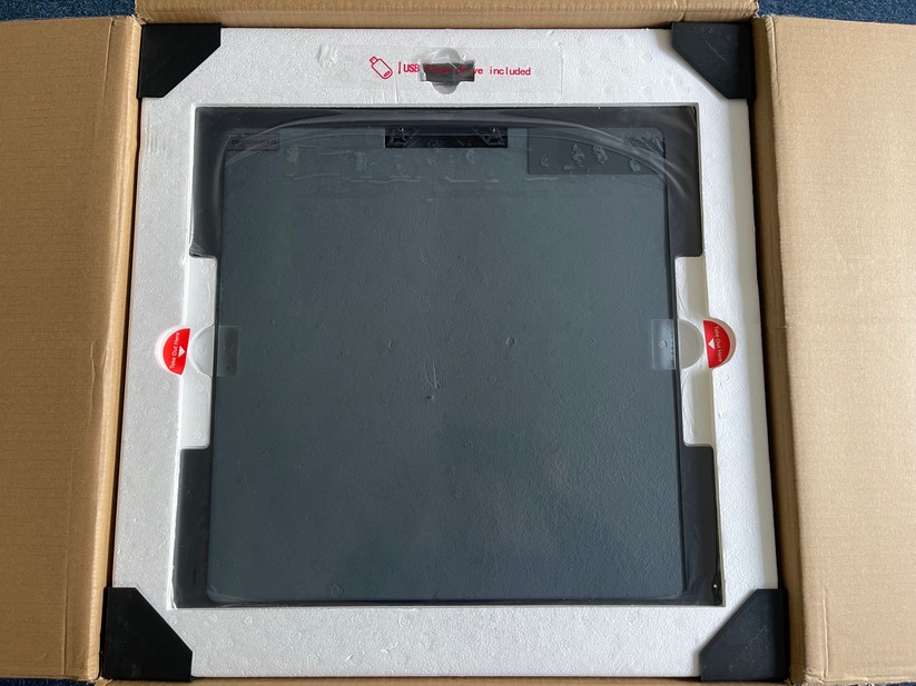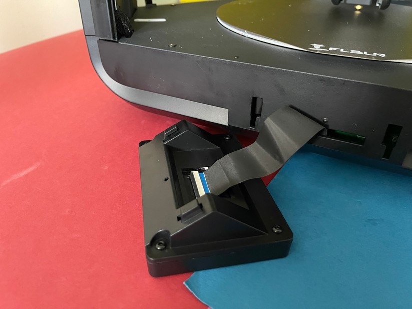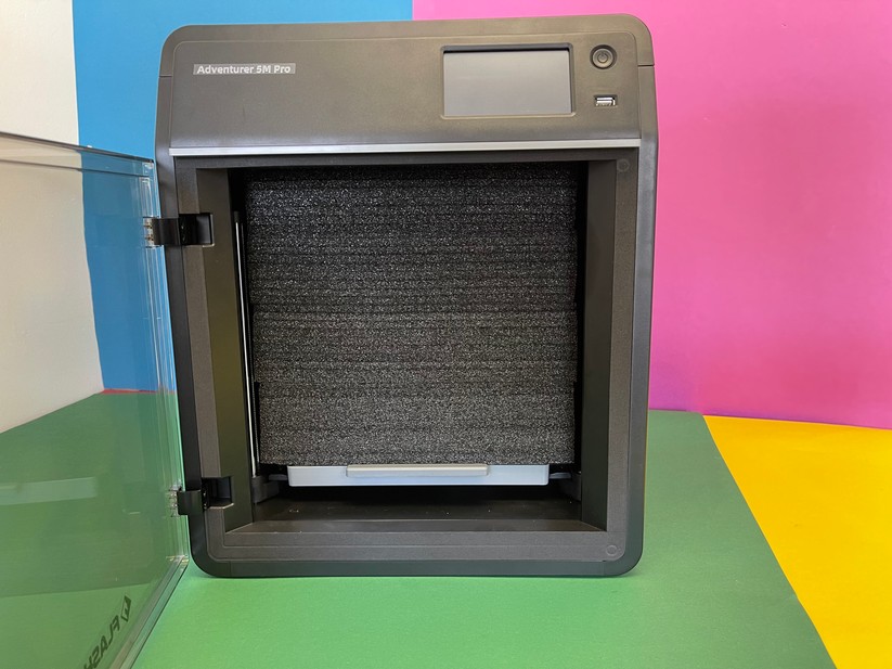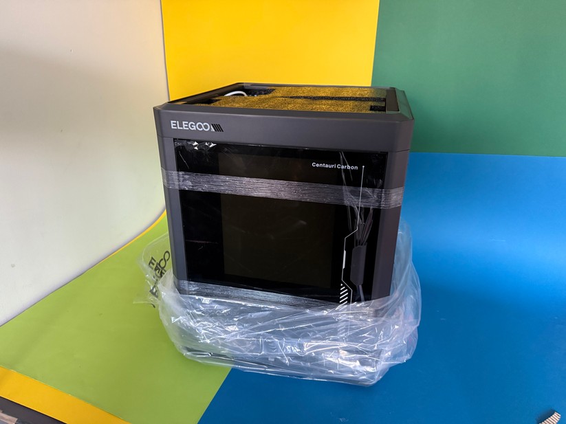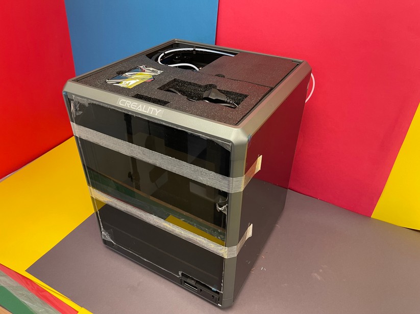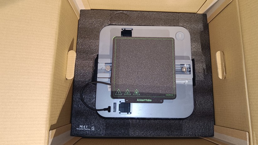 Das Gerät ist ordentlich verpackt und kommt ohne Kratzer oder Beulen bei uns an. Wir entfernen die Folie. Der Q1 Pro erinnert uns an den Flashforge Adventurer 5M Pro (Testbericht): Schwarzes Kunststoffgehäuse mit Acrylglasdeckeln oben und vorne. Die Form der Frontscheibe ist hier verspielter, runder, unpraktischer: Man kann den Deckel schlechter greifen und die funktional unnötigen Kanten stören den Blick in den Bauraum. Der obere Deckel wird nicht, wie beim Flashforge, von einem Scharnier gehalten, sondern ist zwischen Gummidichtungen eingeklemmt. Das funktioniert ganz gut, ist aber beim Einsetzen etwas fummelig – und wenn man Materialien wie PLA druckt, bei denen man den Deckel öffnen soll, damit es im Inneren des Druckers nicht zu warm wird, braucht man Platz, um die Scheibe irgendwo hinzustellen.