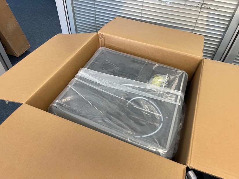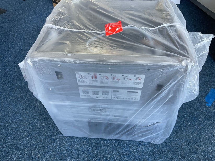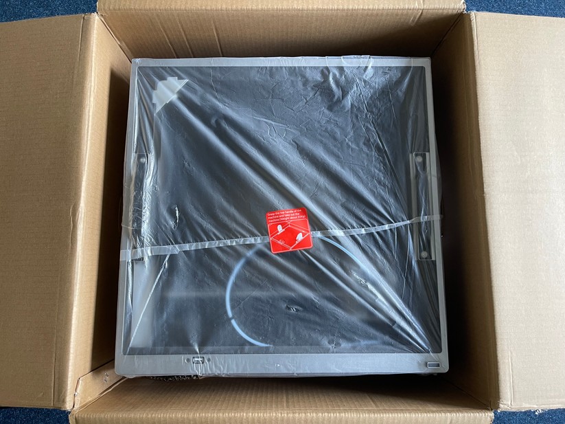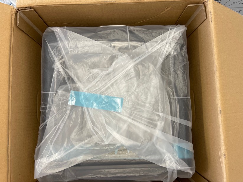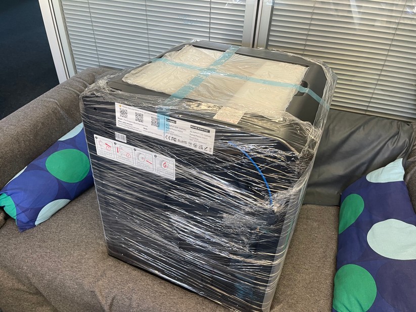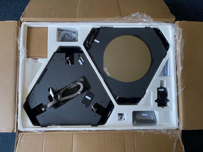 Der Qidi ist ein 3D-Drucker mit geschlossenem Bauraum. Wie die meisten Drucker dieser Art wird er auch fertig aufgebaut geliefert; Basteln ist nicht nötig. Beim Öffnen des Kartons sehen wir zunächst einen Styropor-Deckel mit diversem Zubehör, darunter befindet sich der Q1 Pro. Gut mitgedacht: Das in Folie verpackte Gerät trägt oben einen Aufkleber, wie man es aus dem Karton bekommt. Man soll die Folie mittig greifen und mitsamt Drucker nach oben herausheben. Sogar das Gewicht ist angegeben: 17 Kilogramm. Für einen Erwachsenen ist das gut ohne Hilfe zu schaffen.