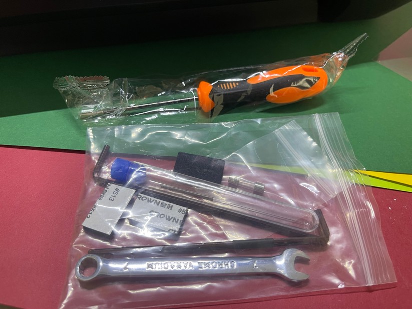Schmiermittel, Inbus-Schlüssel, Ersatzteile und so weiter.