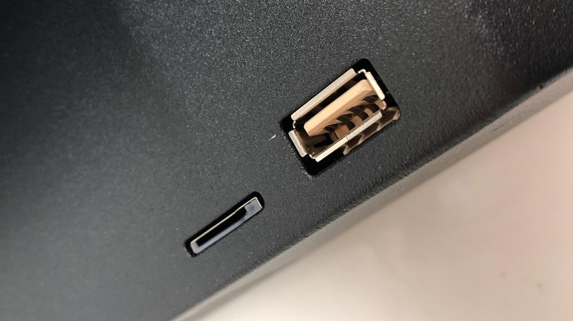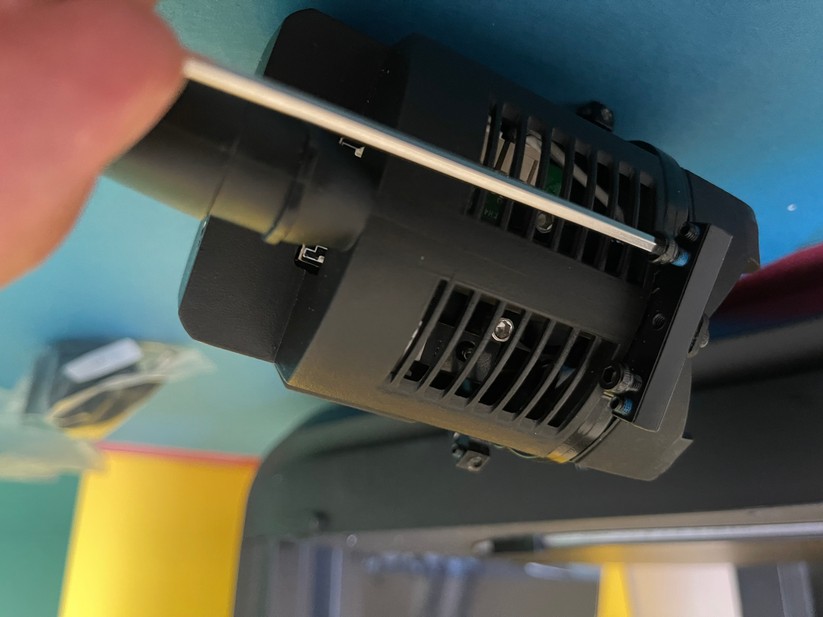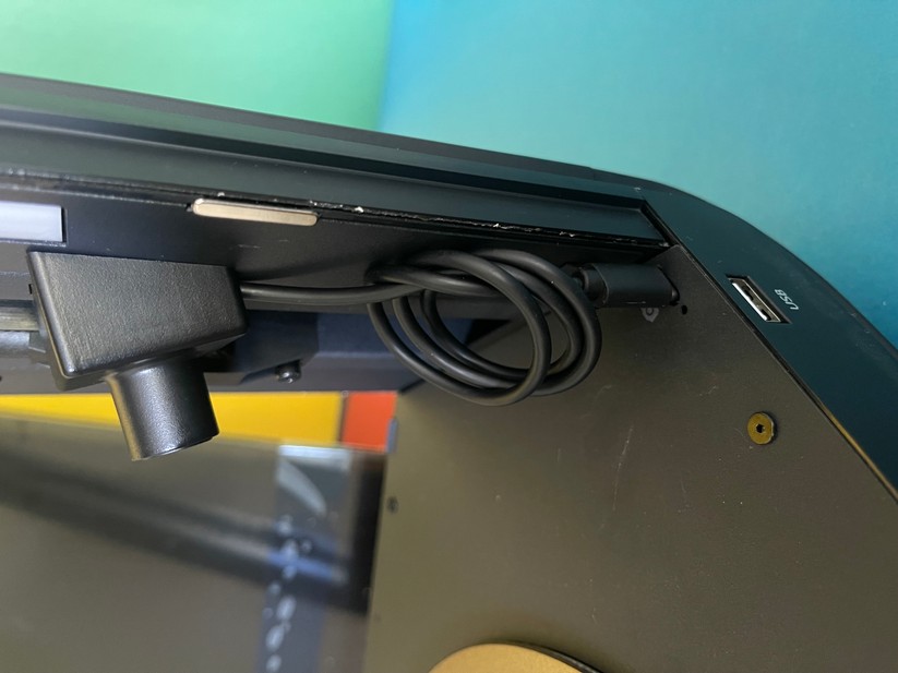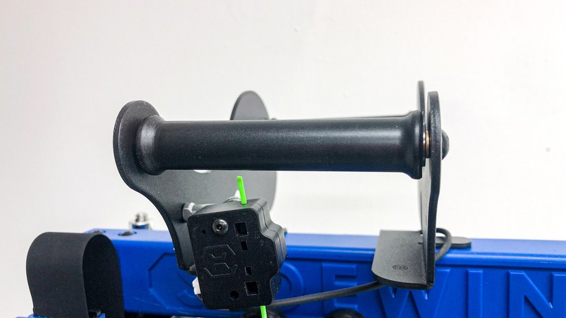 Zu viel gespart hat der Hersteller beim Filamentrollenhalter. Das Ding ist aus Plastik gefertigt, wird hinten in den Drucker eingehakt und steht seitlich über. Leider ist die Konstruktion mit dem Gewicht einer 1-kg-Rolle mit Pappspule schon völlig überfordert, neigt sich seitlich und wackelt und klappert. Abgebrochen ist beim gut zweiwöchigen Test nichts, aber es würde uns nicht wundern, wenn das nicht ewig hält. Das Filament wird über seitlich in den Drucker eingeführt und über den Bowdenschlauch zum Direct Extruder am Druckkopf geführt.