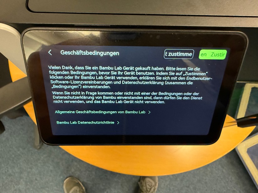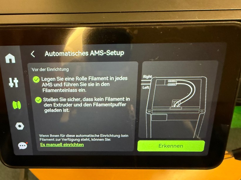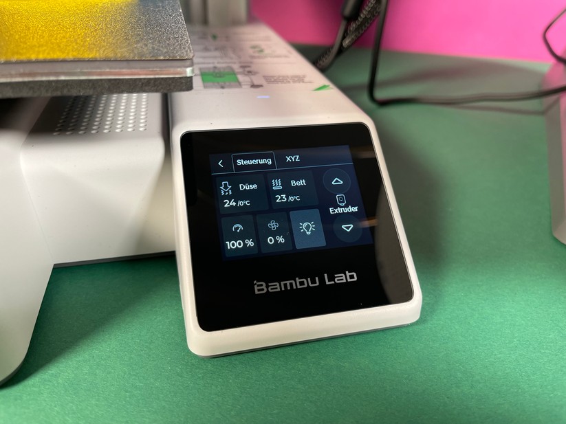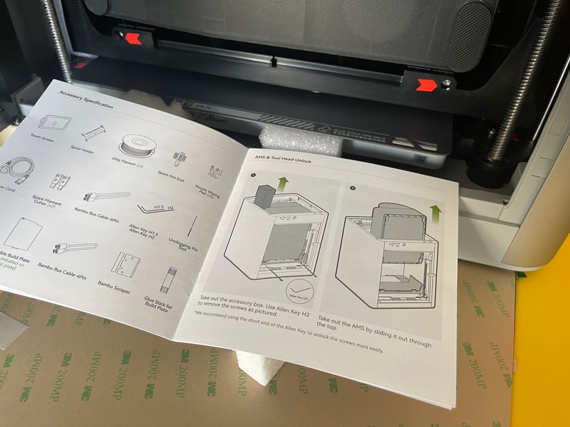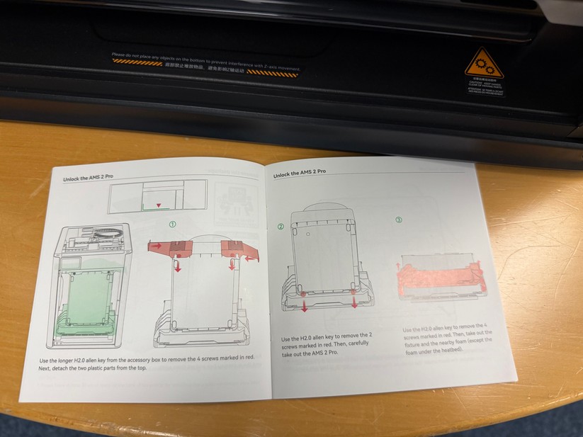 Die gedruckte Schnellstart-Anleitung ist Bambu-typisch vorbildlich aufgebaut, vollständig und einfach zu verstehen. Folien entfernen, Drucker aufstellen, Tür öffnen. Jede Schraube, die man vor dem Druck entfernen soll, ist im Drucker und in der Anleitung deutlich markiert. Wer sich daran hält, hat das Gerät nach einer guten Stunde einsatzbereit vor sich stehen.