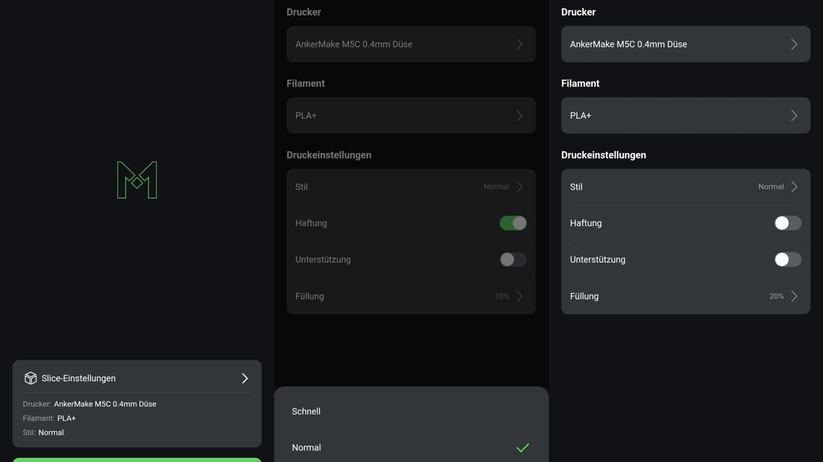3D-Modelle werden in dem sogenannten Slicer für den Druck vorbereitet. Hier bietet Mingda die kostenlose Software Cura an und liefert auch passende Druckerprofile auf der beigelegten Speicherkarte. Entweder fällt die Wahl auf das in Cura implementierte Mingda Pro-Druckerprofil, oder ein eigenes Druckerprofil wird angelegt und mit den SD-Karten-Profilen gefüttert.