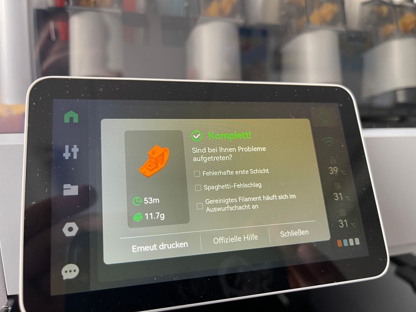 Die Haftung auf der PEI-Druckplatte war in allen Fällen ohne zusätzliches Haftmittel einwandfrei, nur selten gab es leichtes Warping. Fehldrucke hatten wir während der gesamten Testphase nicht – wenn man mal von den Präzisionsproblemen bei Print-in-Place-Drucken absieht.
