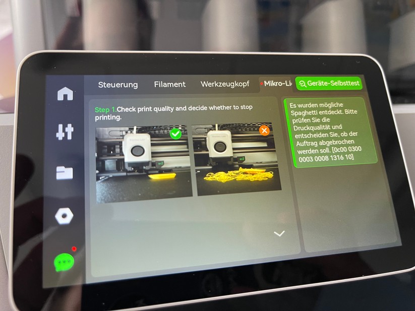 Es gibt eine Kamera im Bauraum, die über den Slicer ein Live-Bild zeigt. KI-Funktionen wie Spaghetti- oder Fehldruckerkennung, wie wir sie vom Bambu X1 Carbon her kennen, bietet sie leider nicht.
