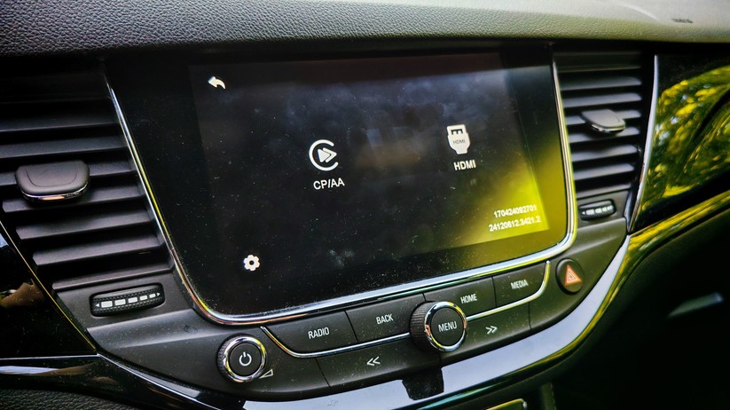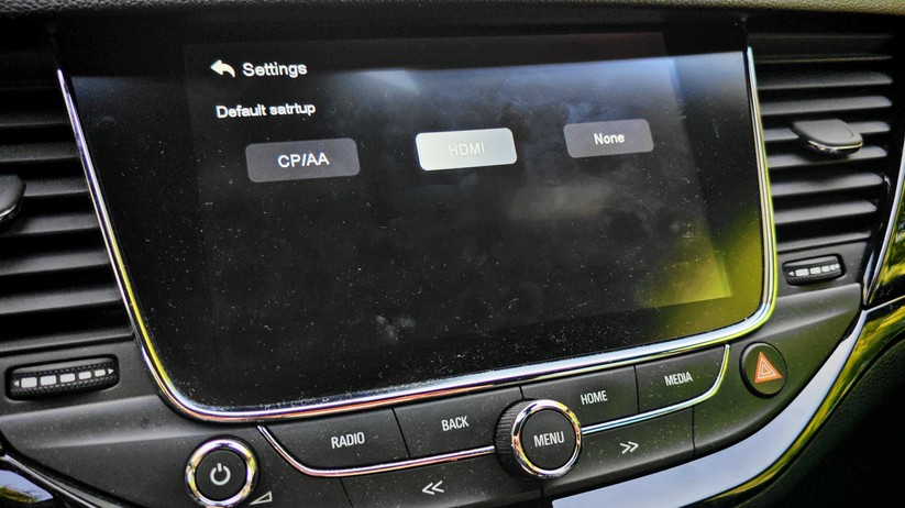 Nach dem ersten Einstecken wählt man im Infotainmentsystem das Carplay-Symbol aus. Dann startet ein schwarzer Startbildschirm mit zwei Symbolen: Carplay/Android Auto (CP/AA) und HDMI. Unten führt ein Icon mit Zahnrad zu den Einstellungen. Dort legt man fest, ob beim Start automatisch der HDMI-Eingang aktiviert ist.