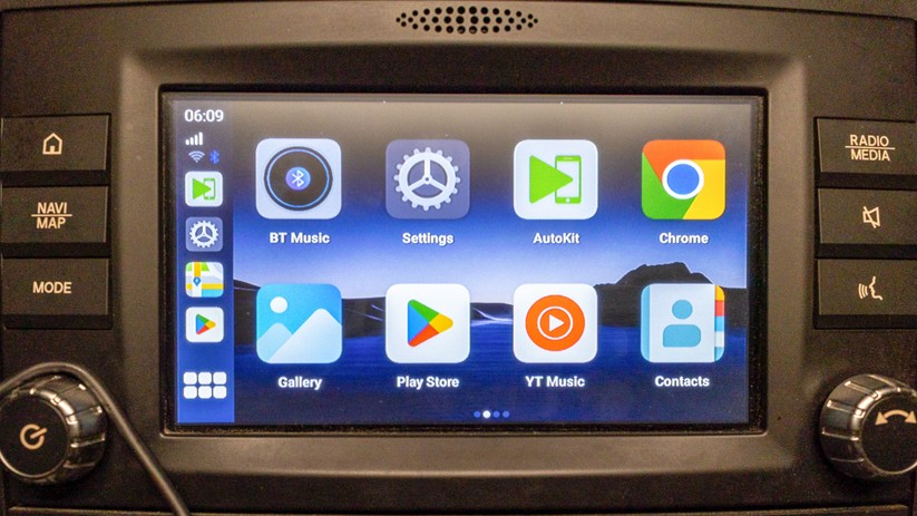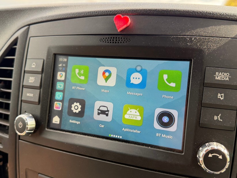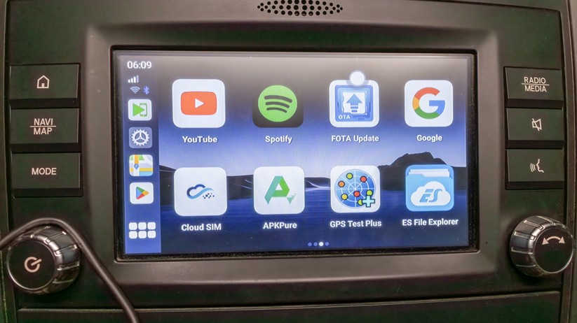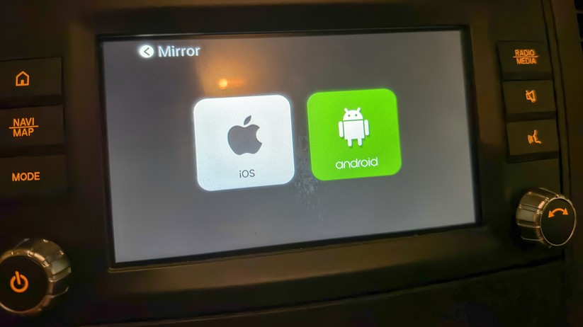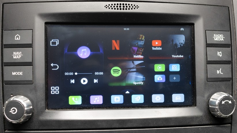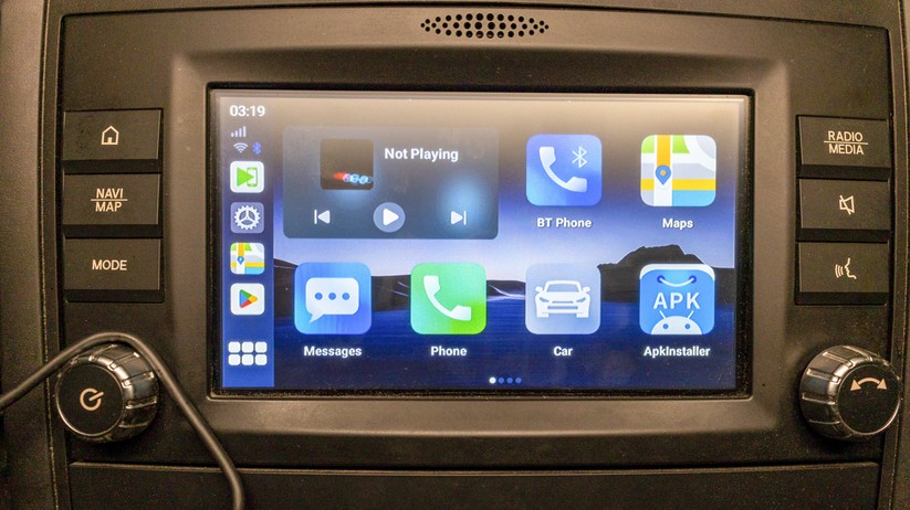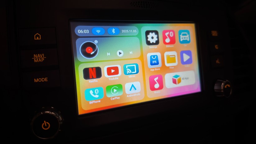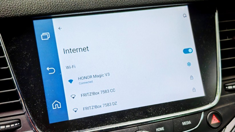 Sobald die Internetverbindung stand, konnte das System wie gewohnt genutzt werden. Wer in den Modus für Android Auto oder Carplay wechseln möchte, kann dies über entsprechende Schaltflächen direkt auf dem Homescreen tun. In diesem Fall fungiert die Box lediglich als Schnittstelle, die die Inhalte des Smartphones kabellos im bekannten Carplay- oder Android-Auto-Layout auf dem Fahrzeug-Display darstellt.