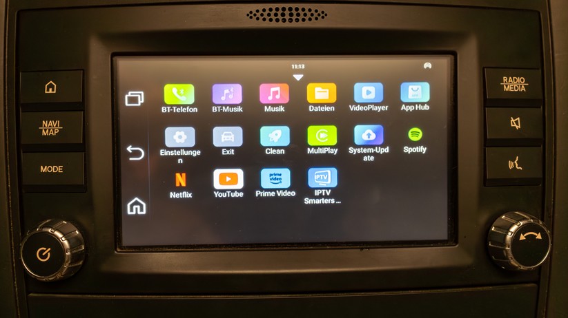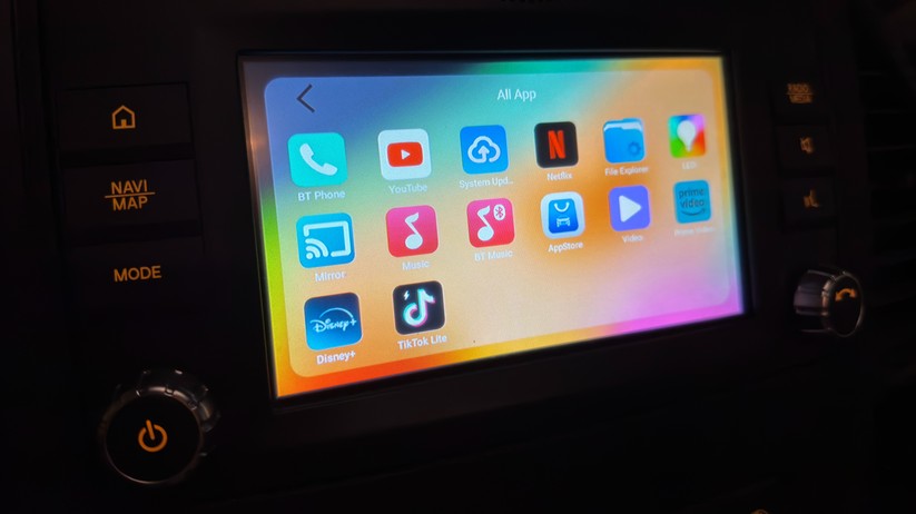Das Betriebssystem ist nicht vollständig offen – ein Zugriff auf den Google Play Store oder vergleichbare App-Marktplätze ist nicht vorgesehen. Stattdessen steht ein eigener App-Store der Box zur Verfügung, in dem lediglich eine Auswahl an Anwendungen bereitsteht. Dazu gehören unter anderem Netflix, Amazon Prime Video, IPTV, Spotify, Tiktok Lite und Google Maps sowie Waze zur Navigation. Neben dem eigenen Betriebssystem unterstützt die Box, wie eingangs erwähnt, auch Wireless CarPlay sowie Android Auto.