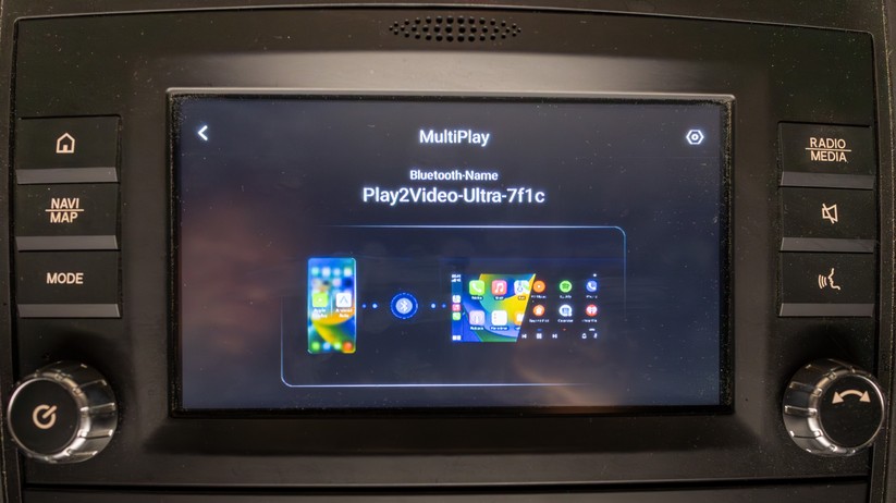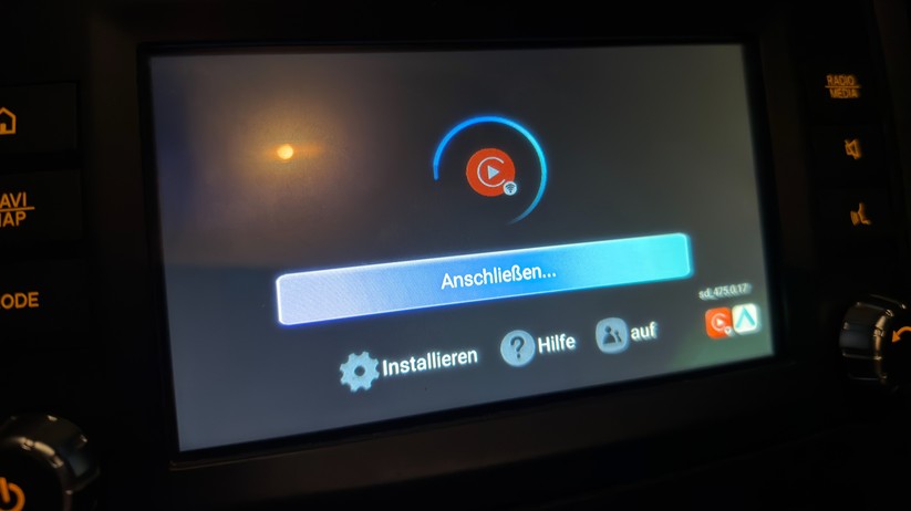 Als Schnittstelle nutzt das Gerät die Carplay-Verbindung des Fahrzeugs – allerdings auf unkonventionelle Weise. Der Dongle „zweckentfremdet“ die Carplay-Schnittstelle, um Audio- und Videosignale per HDMI ins Infotainmentsystem einzuspeisen. Nach dem Einstecken erscheint daher zunächst das gewohnte Carplay-Logo auf dem Fahrzeug-Display.