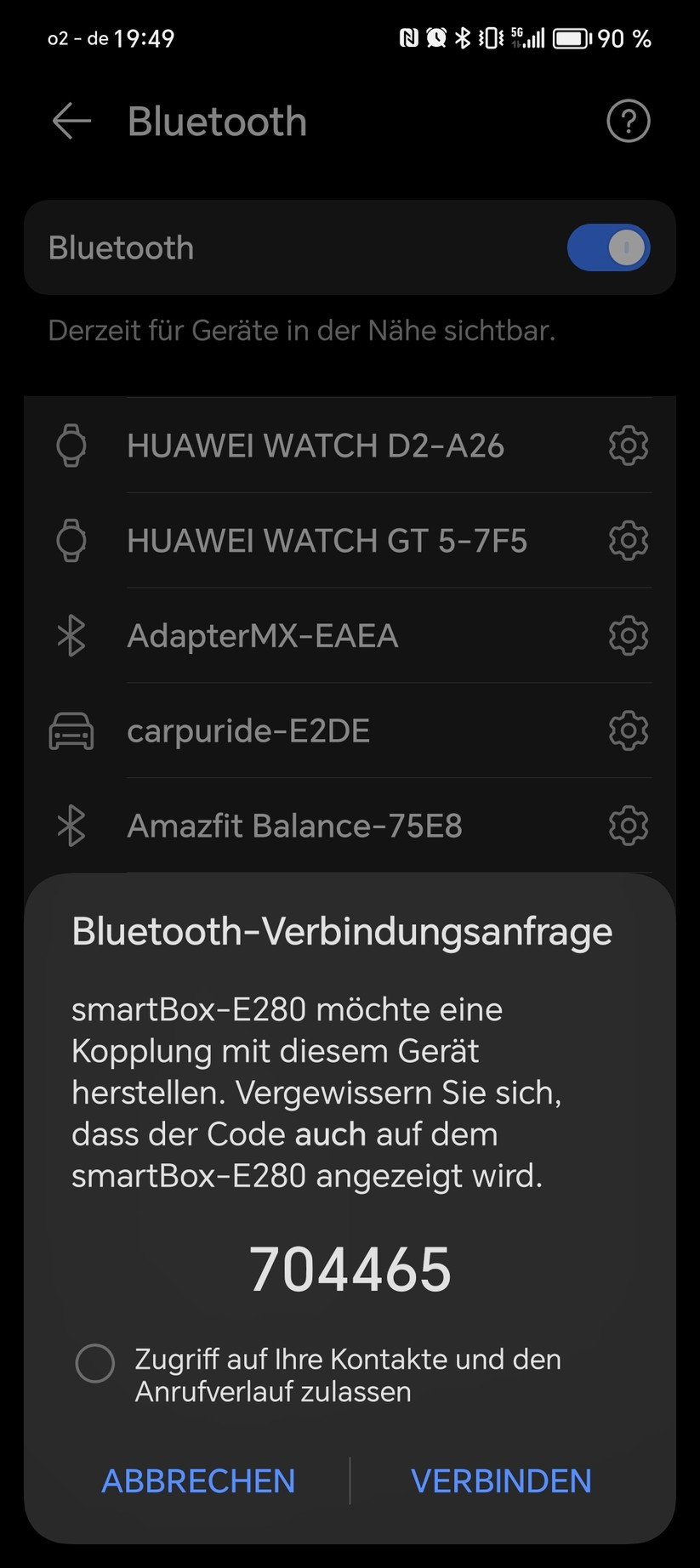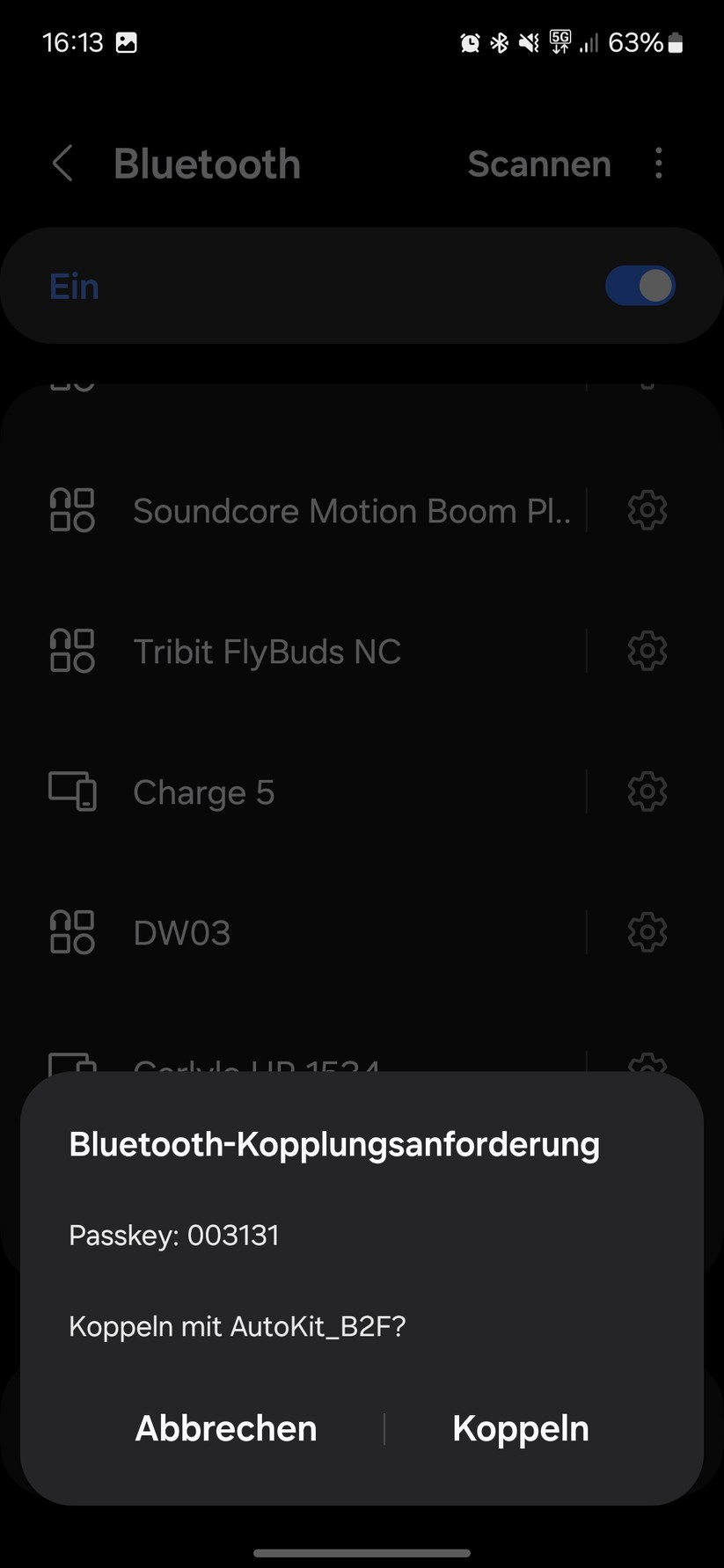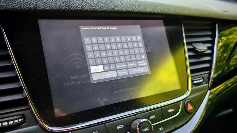 Zuerst wird die Box per Kabel mit dem Auto verbunden. Theoretisch sollte das Infotainmentsystem das Gerät dabei automatisch erkennen – auf dem Display erscheint dann ein Carplay-Icon, da der Adapter diese Schnittstelle nutzt. Im Praxistest passierte jedoch zunächst nichts. Deshalb haben wir den Adapter zusätzlich per Bluetooth sowohl mit einem Honor Magic V3 als auch mit einem Apple iPhone 15 Pro Max gekoppelt.