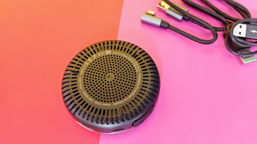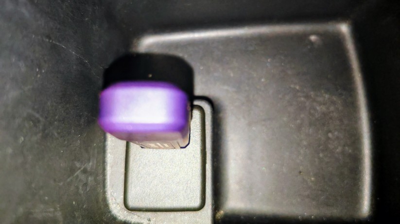 Der Ottocast A2Air bietet ein auffälliges Design. Das kantige, quadratische Gerät hat eine kompakte Größe von 58 × 58 × 16 Millimetern und passt damit problemlos in jedes Fahrzeug. Besonders ins Auge fällt die Maserung in zwei Violetttönen, die dem Adapter einen einzigartigen Look verleiht. Der USB-C-Anschluss des A2Air ist allerdings etwas tief im Gehäuse verbaut, was die Nutzung kurzer, abgewinkelter USB-Kabel erschwert. Dies könnte für einige Nutzer ein Nachteil sein, wenn das vorhandene Kabel nicht passt.