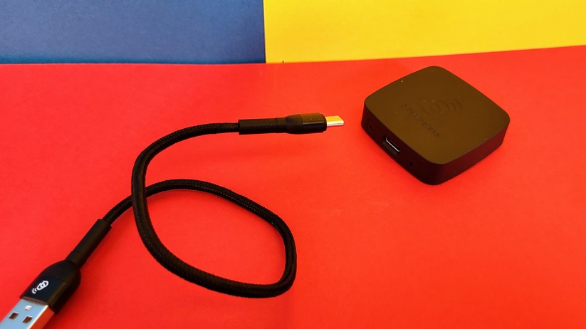 Der Ottocast Car TV Mate Pro Max erinnert optisch an einen herkömmlichen Wireless-Adapter für Android Auto und Apple Carplay. Das Gehäuse besteht aus hochwertig verarbeitetem Kunststoff und ist quadratisch geformt. Die Kantenlänge beträgt jeweils 58 mm, die Dicke 14 mm. Auch das mit Stoff ummantelte Kabel mit USB-A-Stecker macht einen soliden Eindruck. Eine praktische Klettschlaufe hilft dabei, das Kabel ordentlich zu verstauen – ideal, wenn man den Adapter mitnehmen möchte.