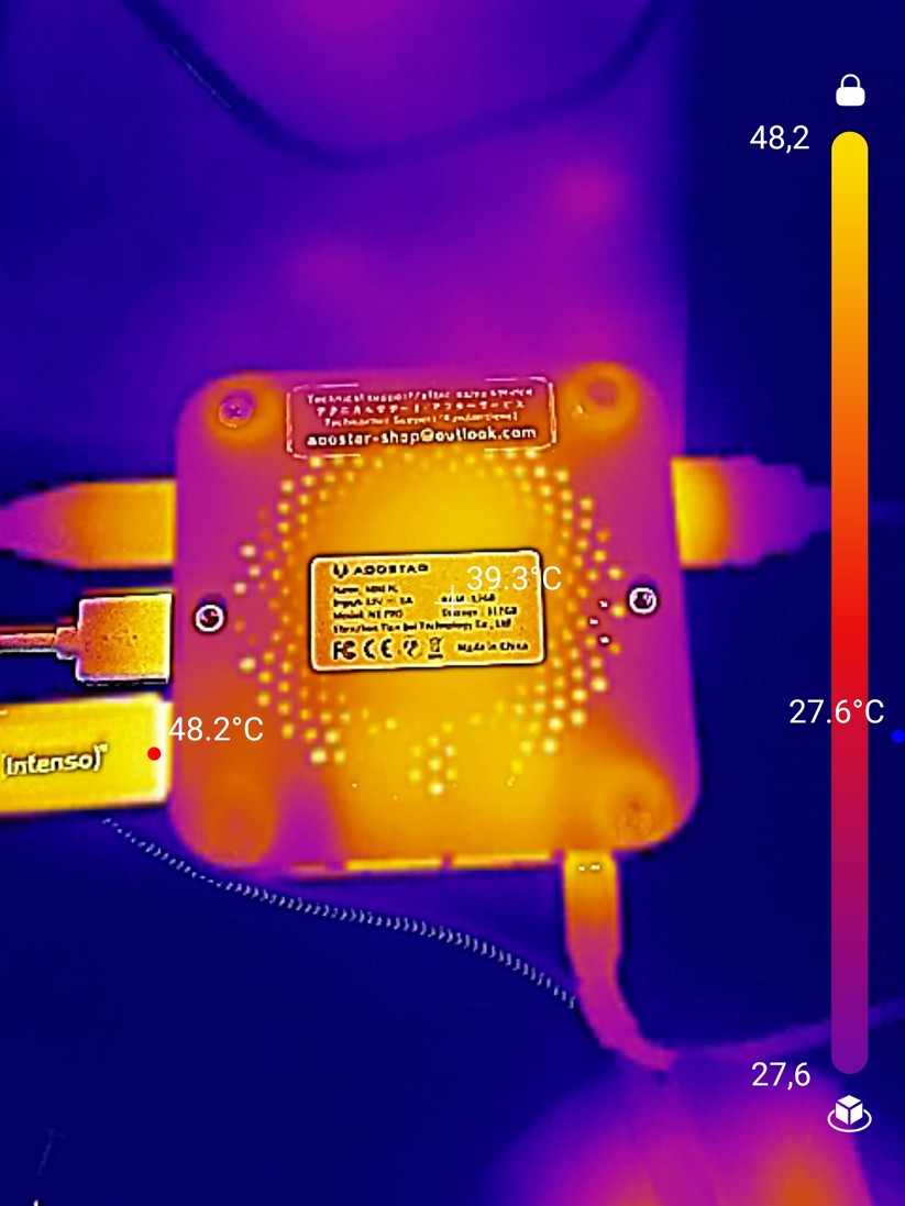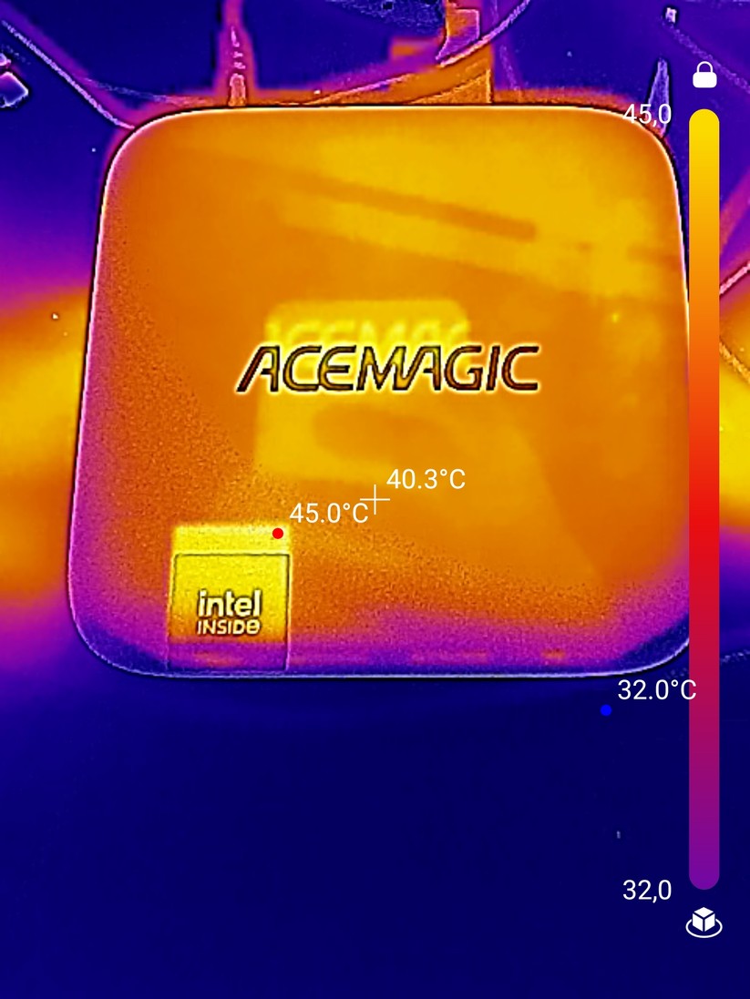 Der Lüfter im Acemagic K1 fällt ziemlich groß aus. Zusammen mit der niedrigen TDP der CPU ist die Kühlung nicht nur gut, sondern auch sehr leise. Unter Volllast durch den integrierten Stresstest von Aida64 messen wir am Gehäuse maximal 33 dB mit dem Smartphone. In einem Meter Entfernung sind es unter 20 dB, im Idle ist der Lüfter dauerhaft aus – das Kühlkonzept ist hier also voll gelungen.
