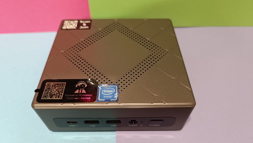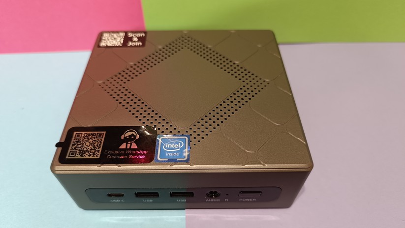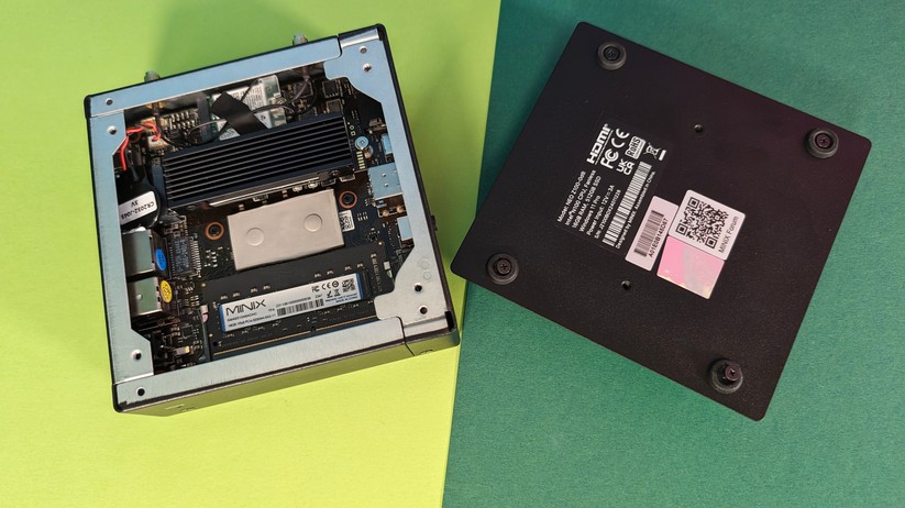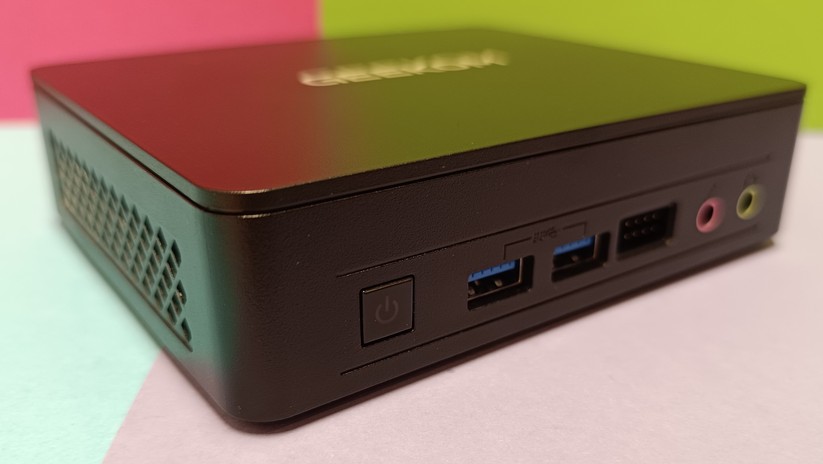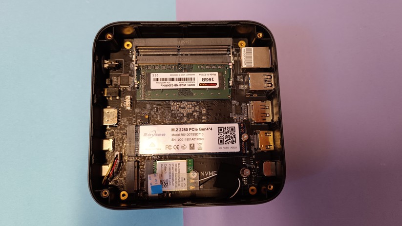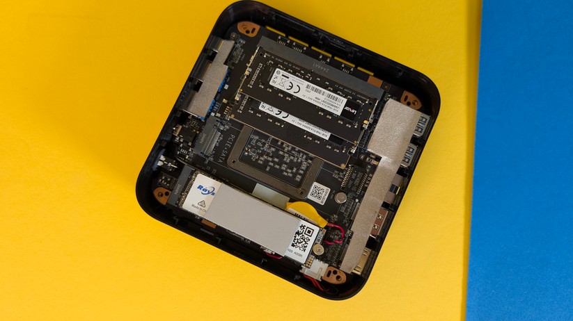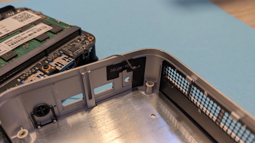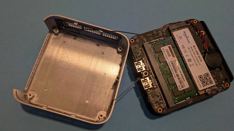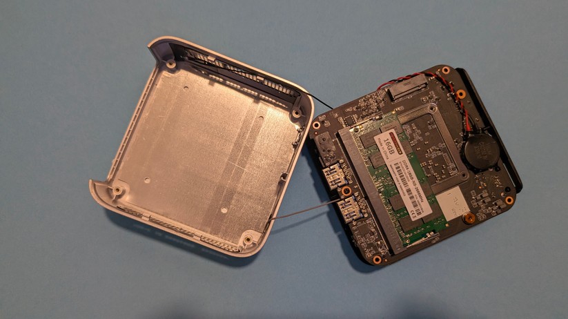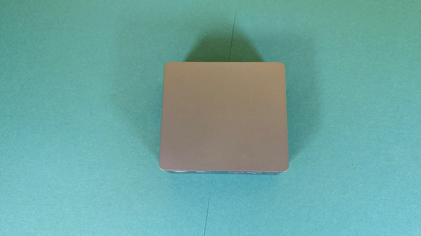 Dadurch gestaltet sich aber das Aufrüsten von RAM und SSD etwas schwieriger, da hierzu das gesamte Mainboard herausgenommen werden muss. Dabei muss man auf die beiden WLAN-Antennen achten, die zwischen den vorderen Anschlüssen durchgeführt sind und nicht allzu viel Spielraum bieten. Der Mini-PC ist mit 128,1 × 128,1 × 42,2 mm kompakt und mit nur 396 g sehr portabel.