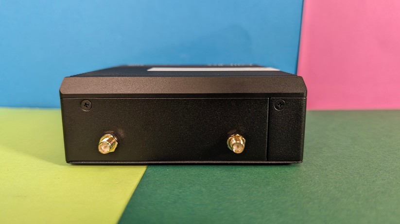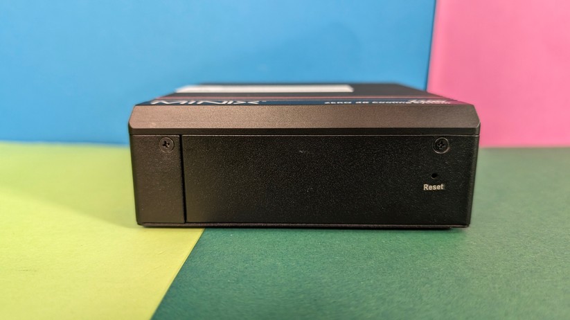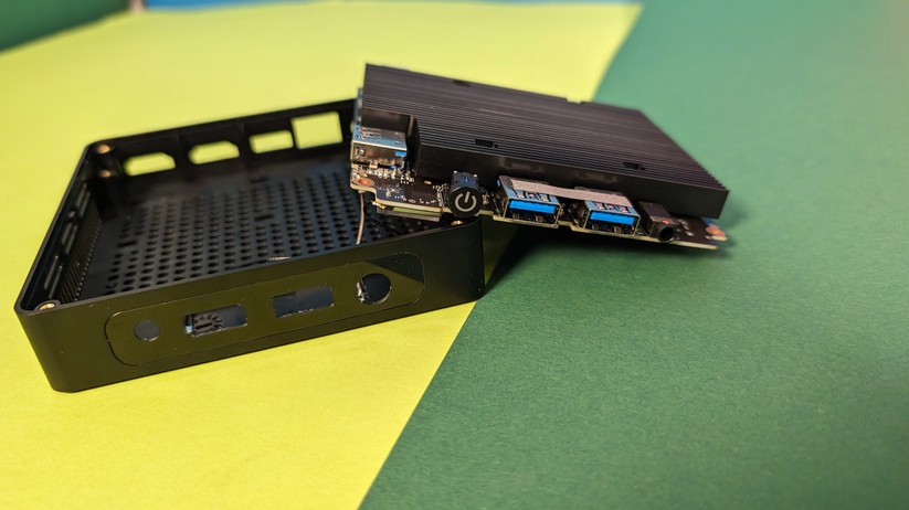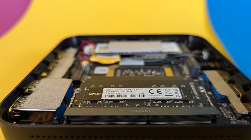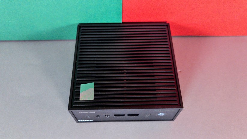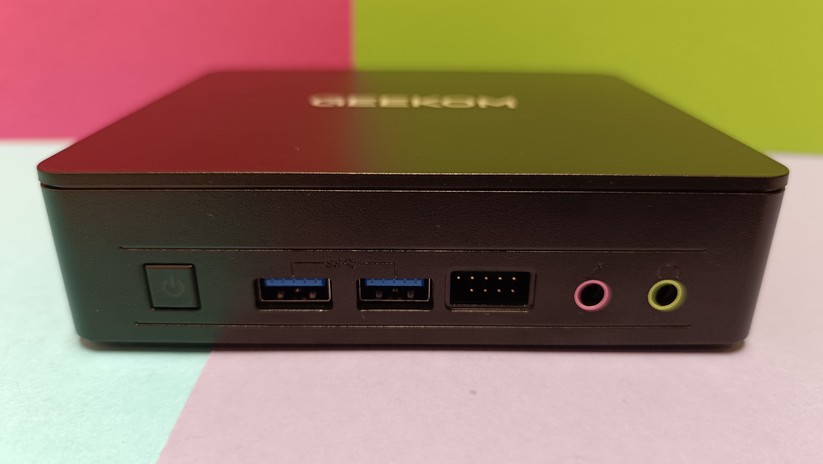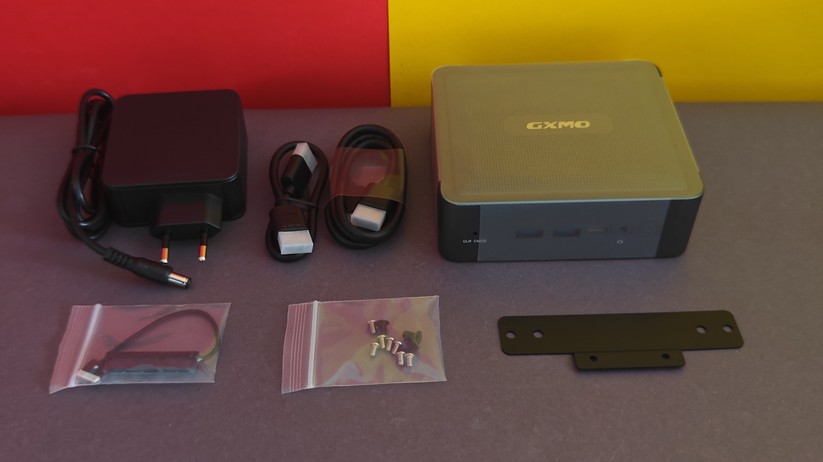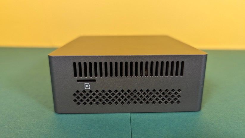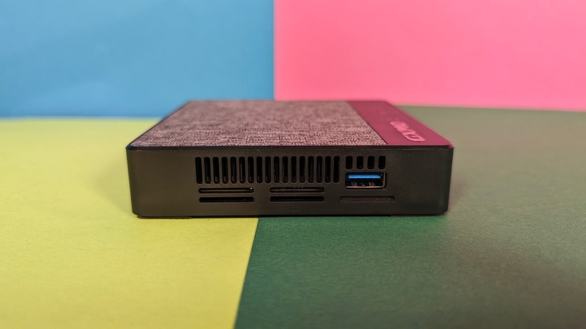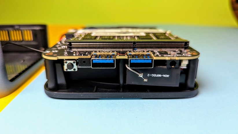 Dadurch gestaltet sich aber das Aufrüsten von RAM und SSD etwas schwieriger, da hierzu das gesamte Mainboard herausgenommen werden muss. Dabei muss man auf die beiden WLAN-Antennen achten, die zwischen den vorderen Anschlüssen durchgeführt sind und nicht allzu viel Spielraum bieten. Der Mini-PC ist mit 128,1 × 128,1 × 42,2 mm kompakt und mit nur 396 g sehr portabel.