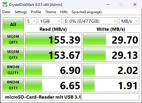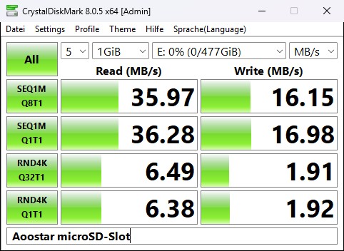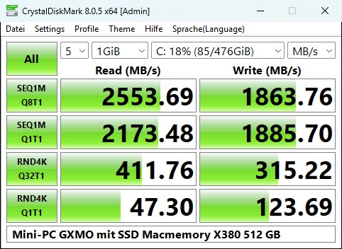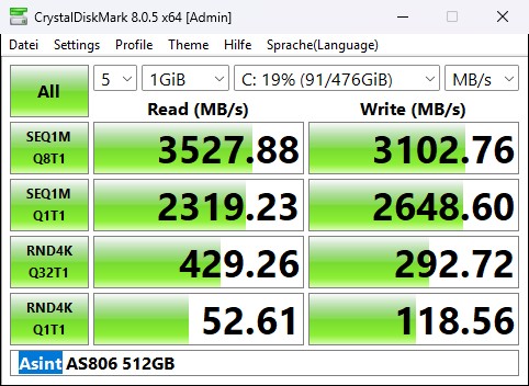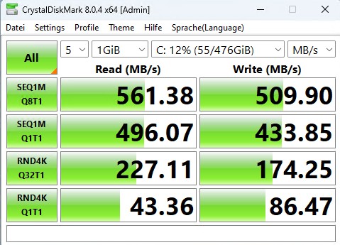 Acemagic spendiert mit 512 GB wieder üppig Speicher. Allerdings unterstützt die M.2-SSD im Formfaktor 2280 nur SATA-Geschwindigkeiten, der Slot nutzt den M.2 B+M-Key. Im Crystaldiskmark erreichen wir 544 MB/s im Lesen und 462 MB/s im Schreiben. Der M.2-Port selbst unterstützt aber auch schnellere Festplatten. Laut Hersteller sind die zwei Steckplätze für eine Gesamtkapazität von 4 TB ausgelegt.