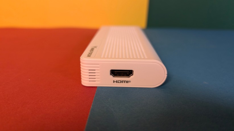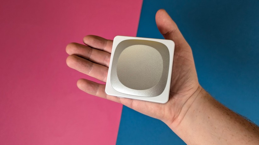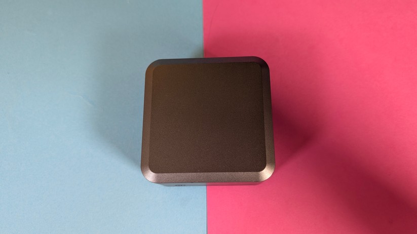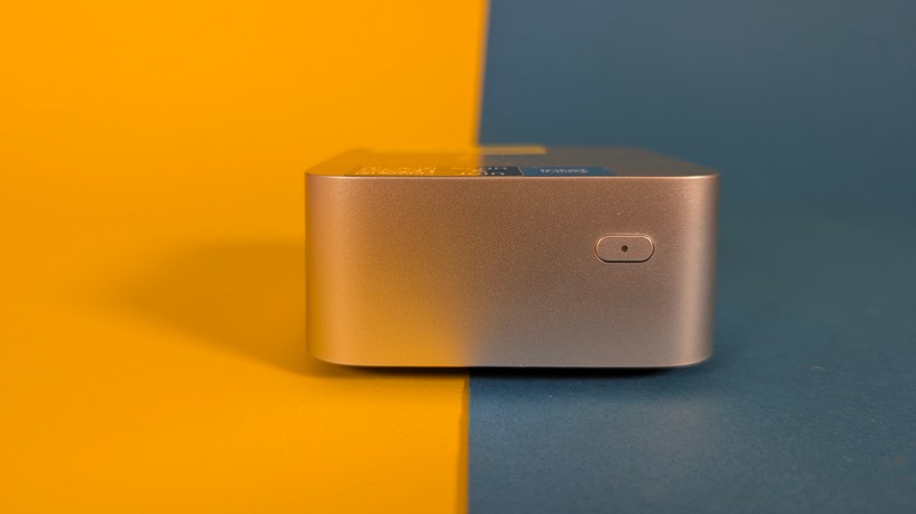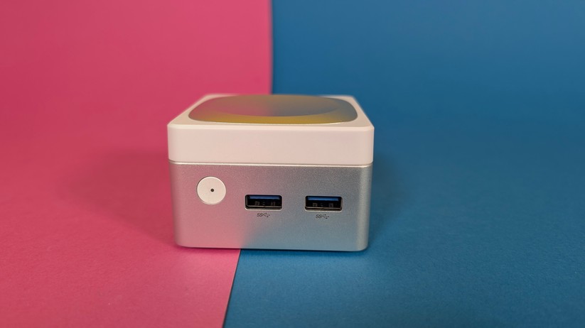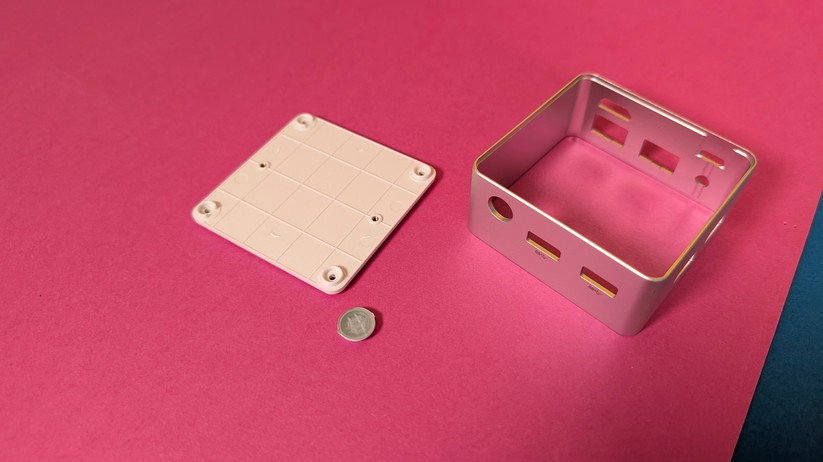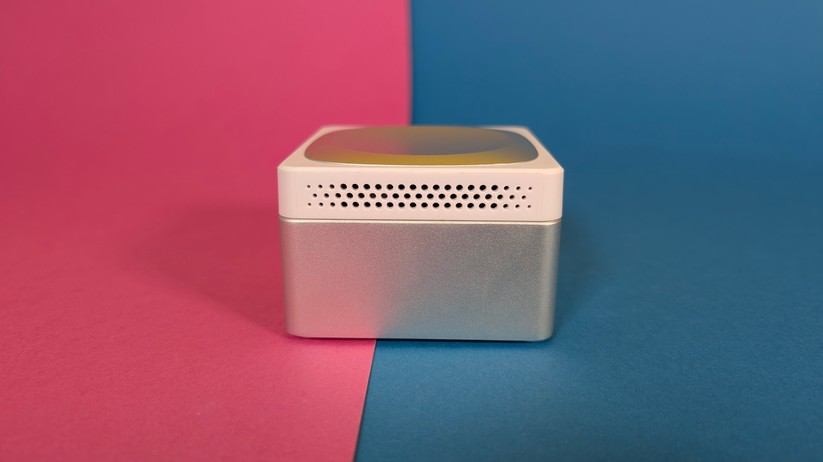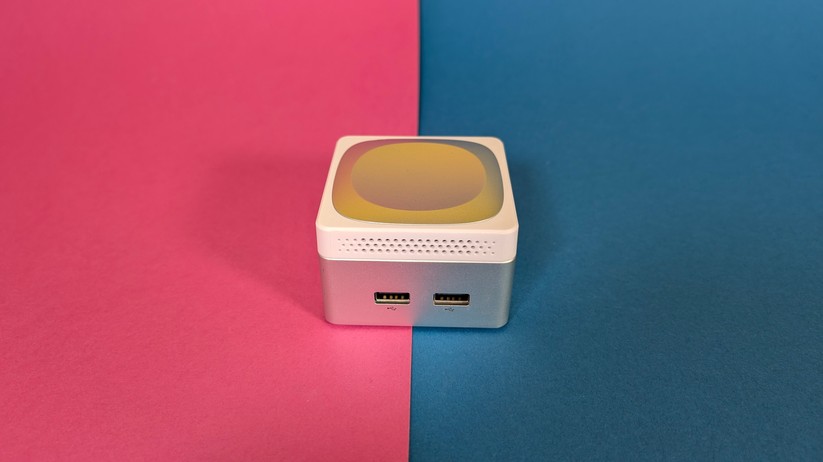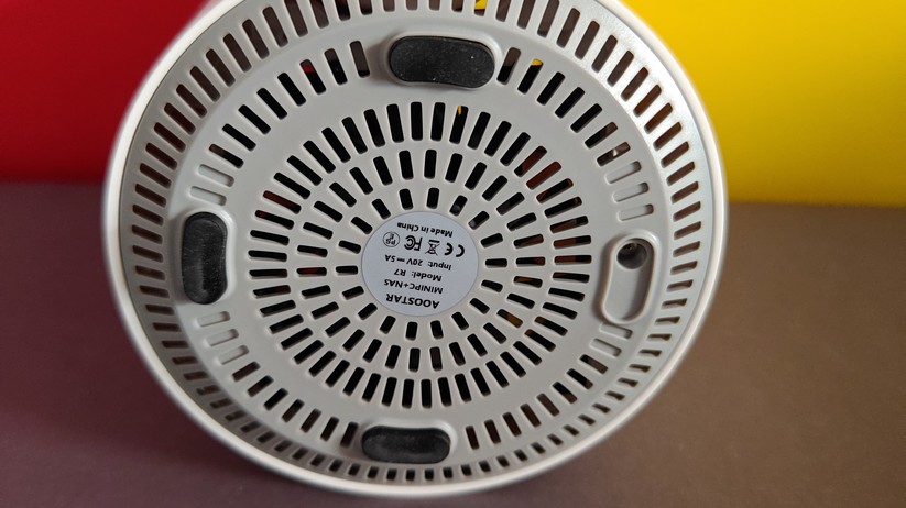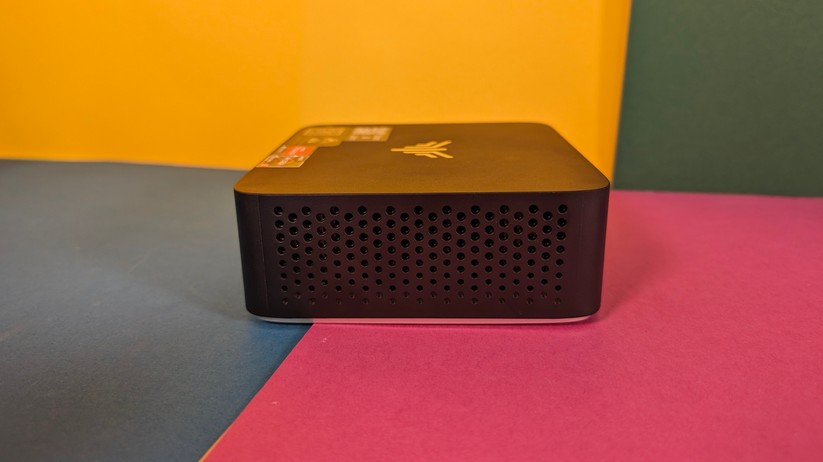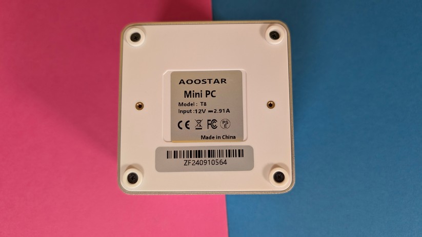 Die Verarbeitung des Aoostar T8 ist für einen Preis von etwa 200 Euro absolut tadellos und hochwertig. Während ein kleiner Teil des Mini-PCs aus weißem Kunststoff besteht, sind ringsum um die Anschlüsse sowie im Deckel Teile aus Aluminium eingesetzt, die die Wertigkeit deutlich steigern. Nichts knarzt oder wirkt deplatziert – eine richtig gute Verarbeitungsqualität. Die Maße des Gehäuses betragen 7,3 × 7,3 × 4,3 cm, das Gewicht liegt bei lediglich 190 g.
