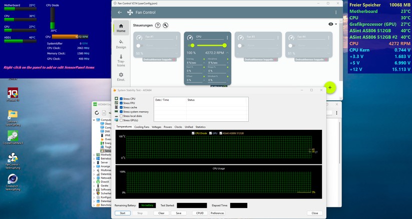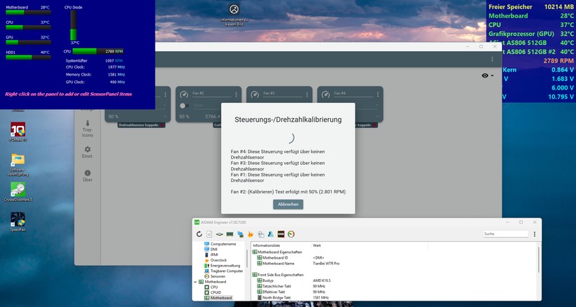 Der Lüfter des Aoostar T8 ist eine echte Besonderheit, denn es ist der erste in einem Mini-PC, den wir testen, wo man die Drehzahl softwareseitig frei einstellen kann. Das klappt in unserem Fall mit dem kostenlosen Tool Fancontrol, wo wir nach kurzem Selbsttest per Schieberegler oder Prozenteingabe die Geschwindigkeit des Gehäuselüfters verstellen können. Bei den meisten anderen Mini-PCs ist das nicht möglich, die Software hat hier keinen Zugriff auf den Lüfter.