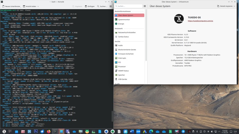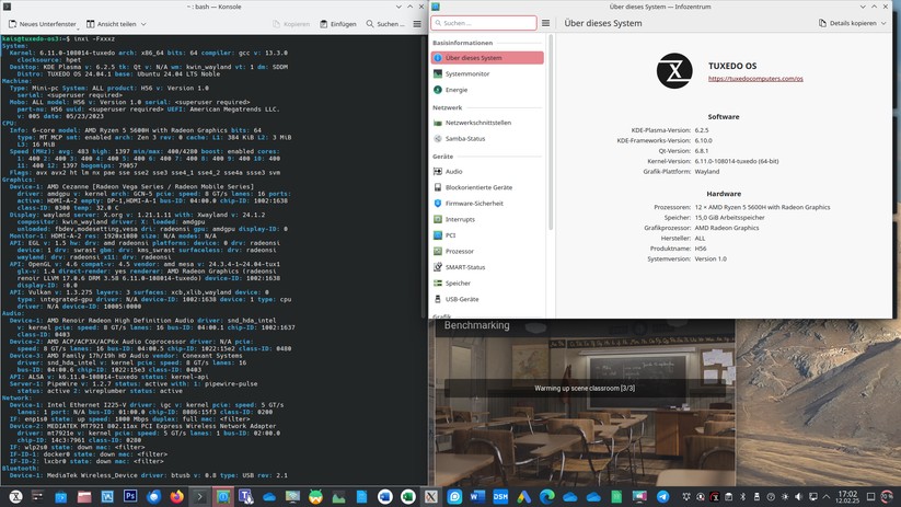 Auch der Betrieb von Linux ist möglich, wir haben das System mit dem auf Ubuntu basierenden Tuxedo OS ausprobiert. Dazu muss man zunächst die Bootreihenfolge im BIOS ändern, die sich via F7-Taste oder über die erweiterten Wiederherstellungsoptionen von Windows abrufen lässt. Secure Boot ist bereits ab Werk deaktiviert und macht insofern keine Probleme. Nach Auswahl des USB-Sticks als Bootmedium bootet das System in Tuxedo OS, das wir nach kurzer Einrichtung nutzen können. Dabei funktionieren WLAN, Bluetooth und Audio ordnungsgemäß und auch die Bildschirmauflösung wird richtig erkannt. Das Aufwecken aus dem Standby-Modus gelingt ebenfalls, was nicht erwartbar ist – einige Mini-PCs haben hier Probleme mit Linux.
