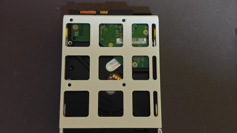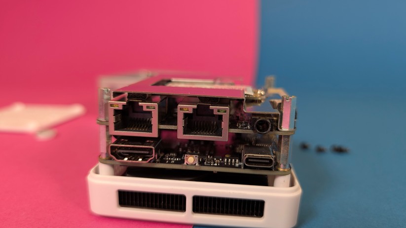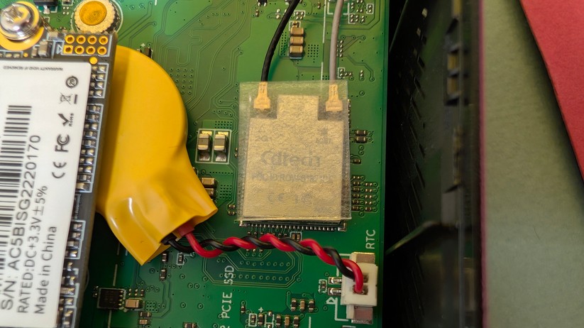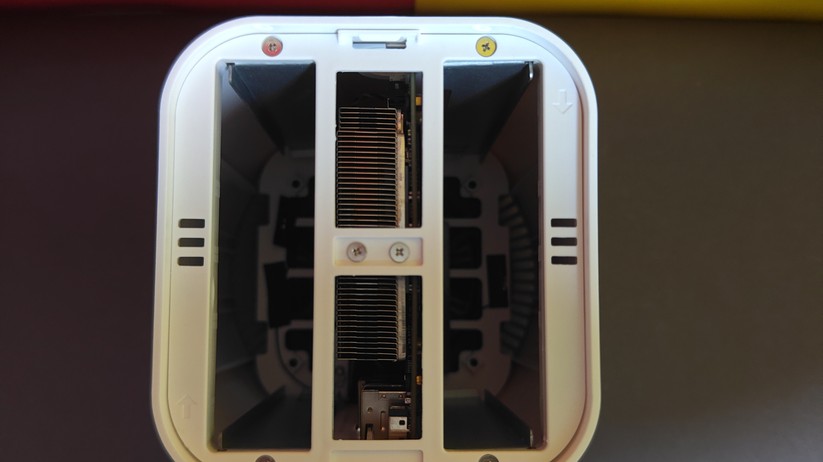 Auch die Gehäuseöffnung gelingt gut, trotz des kleinen Formfaktors sind die Bauteile schnell erreichbar. Dazu gehören SSD, Netzwerkkarte sowie die CMOS-Batterie. Sie erreicht man, indem man den Kunststoffdeckel auf der Unterseite nach dem Lösen von vier Schrauben abnimmt. Das geht sehr einfach, der Deckel muss nicht noch umständlich aufgehebelt werden, sondern kommt einem freiwillig entgegen. Aufpassen muss man mit dem nur lose eingelegten Ein-/Aus-Knopf, den man entsprechend schnell verlieren kann. Nach dem Abnehmen des Deckels muss man noch den Aluminiumring von den Anschlüssen streifen. Anschließend findet man die Hardware auf zwei übereinander geschraubten Platinen vor, die man voneinander lösen kann. SSD und WLAN-Karte finden sich dabei auf der unteren Seite, sind aber zusätzlich von einer Metallabdeckung geschützt, die man erst abnehmen muss.