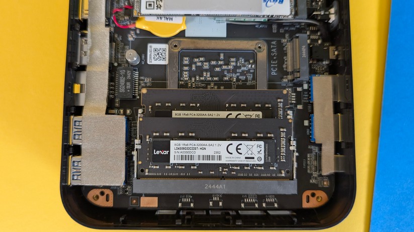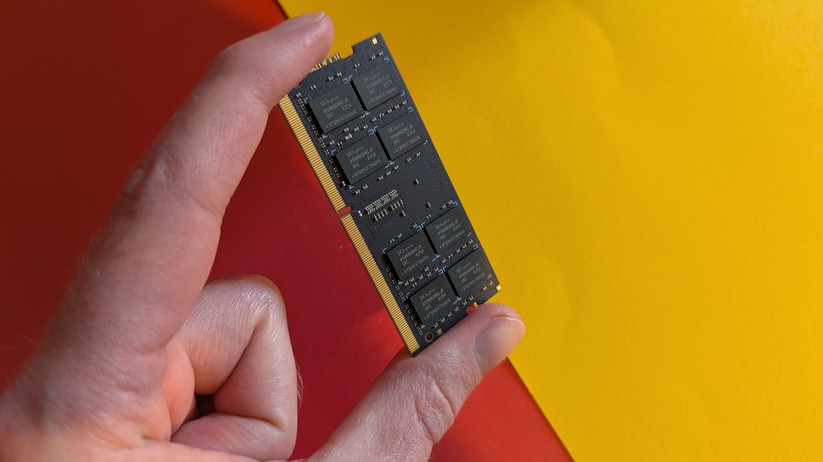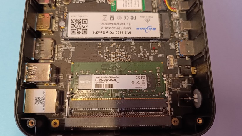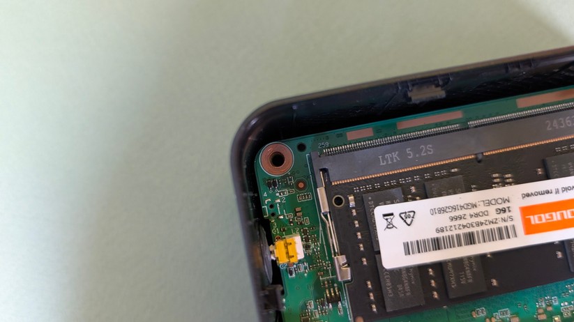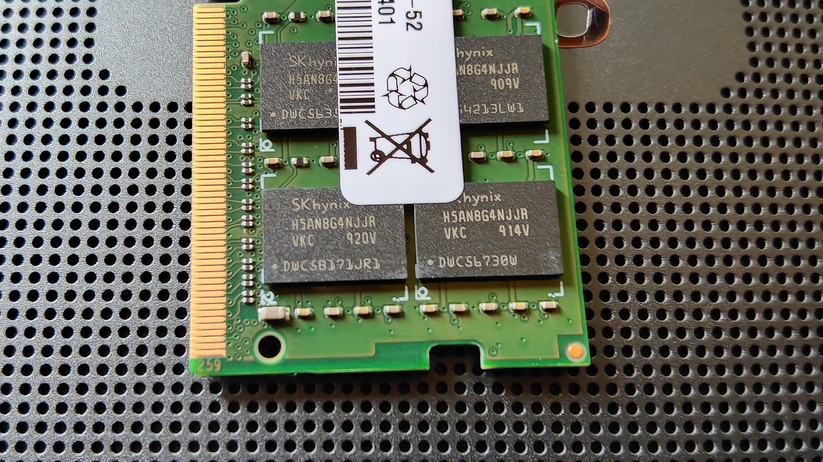 Der 16 GB große RAM kommt in Form eines SO-DIMM-Moduls, das nach DDR4-Standard arbeitet. Der zweite RAM-Slot ist unbelegt. Ab Werk wird also nur einer der zwei Speicherkanäle des Ryzen 5 verwendet. Mit 3200 MT/s läuft der Arbeitsspeicher bereits mit der maximal unterstützten Geschwindigkeit. Die Gesamtkapazität liegt bei 64 GB über beide Slots.
