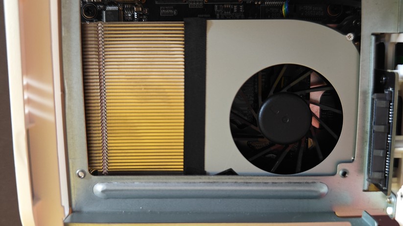 Besonders überzeugt hat uns die Lautstärke der Kühlung. Auch wenn die CPU unter Volllast warm wird, bleibt der Lüfter mit maximal 30 dB am Gehäuse sehr leise. Dennoch muss man hier festhalten, dass es sich hier nur um eine 35-Watt-CPU handelt, die unter Volllast schnell heruntertaktet und sich die meiste Zeit nur 20 Watt genehmigt. Bei einer Entfernung von einem Meter ist die Lautstärke nicht mehr sinnvoll messbar (<25 dB). Im Idle ist der Lüfter immer aus.