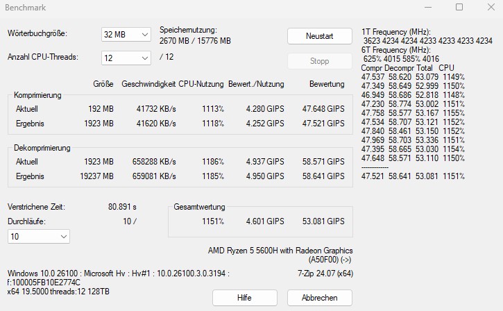 Der Ryzen 5 7430U ist eine bei Budget-Mini-PCs erst seit kurzem zum Einsatz kommende CPU, an sich gibt es sie aber bereits seit Ende 2023. Hier bekommt man 6 Kerne und 12 Threads durch SMT (Simultaneous Multithreading) bei maximal 4,3 GHz. Hier handelt es sich jedoch weiterhin „nur“ um die Zen-3-Architektur – genauer um ein Refresh – welche AMD also vereinfacht gesagt neu aufgelegt, etwas anders konfiguriert und die Taktrate minimal angehoben hat. Die Chip-Architektur entspricht also der des verbreiteten Ryzen 7 5800U. Die TDP (Thermal Design Power) ist konfigurierbar zwischen 10 und 25 W, 15 W ist hier der Standard. Die Grafikeinheit ist weiterhin „nur“ die Radeon RX Vega 7 mit 7 Kernen und einem Takt von 1800 MHz – also keine Radeon 680M oder gar 780M, wie bei den wirklich neuen CPUs der 7000er-Serie.