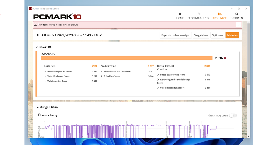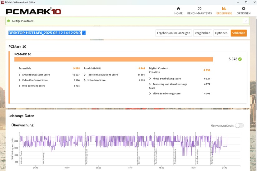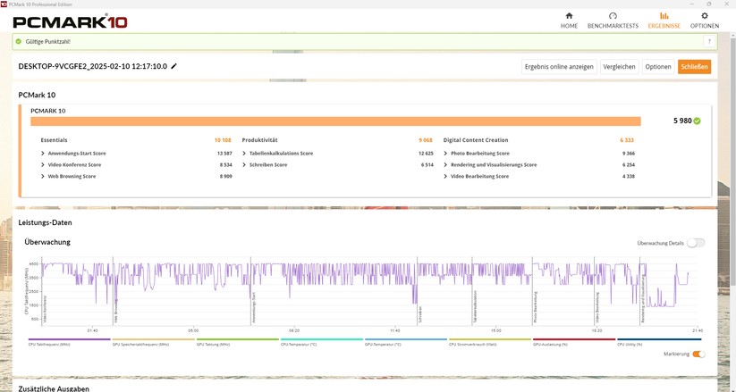 Der Intel Core i5 12450H ist vorwiegend für die Office-Nutzung gedacht. Dass er dort wirklich gut abliefert, zeigt PCmark 10, wo der i5 zwischen 5022 und 5224 Punkten erzielt. Der Gaming-Benchmark 3Dmark Time Spy zeigt dann die Grenzen des Systems auf. Hier schafft es der CK10 auf nur 981 Punkte, davon 5633 CPU- und 857 Grafikpunkte. Vergleichbare AMD-Systeme erzielen bei der Grafik noch einmal knapp 150 Punkte mehr.
