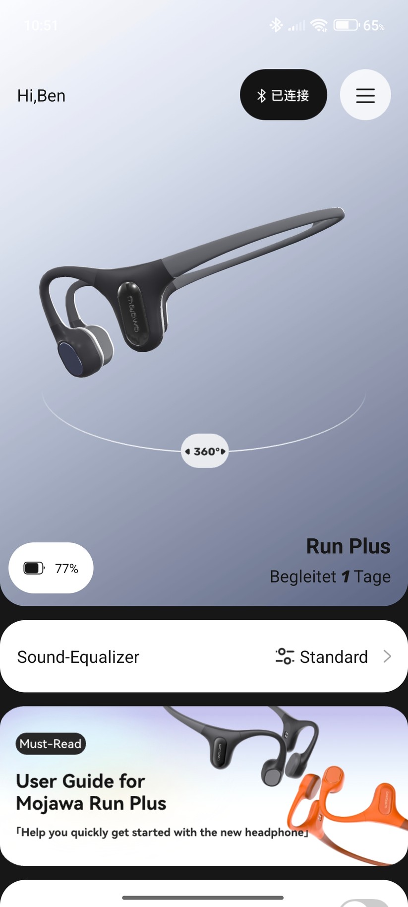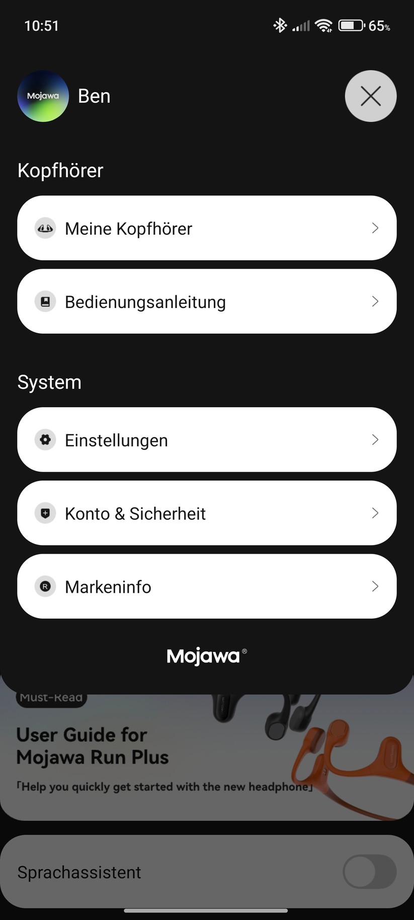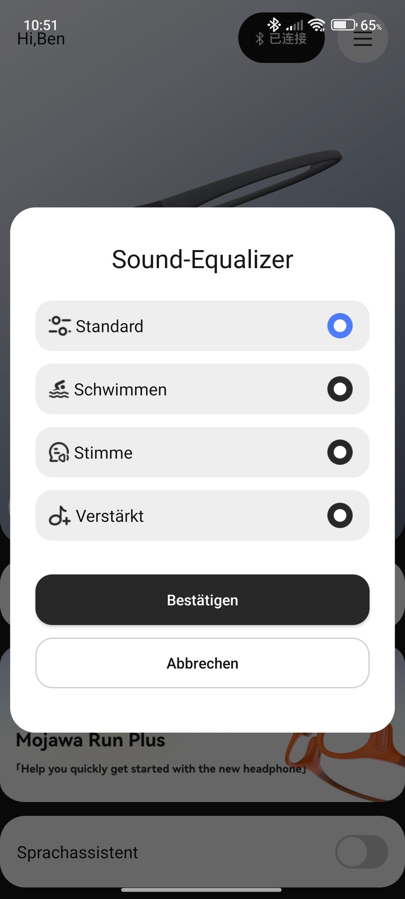 Nach der Kopplung mit dem Smartphone wird der Mojawa Run Plus zuverlässig von der Begleit-App erkannt, die allerdings bei unserem Android-Gerät nur Probleme macht und schlicht nervt. Zum einen gibt es einen Registrierungszwang. Zum anderen reagiert die App enorm träge, hängt sich bei uns regelmäßig auf und ein Firmware-Update war auch nach dem zehnten Versuch einfach nicht möglich. Über ein iOS-Gerät gelang das Update schließlich. Auf iOS läuft die App auch ein wenig zuverlässiger. Grundsätzlich hat sie jedoch kaum etwas zu bieten. Hier können lediglich die Sprache der Kopfhöreransagen (Englisch oder Chinesisch) geändert, der Sprachassistent aktiviert oder deaktiviert werden und es gibt vier Sound-Presets auszuwählen (Standard, Schwimmen, Stimme und Verstärkt). Ein individuelles Preset kann nicht angelegt werden.