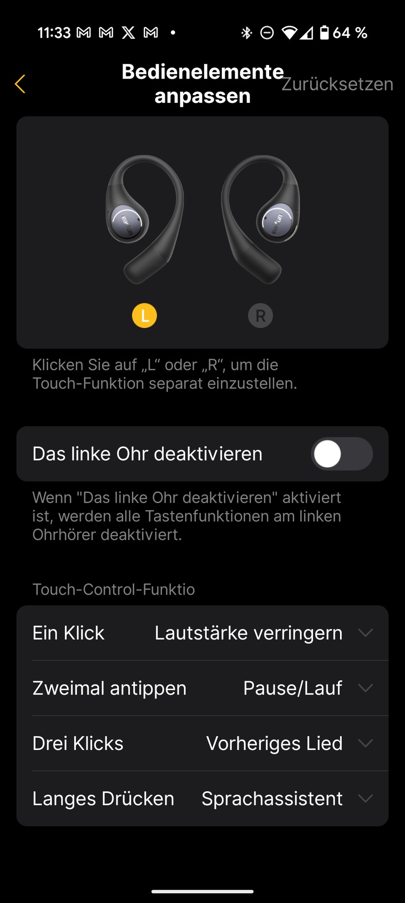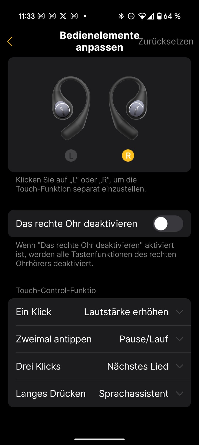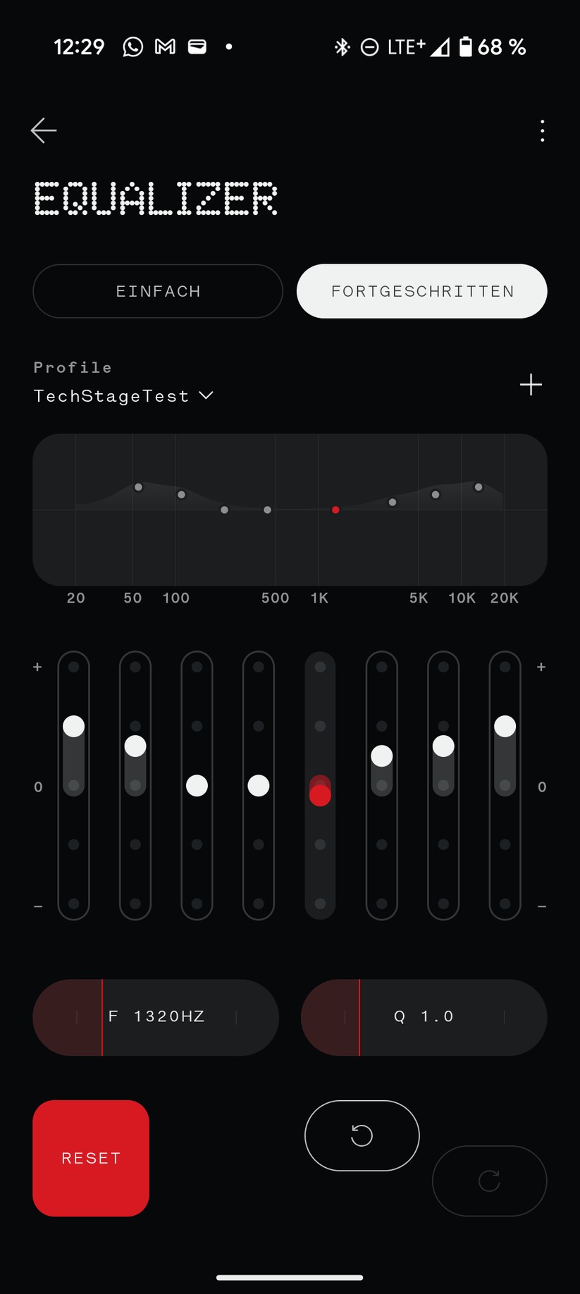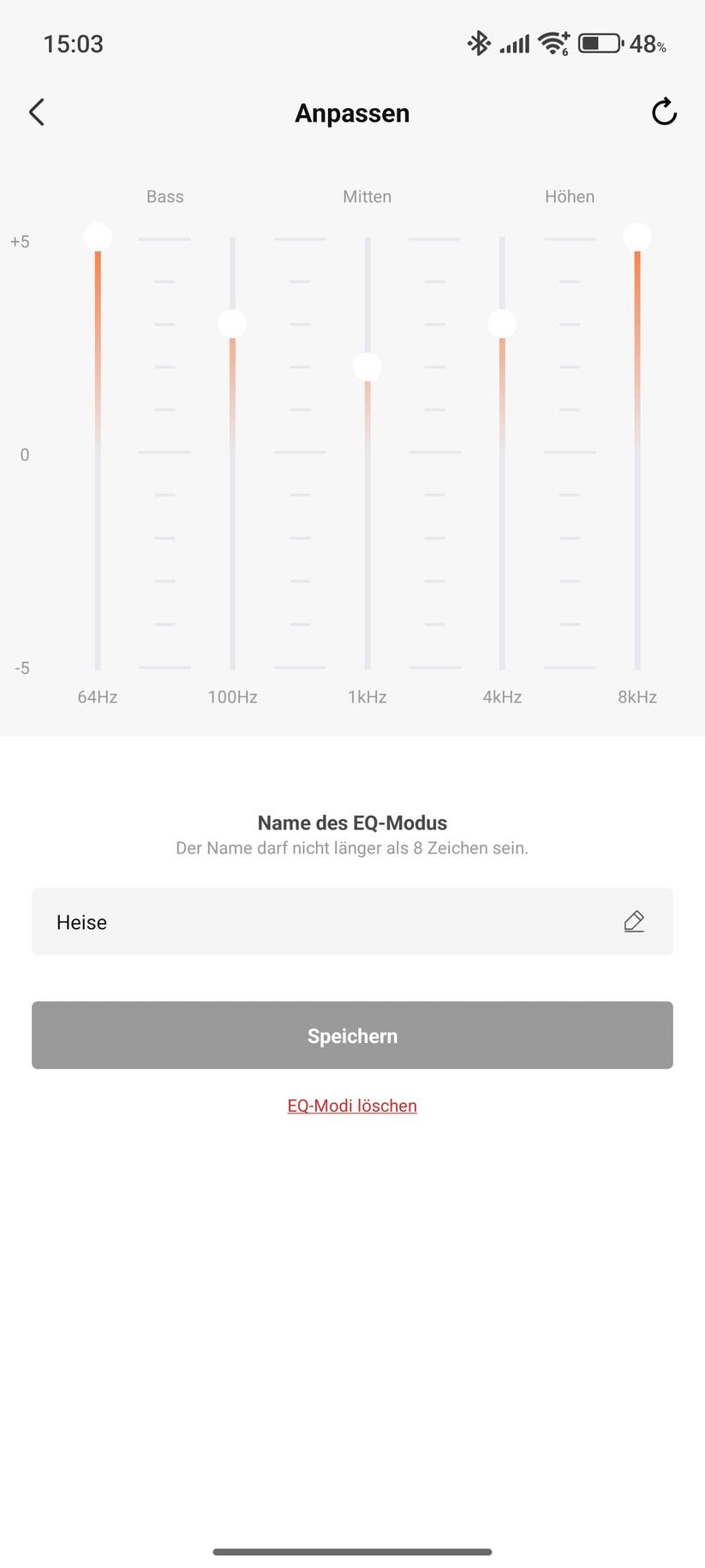 Die Steuerung erfolgt über eine Touch-Oberfläche an den Ohrteilen. Wir bevorzugen zwar physische Knöpfe oder eine Bedienung per Druck. Die umfangreiche App erlaubt die vollständige, individuelle Belegung der Touch-Gesten – für viele ein wichtiges Feature. Zudem gibt es einen umfangreichen Equalizer mit vielen Presets. Wer möchte, kann im benutzerdefinierten 8-Band-Equalizer auch eigene Einstellungen vornehmen und speichern.