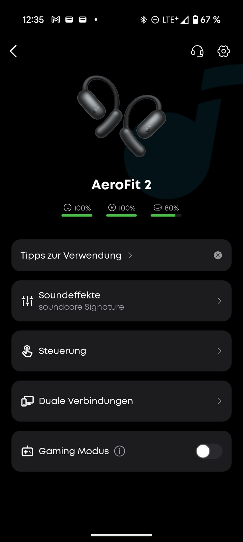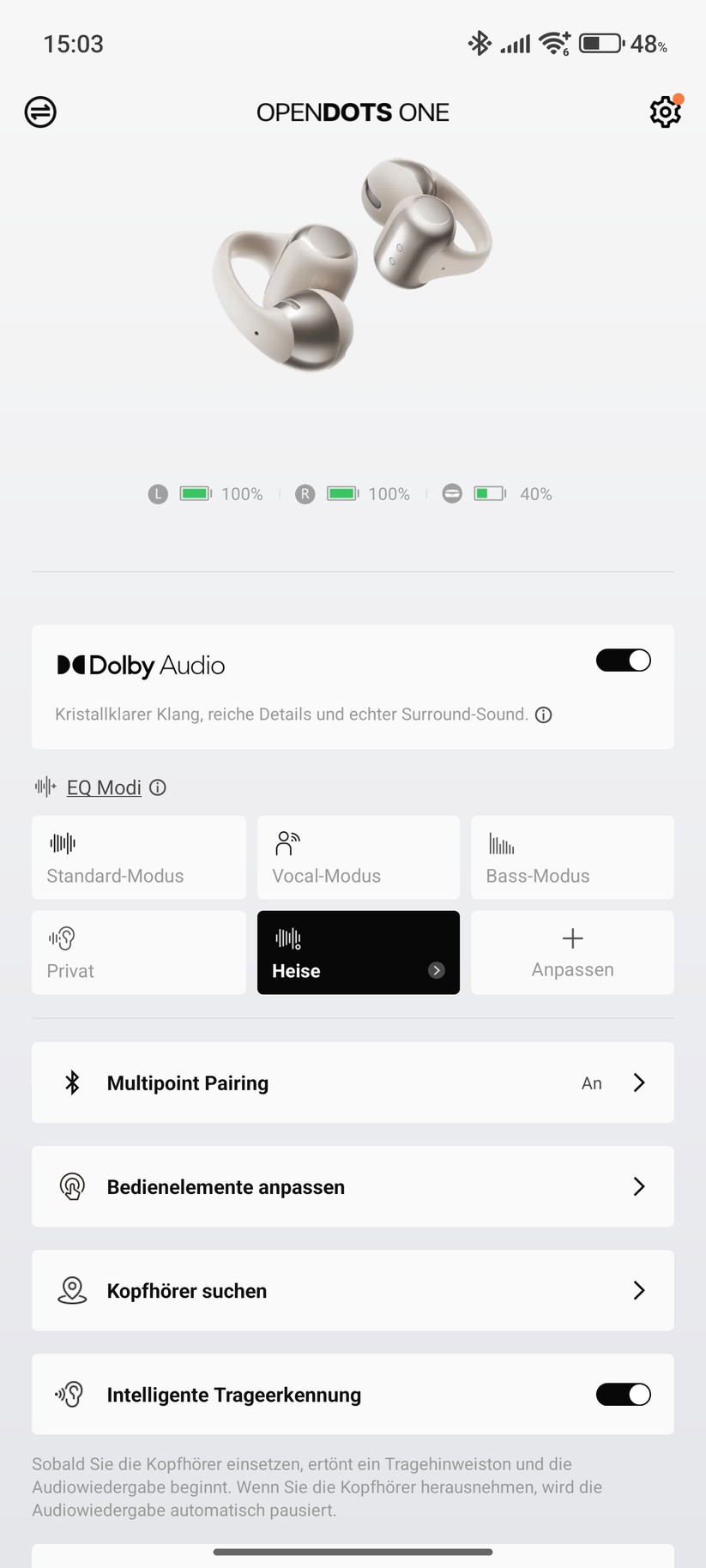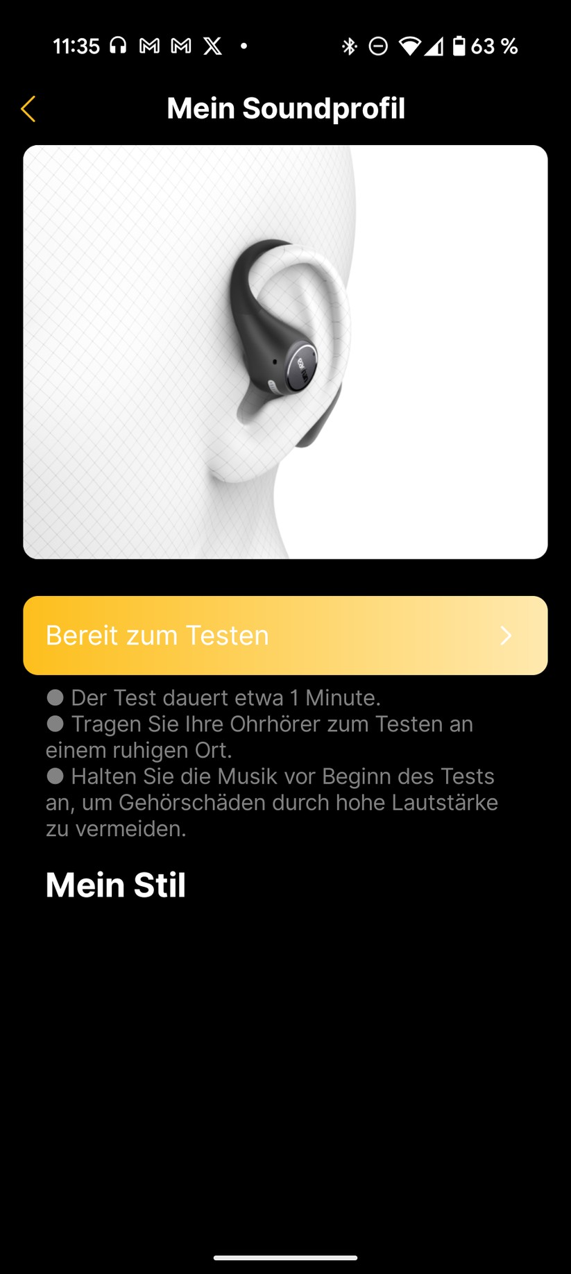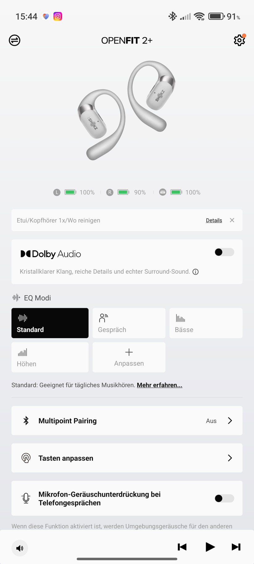 Wird Dolby Audio aktiviert, sofern vom Smartphone unterstützt, bekommt die Musik hörbar mehr Raum und Details. Bei der Bass-Performance zeigen die Niederfrequenz-Speaker ihre Wirkung. Je nach Song kann es etwas druckvoller werden. Das Niveau von ordentlichen Half-In-Ear- oder richtigen In-Ear-Modellen, die näher am Ohrkanal liegen, wird aber nicht ganz erreicht. Das war auch zu erwarten. Im reinen Open-Ear-Segment zählt die Bass-Performance der OpenFit 2+ aber zu den besten am Markt.