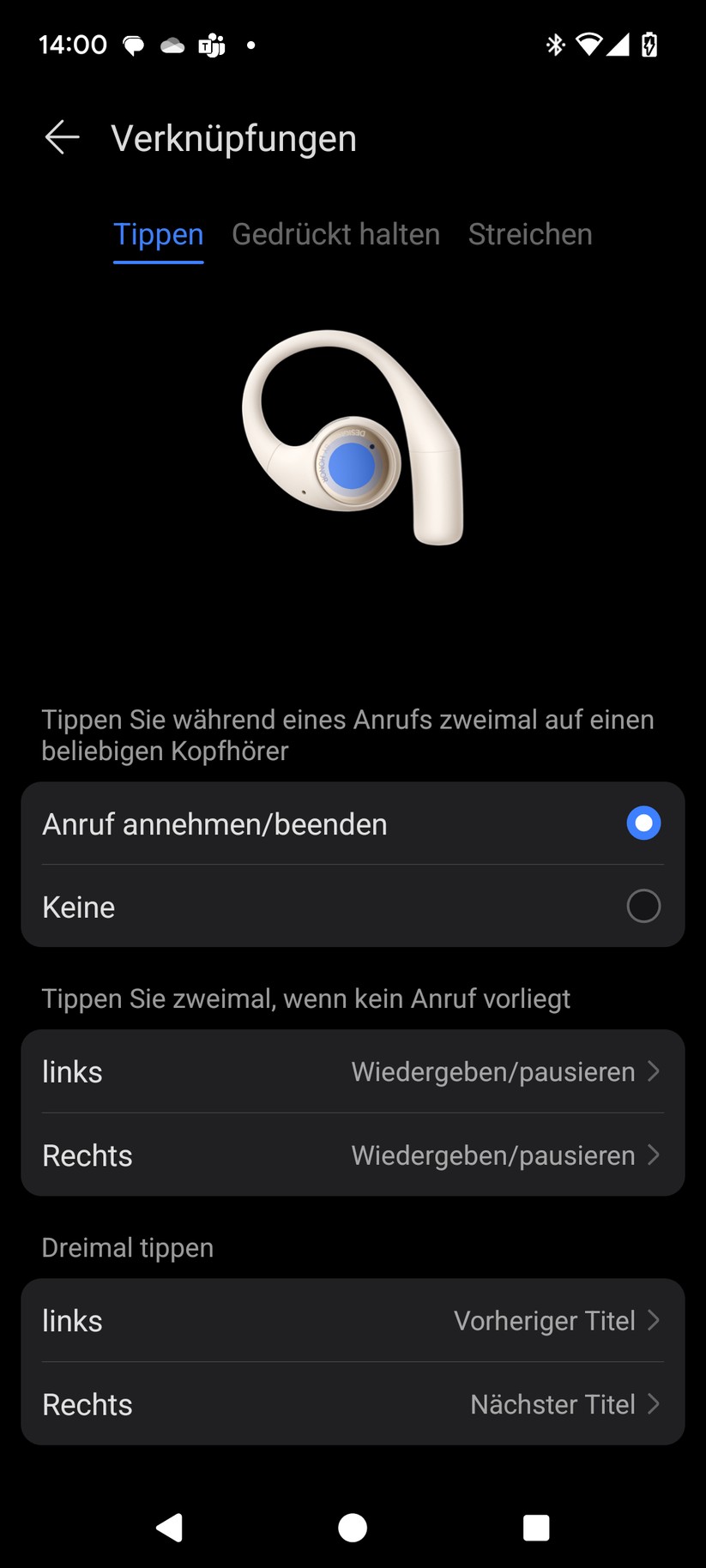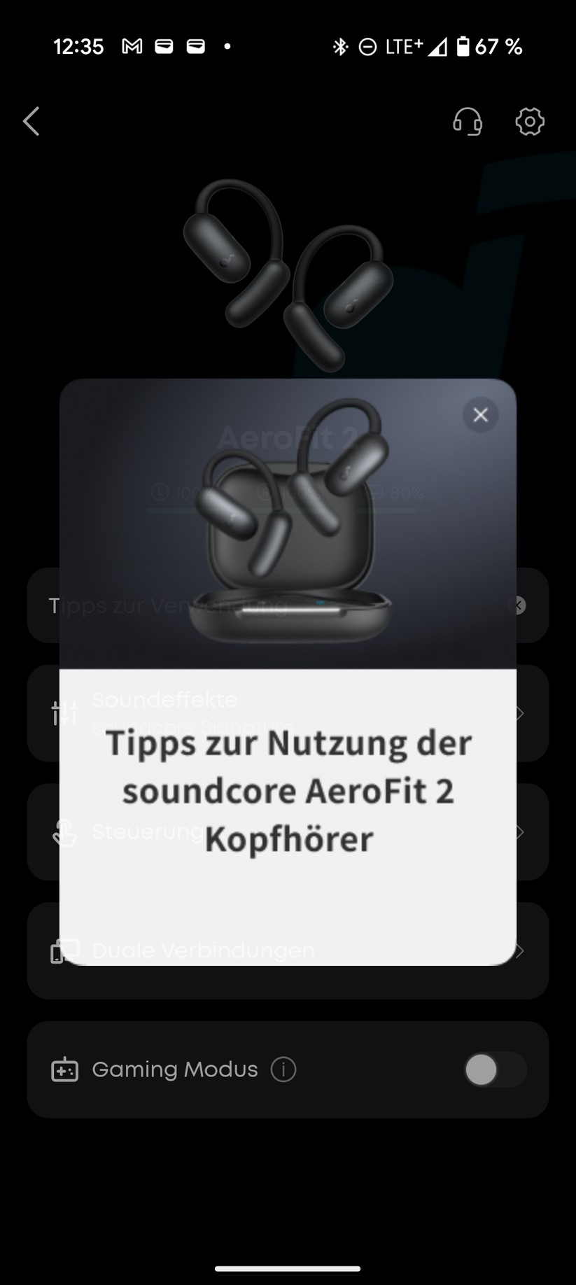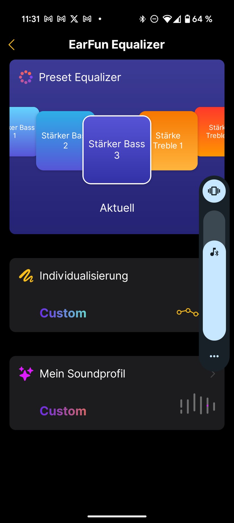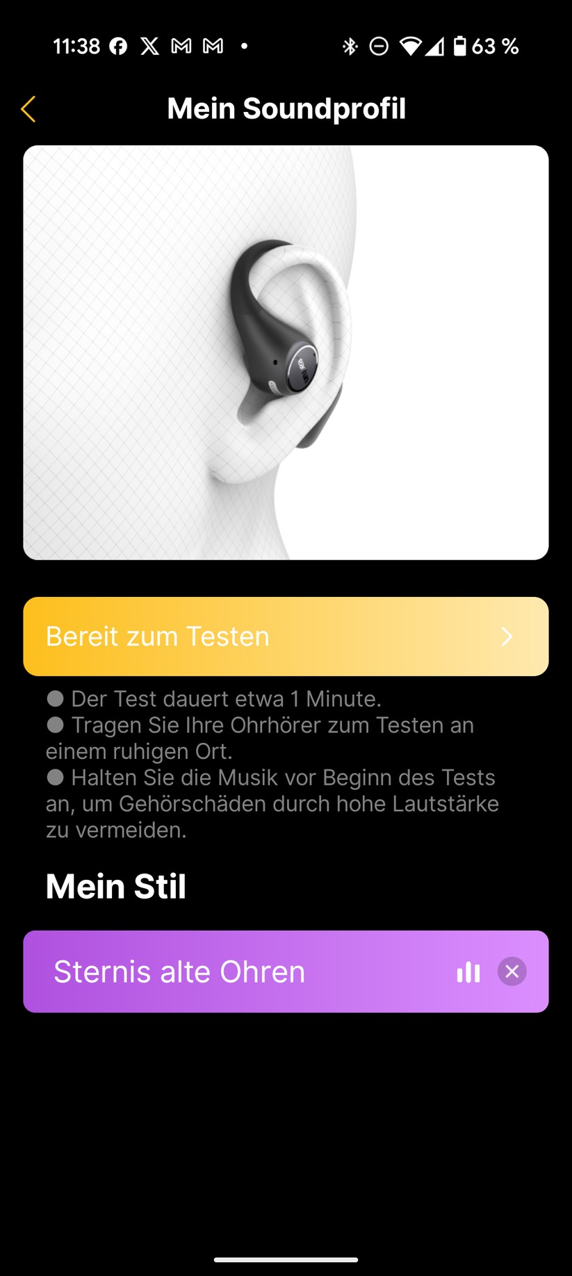 Wird Dolby Audio aktiviert, sofern vom Smartphone unterstützt, bekommt die Musik hörbar mehr Raum und Details. Bei der Bass-Performance zeigen die Niederfrequenz-Speaker ihre Wirkung. Je nach Song kann es etwas druckvoller werden. Das Niveau von ordentlichen Half-In-Ear- oder richtigen In-Ear-Modellen, die näher am Ohrkanal liegen, wird aber nicht ganz erreicht. Das war auch zu erwarten. Im reinen Open-Ear-Segment zählt die Bass-Performance der OpenFit 2+ aber zu den besten am Markt.