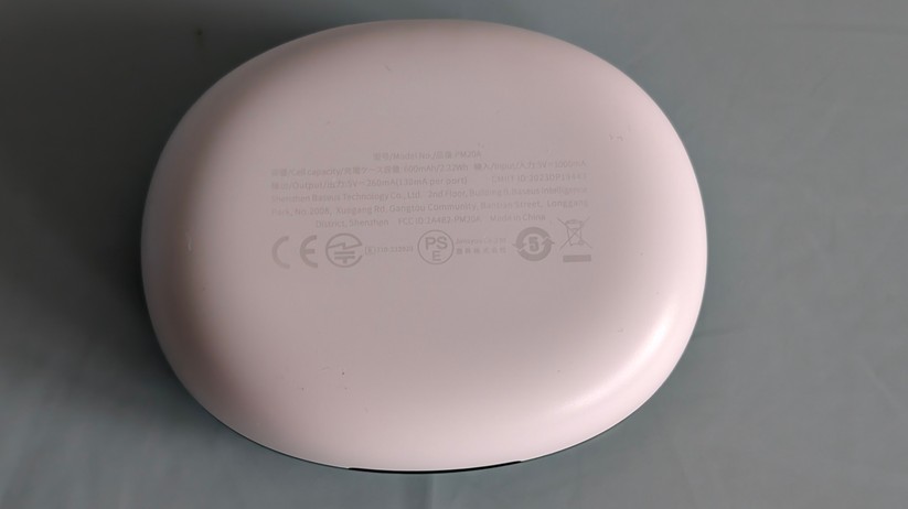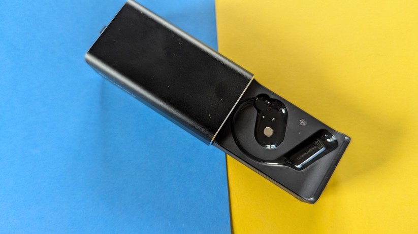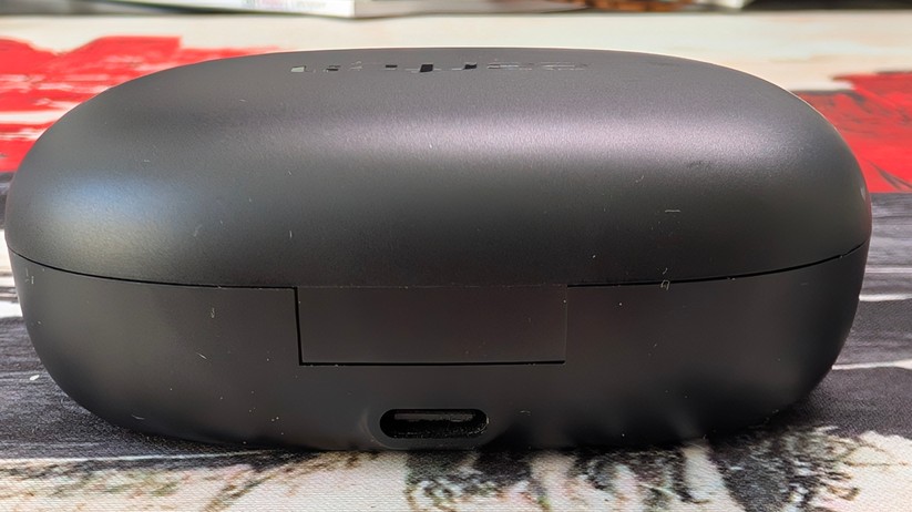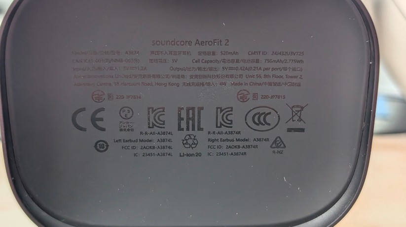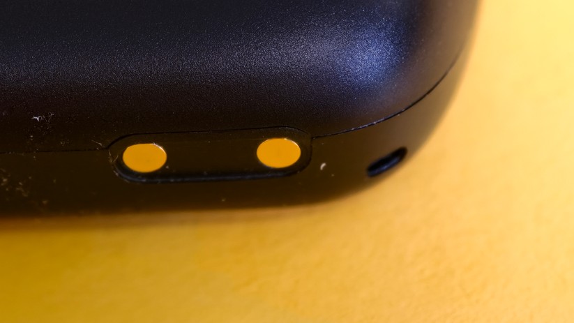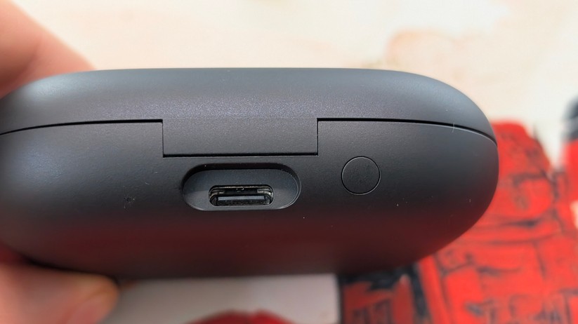 Die Verarbeitung der Aerofit 2 macht einen hochwertigen Eindruck, was auch die IP55-Zertifizierung bestätigt. Das Ladecase ist vergleichsweise dick und schwer. In unserem Fall ist es mattschwarz, Fingerabdrücke sind darauf nicht zu sehen. An der Rückseite befinden sich der USB-C-Ladeanschluss und ein Knopf zum Aktivieren der Bluetooth-Verbindung. Der Kunststoffdeckel wirkt jedoch nicht besonders hochwertig, das Scharnier ist aus Kunststoff statt Metall gefertigt.