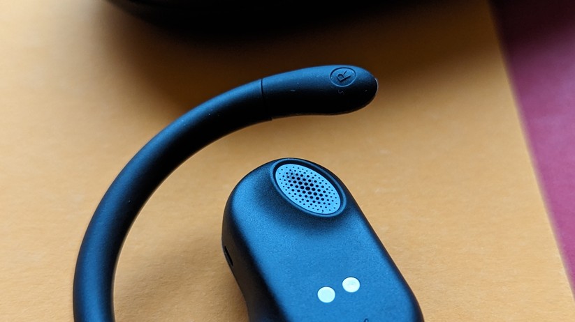 Das war es aber auch bei den Designentscheidungen, die wir beanstanden können – denn alles andere funktioniert ohne Probleme. Die Kopfhörer sind in schlichtem Schwarz gehalten, die flachen Seiten bieten Touch-Flächen. Die Ohrbügel selbst sind aus relativ weichem Gummikunststoff gefertigt und ausreichend flexibel. Insgesamt ist die Verarbeitung top, dank der Status-LED auf der Vorderseite des Cases wissen wir immer, wie voll der Akku des Kopfhörers aktuell ist. Der Sound wird durch je einen kleinen Lautsprecher pro Seite ins Ohr befördert, die Hörmuschel dient hierbei auch als Schallkörper.