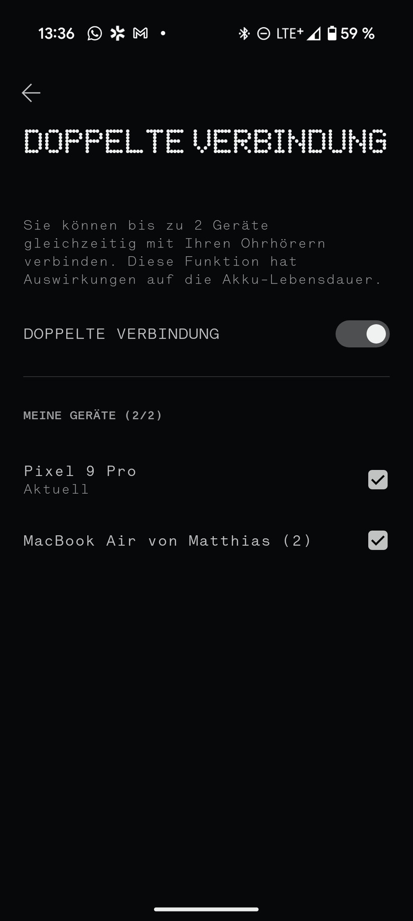 Die Shokz Openfit 2+ nutzen Bluetooth 5.4 (Vorgänger: 5.2) und unterstützen Multipoint für zwei gleichzeitige Geräteverbindungen – praktisch beim Wechsel zwischen Laptop und Smartphone. Bei den Codecs bleibt es bei SBC und AAC, ein Hi-Res-Codec fehlt weiterhin. Das Plus-Modell bietet zusätzlich Wireless Charging und Dolby Audio. Letzteres ist nur sinnvoll, wenn das Smartphone es unterstützt.